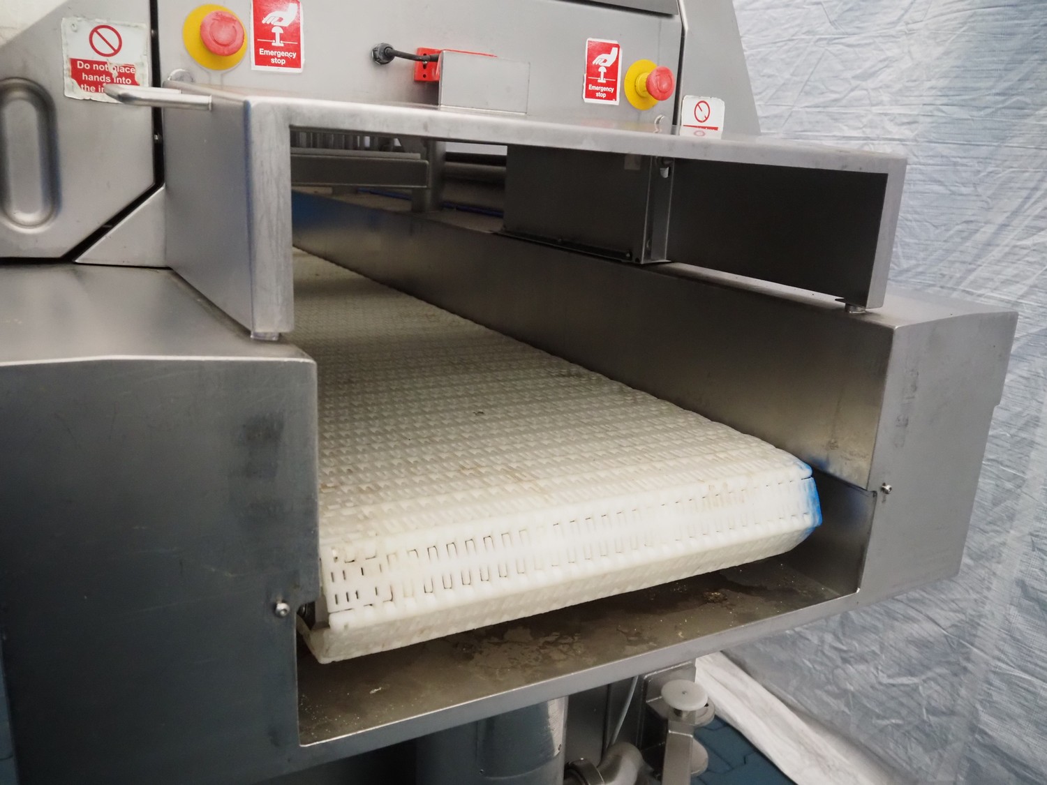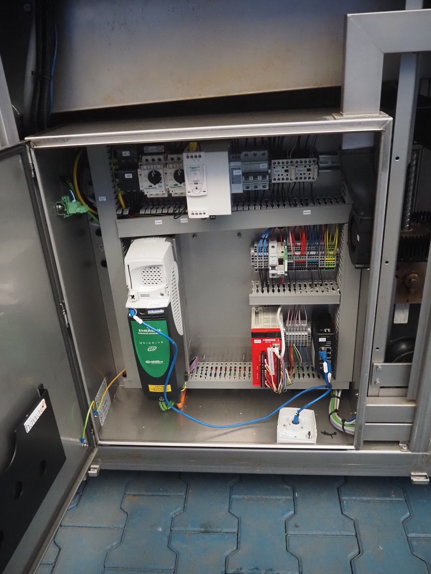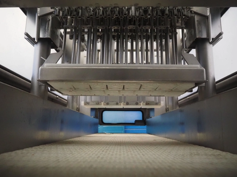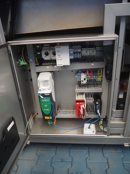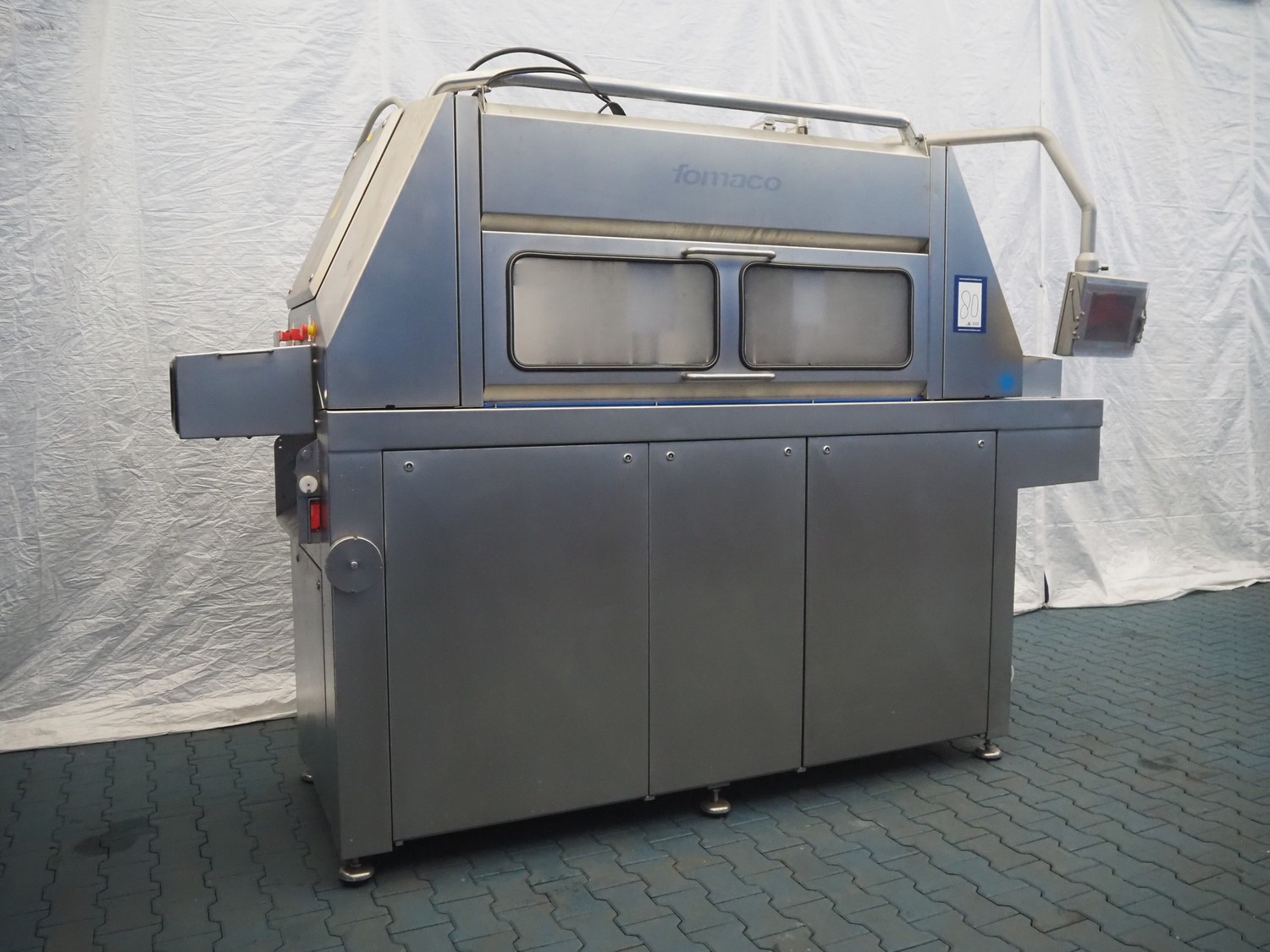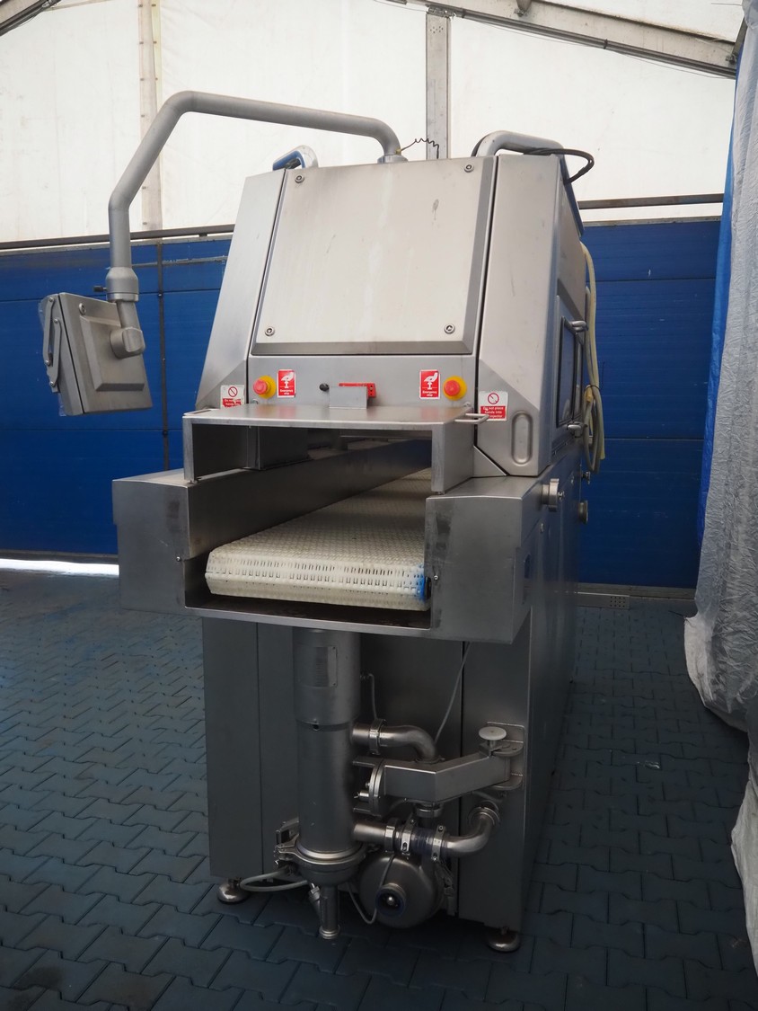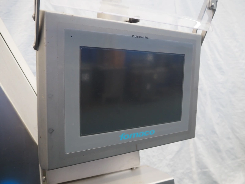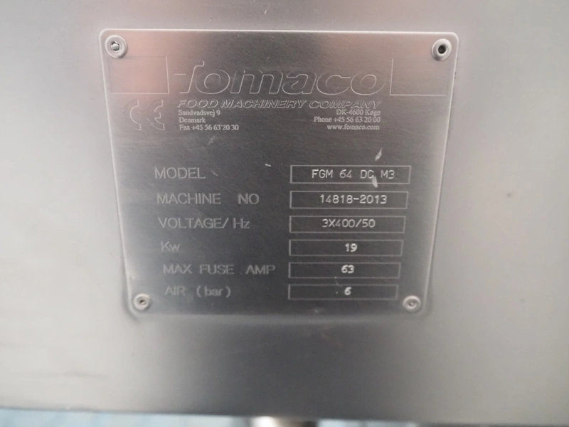 Fomaco injector, model: FGM 64 DC M3, serial number: 14818-2013, 400 V, 3 Ph, 50 Hz, 63 A, 19 kW, 6 bar, plastic mesh belt, belt width: 525 mm, total dimensions: 3200 mm x 1150 mm x 2500 mm. Incomplete.