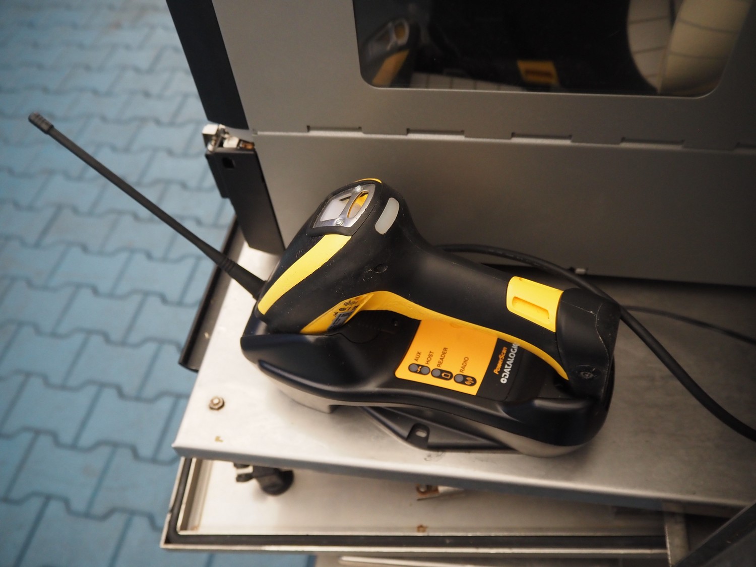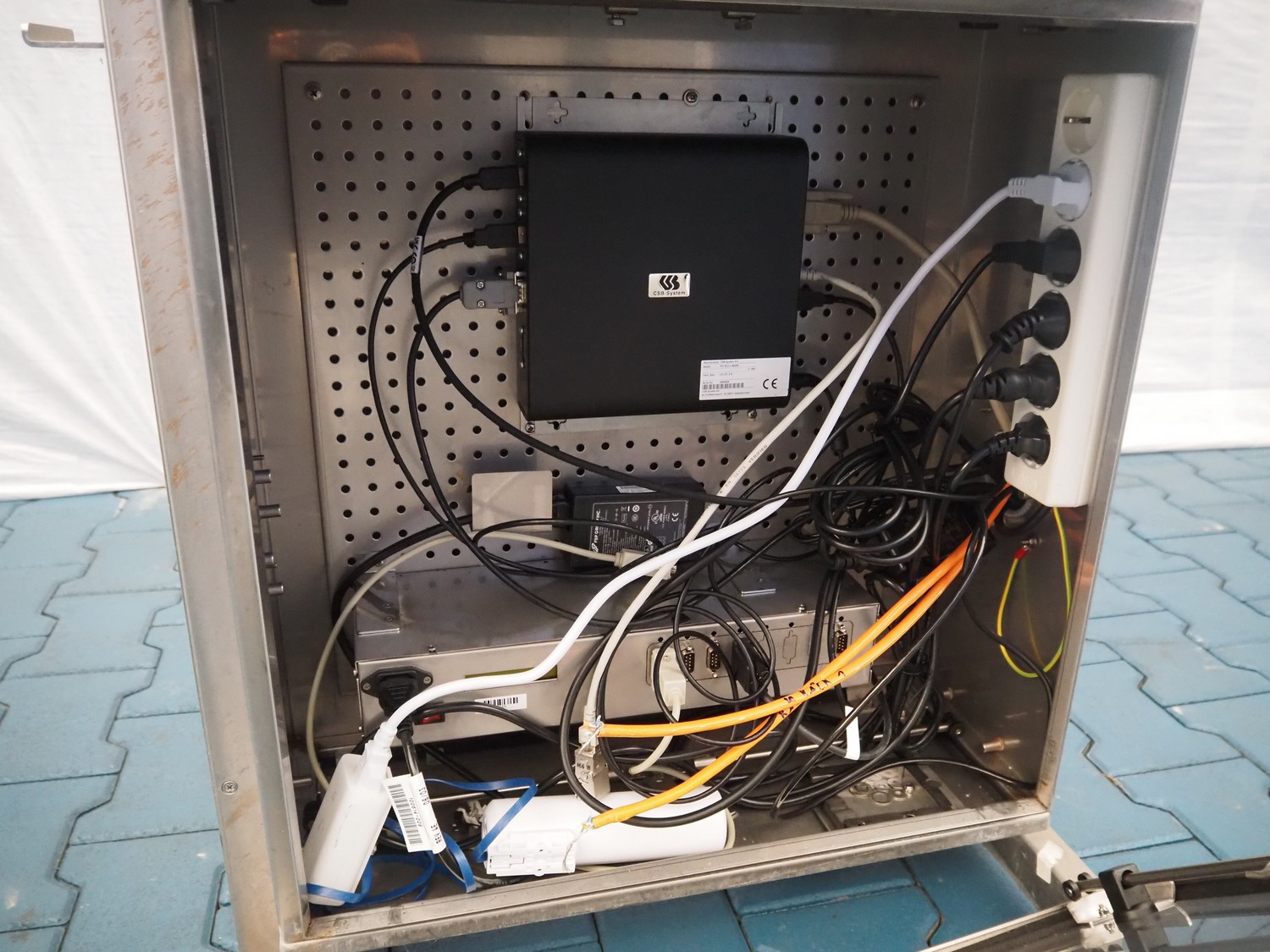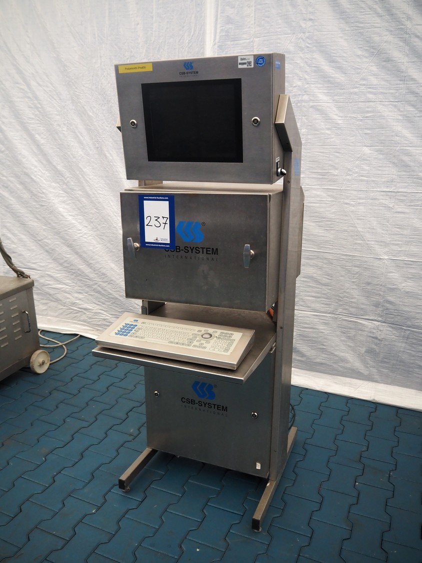 CSB System s/s mobile computer cabinet with Sato label printer, model cabinet: IPC Box, serial number: 18000500, 12 V, 5 A, model printer: CL4NX Plus, serial number: DL102844, 100-240 V, 50-60 Hz, 3.0 A, dimensions: 860 mm x 680 mm x 1740,