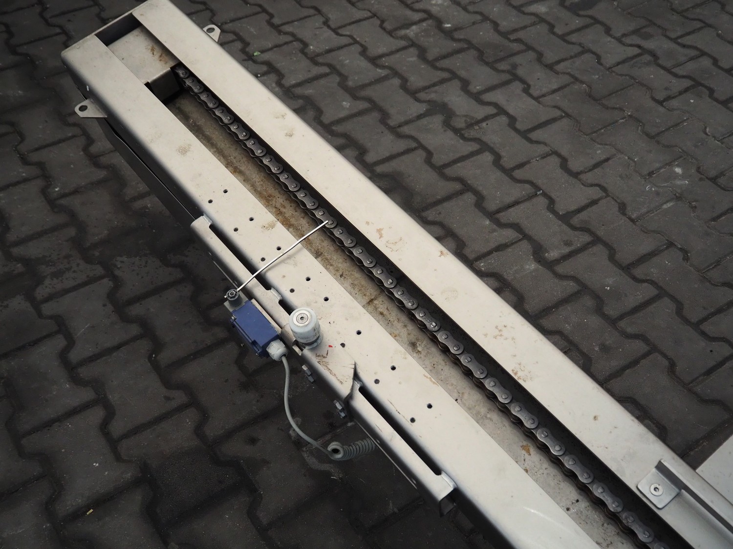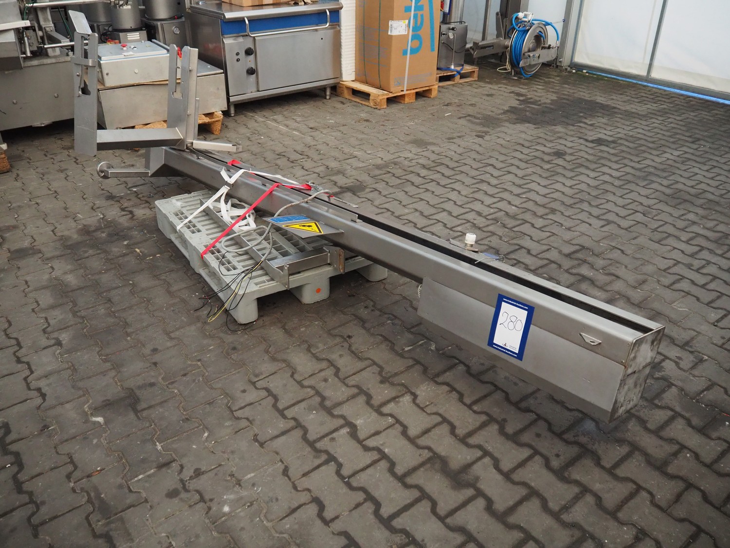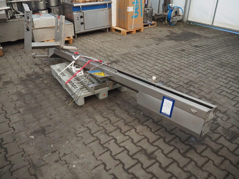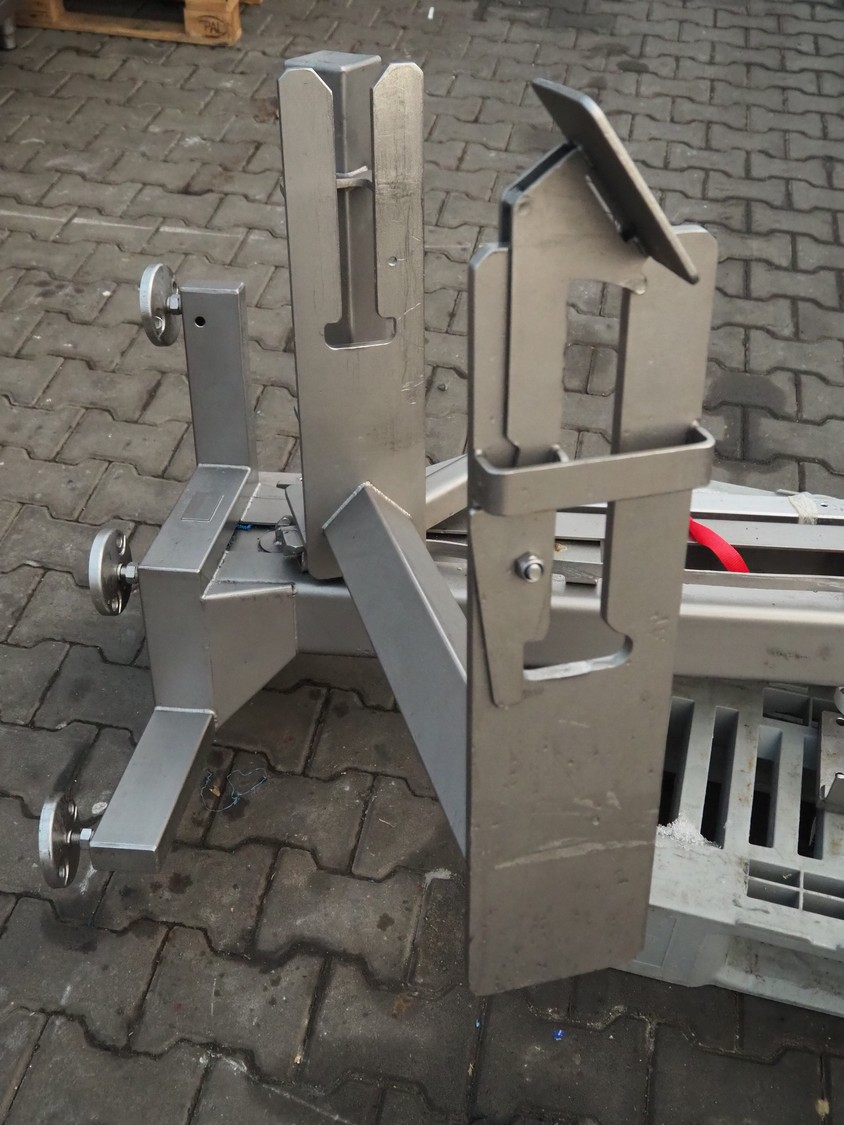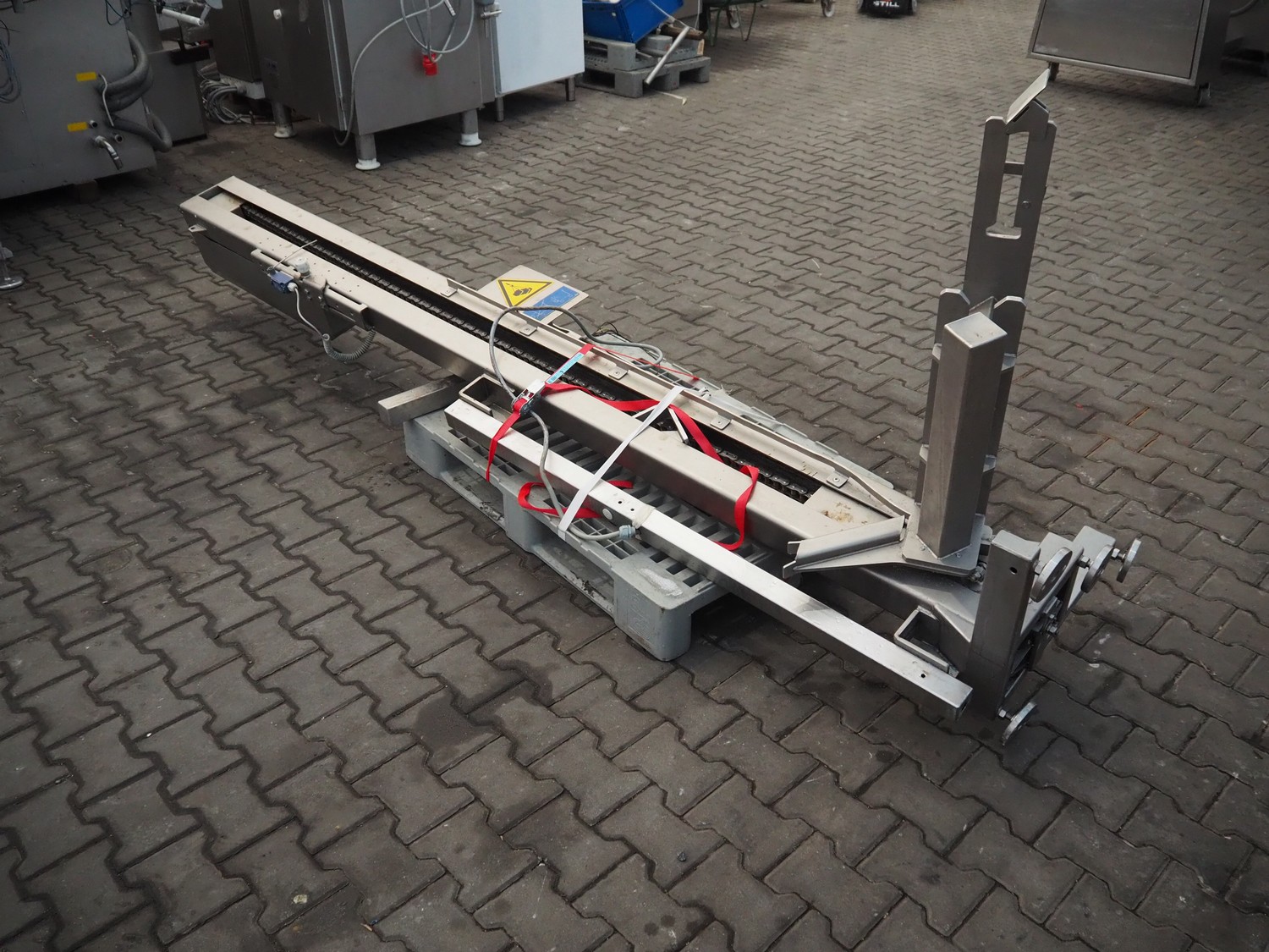 Lifter for meat bins, lifting height: 2400 mm, total dimensions: 3200 mm x 1100 mm x 1200 mm.