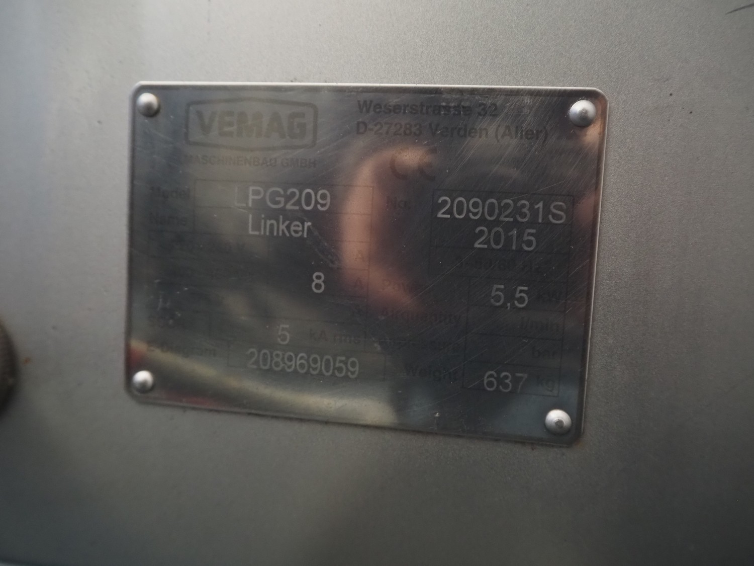 Vemag mobile linking machine, model linker: LPG209, number: 2090231S, year of construction: 2015, 400-460 V, 8 A, 5.5 kW, weight: 637 kg, dimensions: 1800 mm x 850 mm x 1500 mm.
