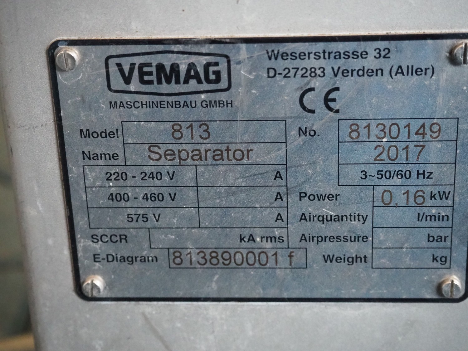 Vemag separator for bone particles, cartilage and sinews, model: 813, number: 8130149, year of construction: 2017, dimensions: 400 mm x 200 mm x 650 mm.