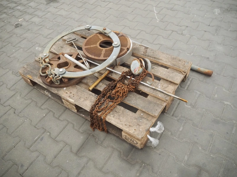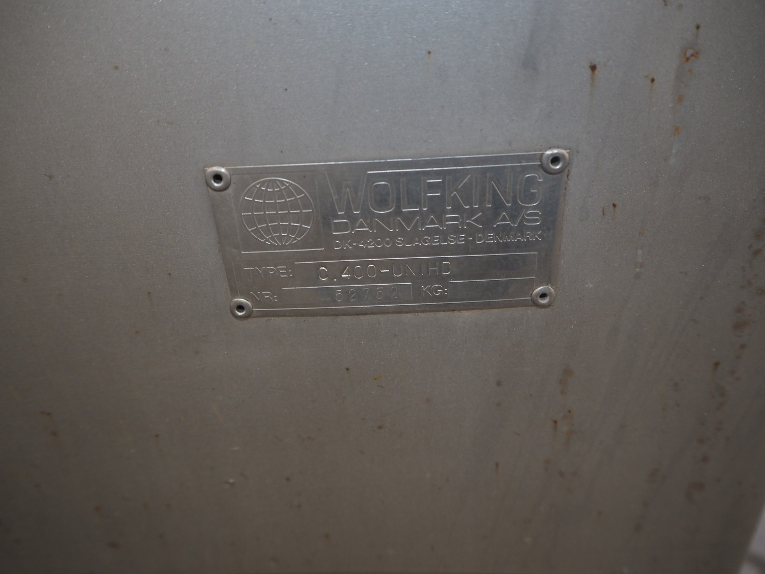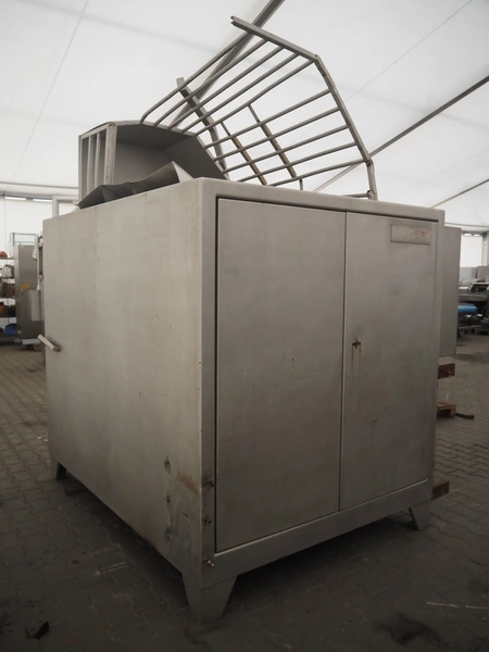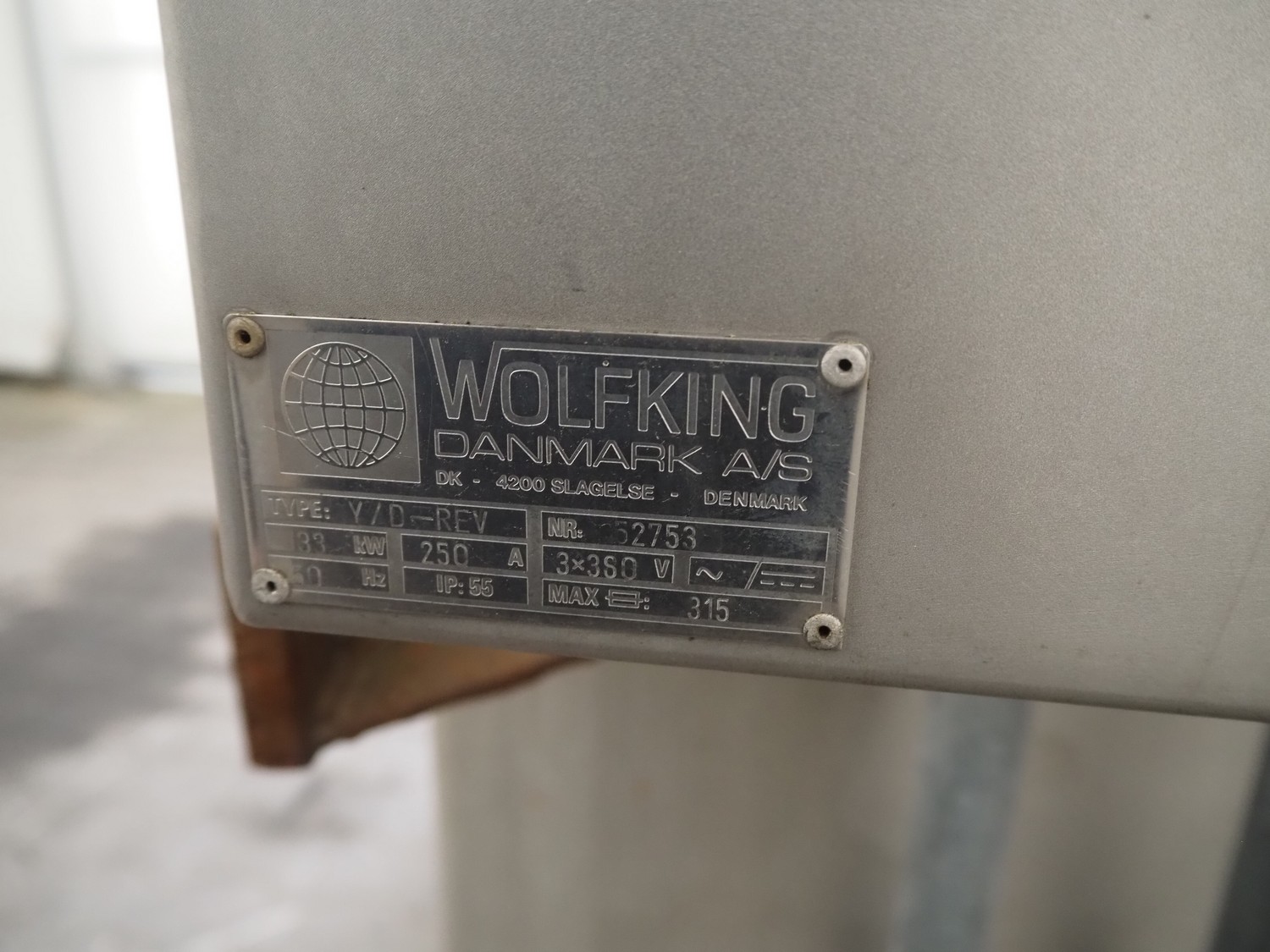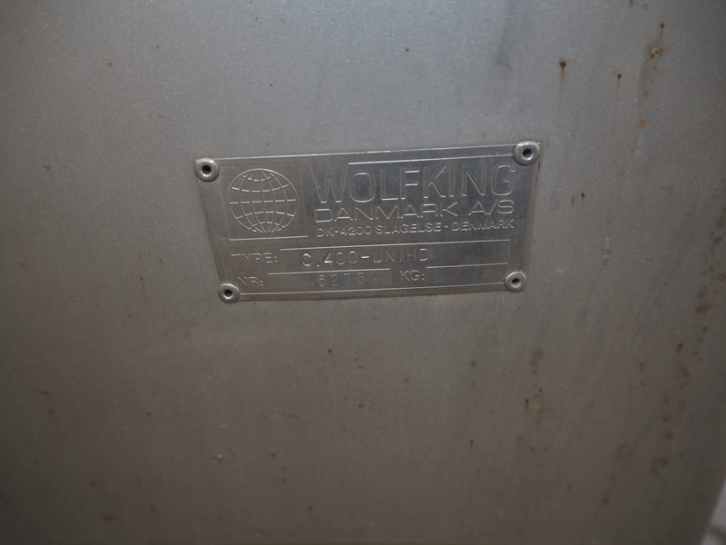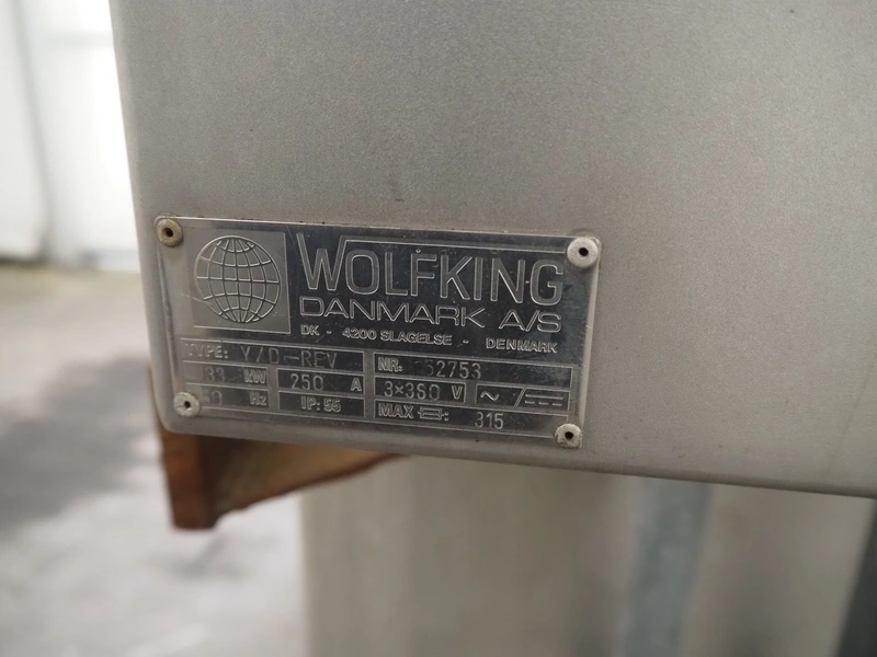 Wolfking frozen block grinder, type: Y/D-REV, serial number: 52753, 380 V, 3 Ph, 50 Hz, 250 A, 33 kW, plate diameter: 400 mm, total dimensions: 2700 mm x 1900 mm x 2800 mm. Including pallet with parts.