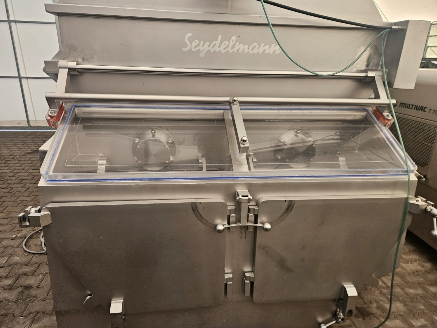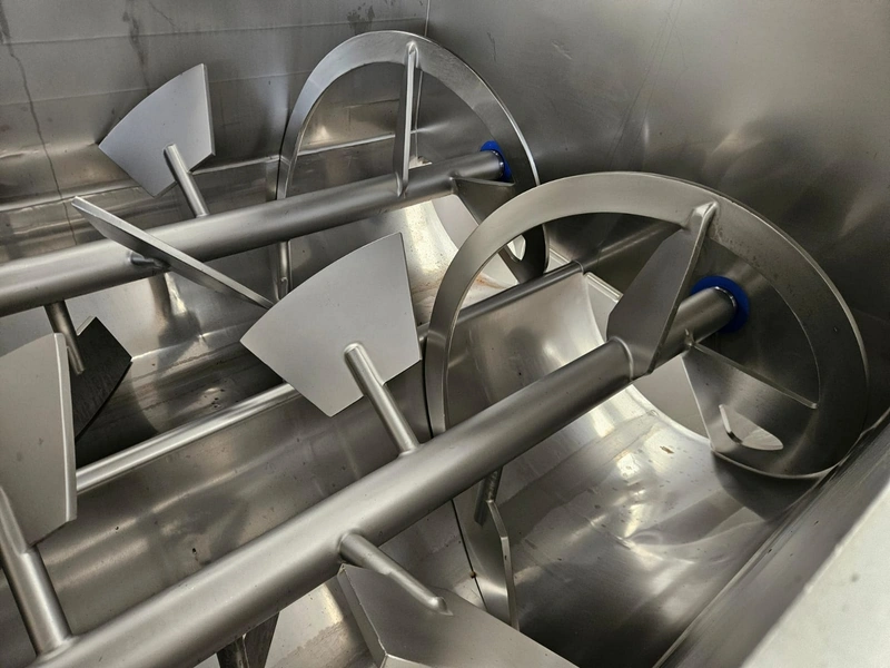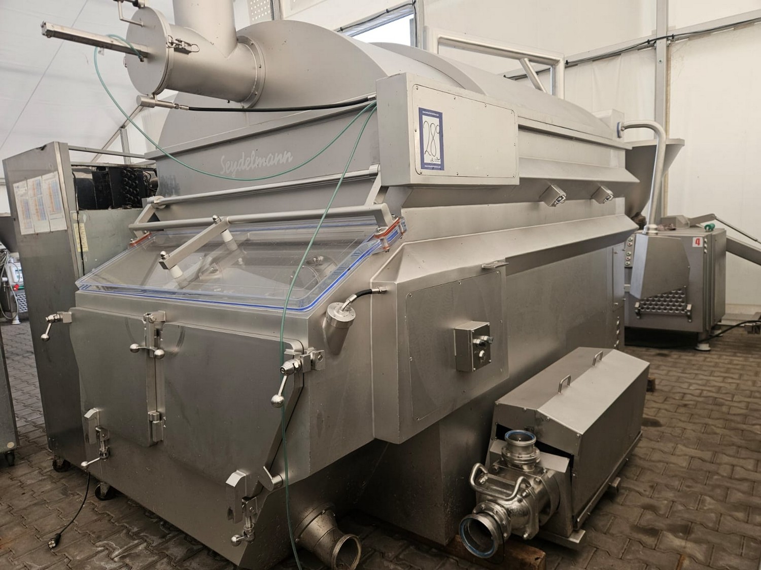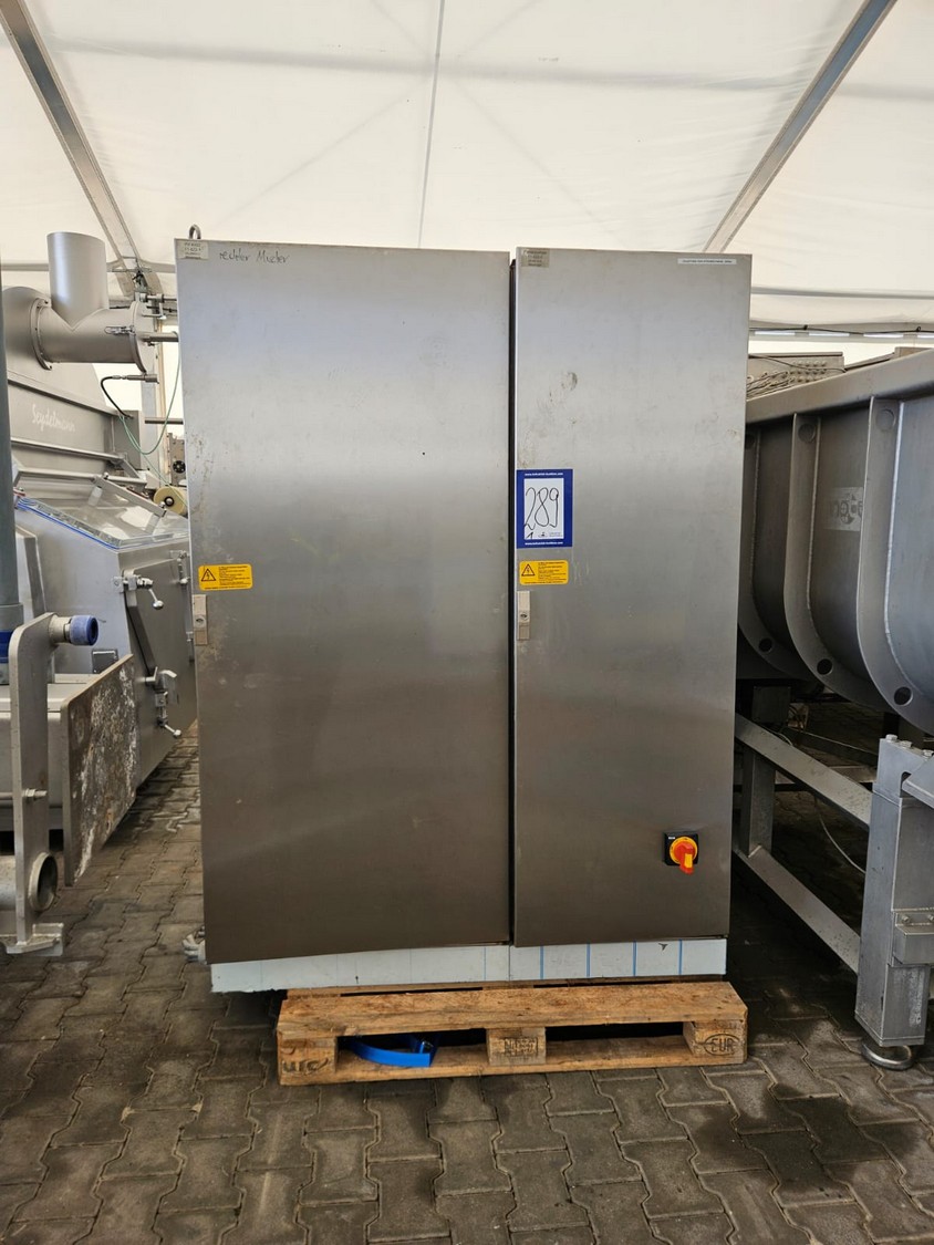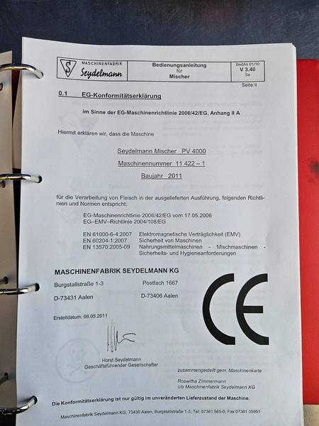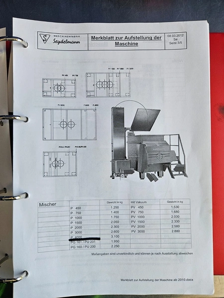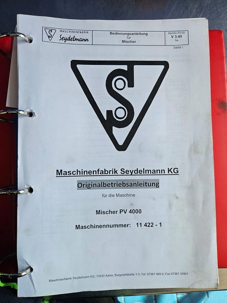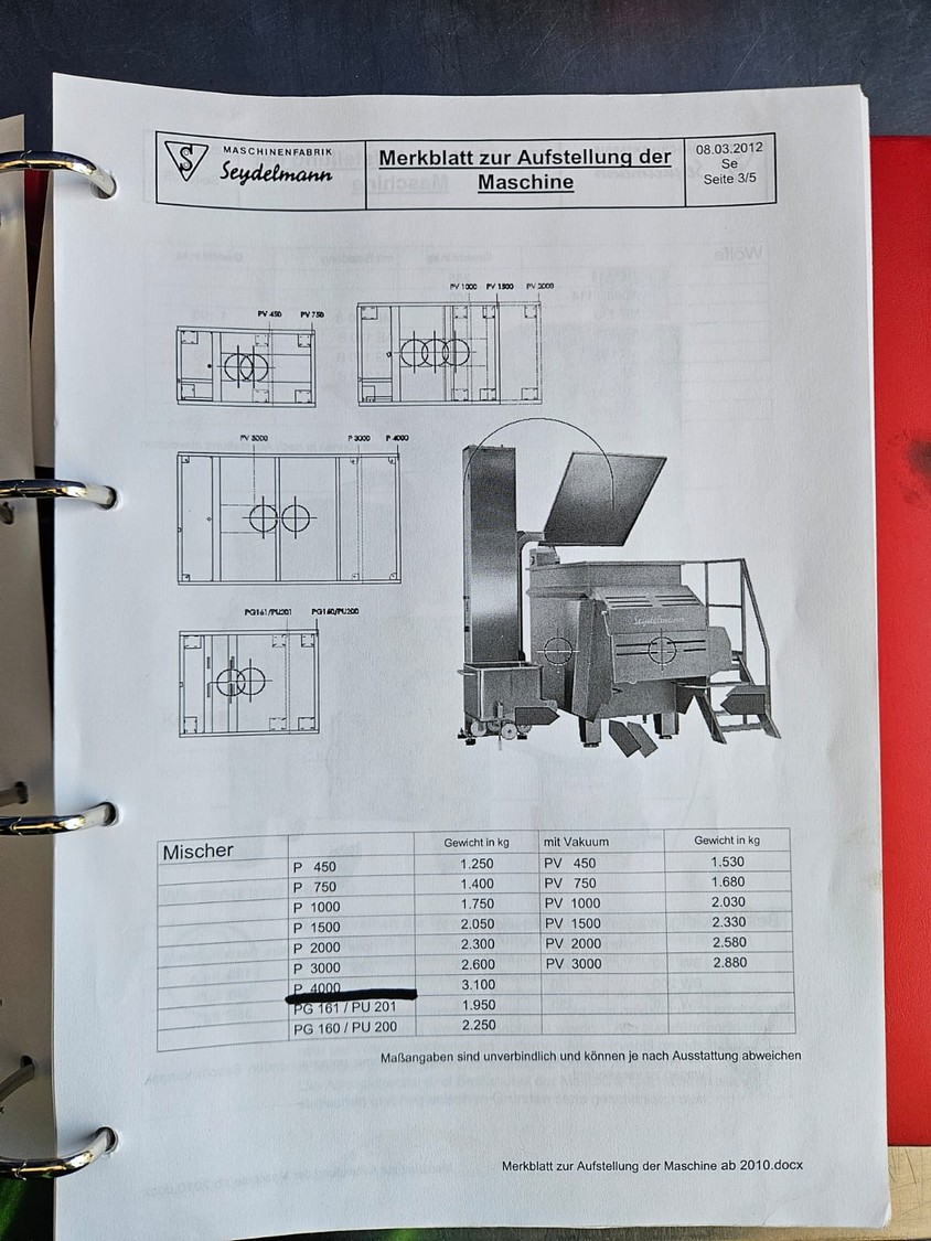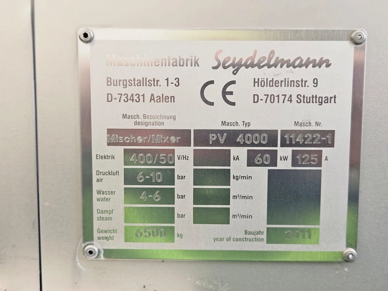 Seydelmann cooled vacuum double shaft paddle mixer with Oslos lifter for pallet boxes, type: PV 4000, machine number: 11422-1, year of construction: 2011, 400 V, 50 Hz, 125 A, 60 kW, weight: 6500 kg, dimensions: 4250 mm x 2300 mm x 2750 mm. Oslos lifter, type: Column Loader 1000S, serial number: E011270705118/9001, year of construction: 09/2021, 380 V, 3 Ph, 50 Hz, 5.2 A, 2.2 kW, capacity: 1000 kg, dimensions lifter: 700 mm x 2600 mm x 4200 mm, dimensions lifting arm: 1750 mm x 1600 mm x 1250 mm.