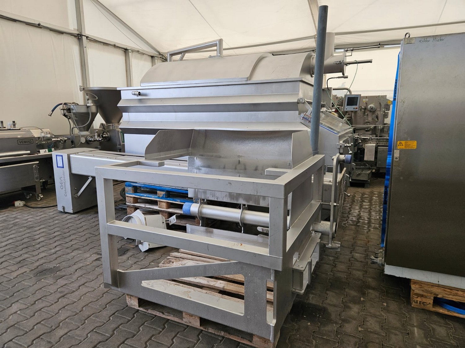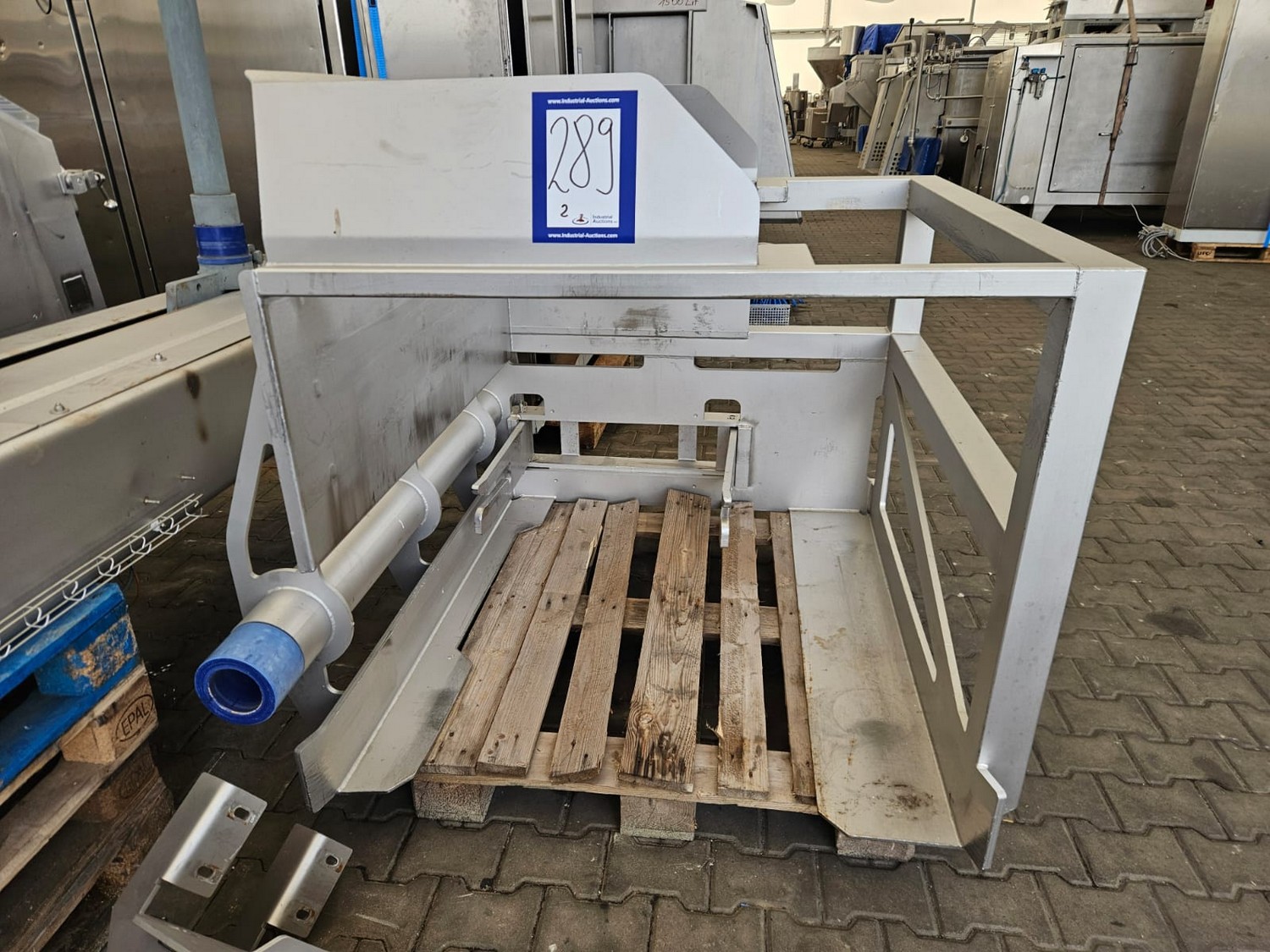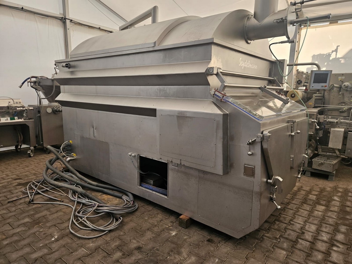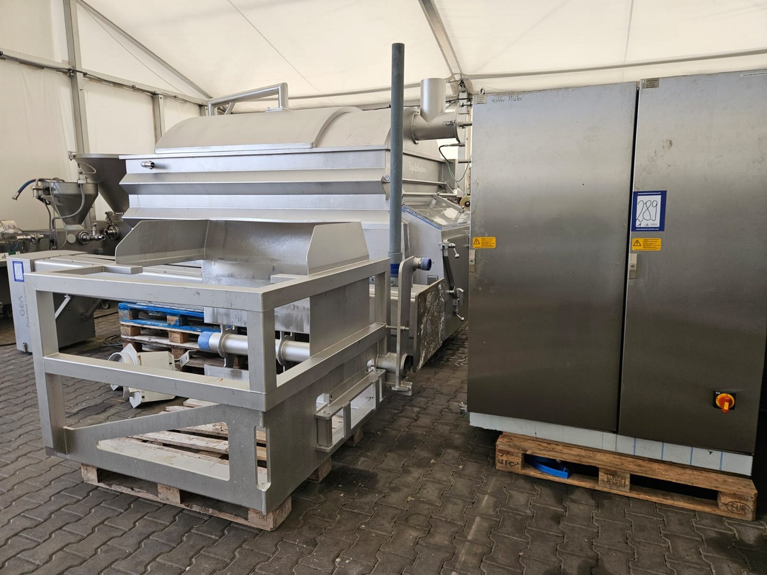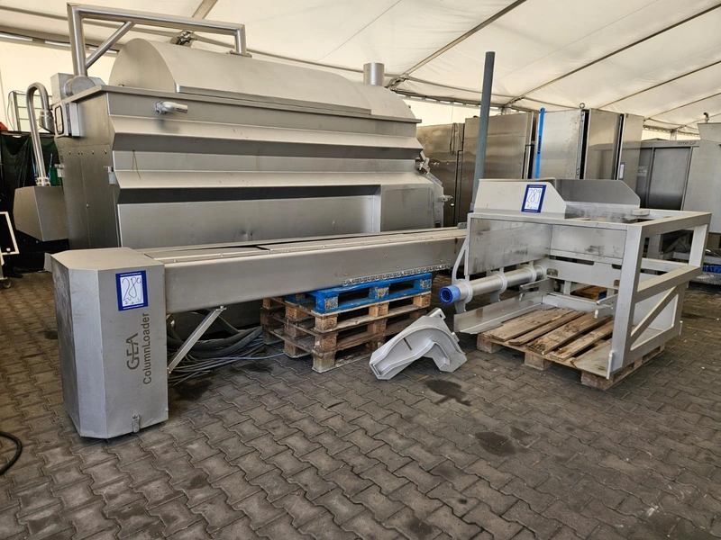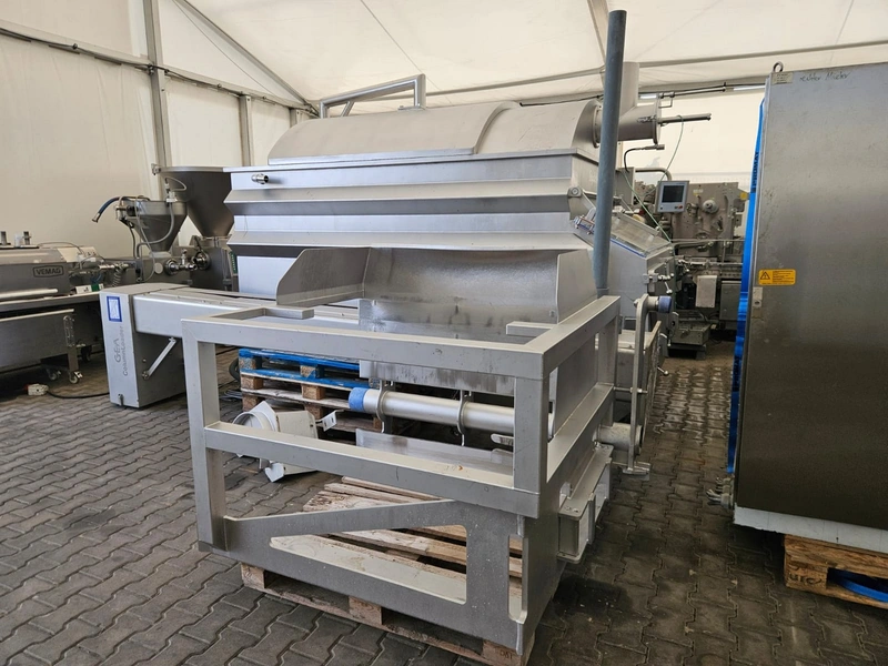 Seydelmann cooled vacuum double shaft paddle mixer with Oslos lifter for pallet boxes, type: PV 4000, machine number: 11422-1, year of construction: 2011, 400 V, 50 Hz, 125 A, 60 kW, weight: 6500 kg, dimensions: 4250 mm x 2300 mm x 2750 mm. Oslos lifter, type: Column Loader 1000S, serial number: E011270705118/9001, year of construction: 09/2021, 380 V, 3 Ph, 50 Hz, 5.2 A, 2.2 kW, capacity: 1000 kg, dimensions lifter: 700 mm x 2600 mm x 4200 mm, dimensions lifting arm: 1750 mm x 1600 mm x 1250 mm.