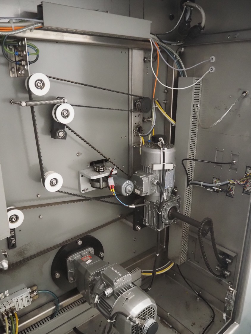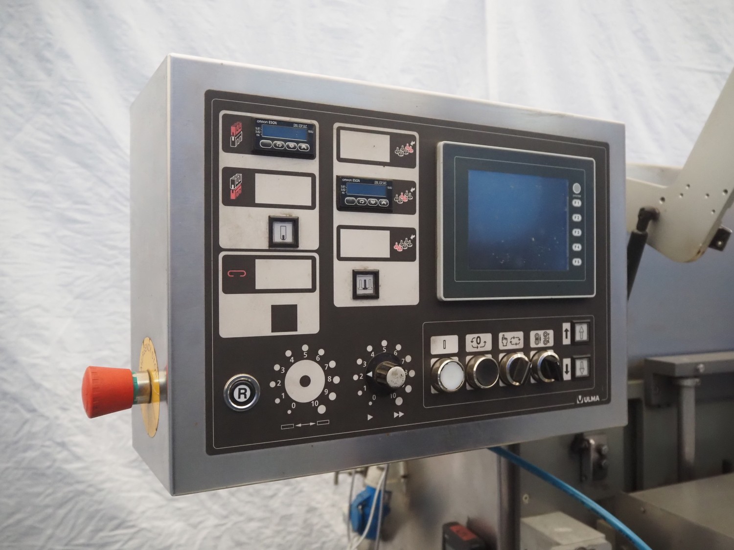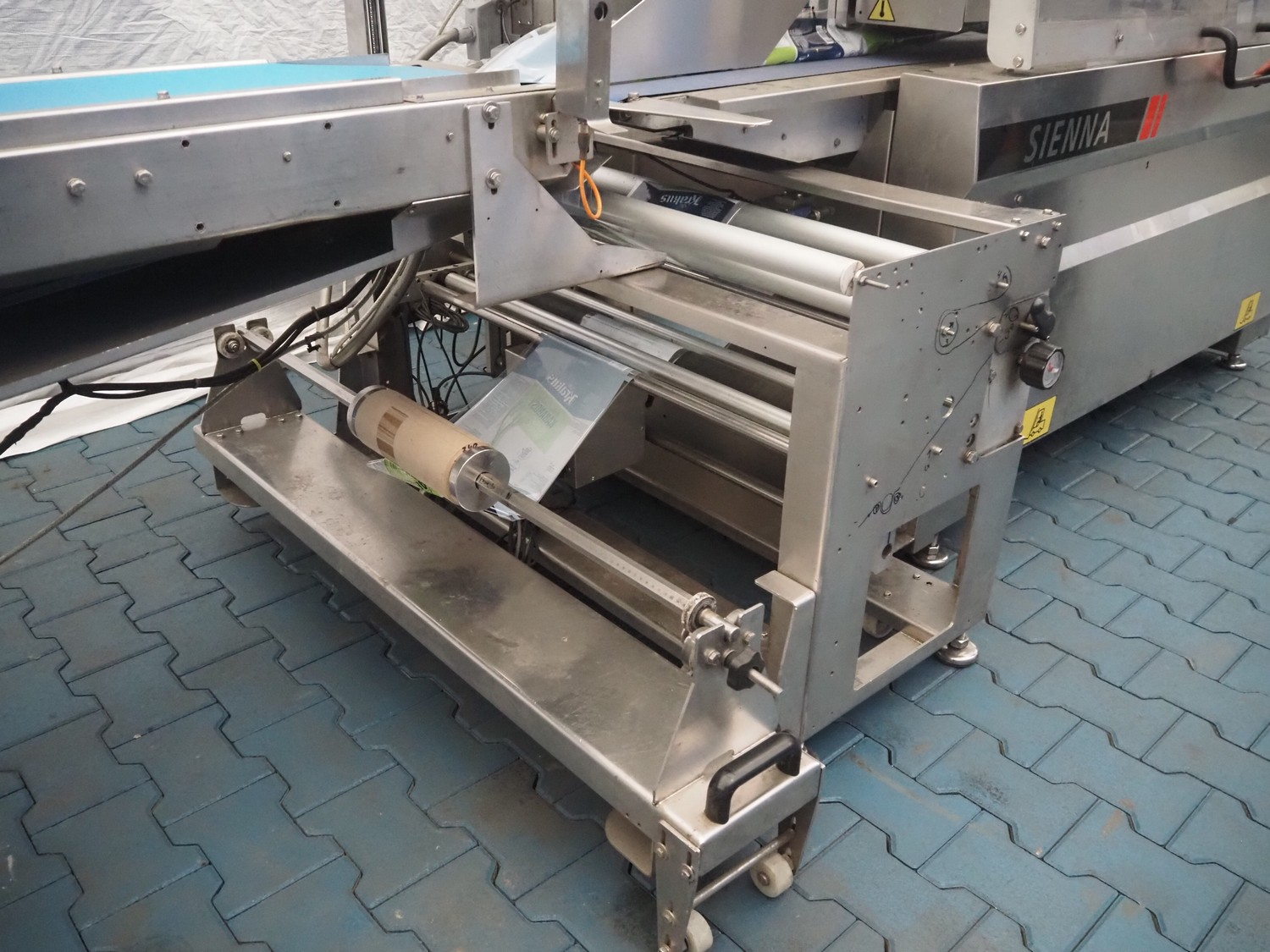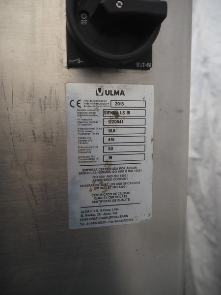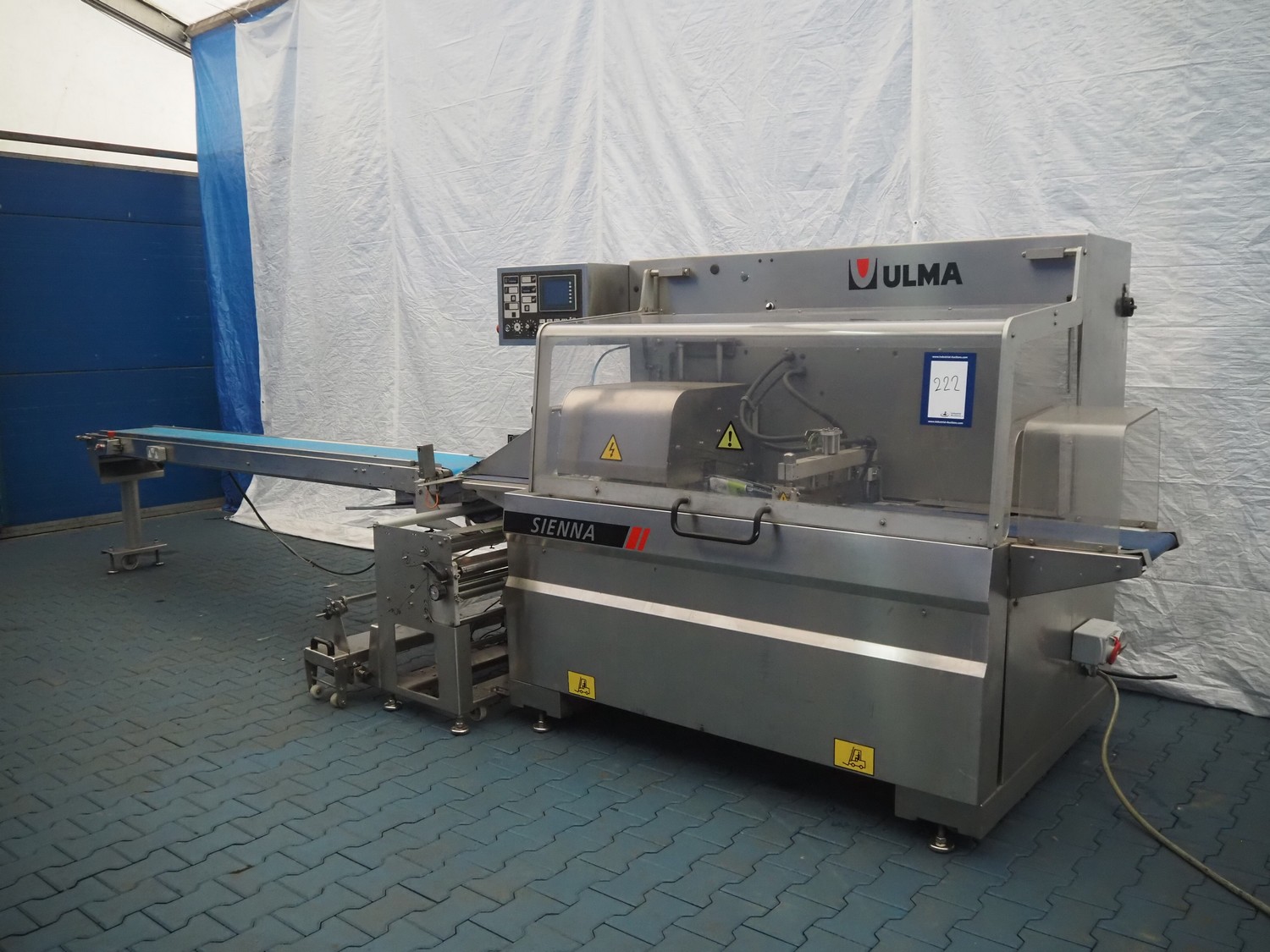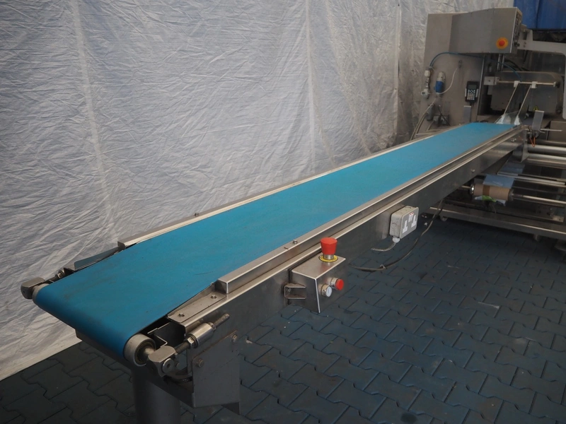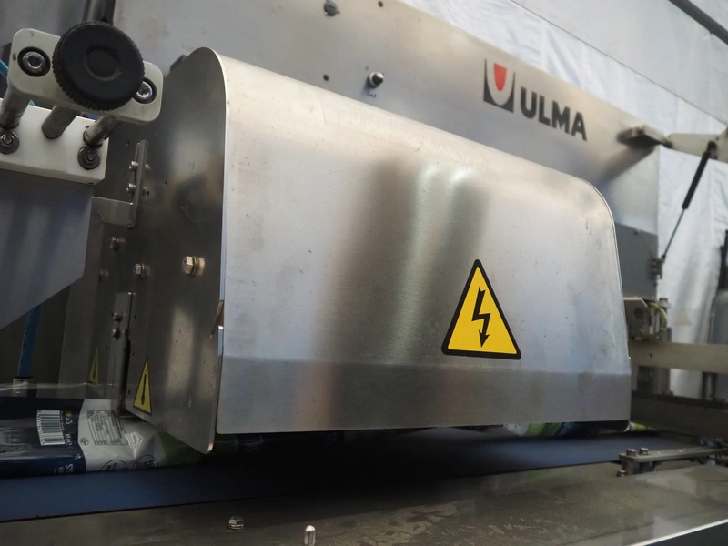 Ulma flowpacker, type: Sienna LS BI, serial number: 1220641, year of construction: 2013, 415 V, 50 Hz, 16 A, 10.5 kW, film width: 240 mm, plastic belt, belt width: 280 mm, seal length: 320 mm, seal width: 400 mm, total dimensions: 3000 mm x 1500 mm x 1730 mm. Including infeed belt, dimensions: 3400 mm x 580 mm x 920 mm.