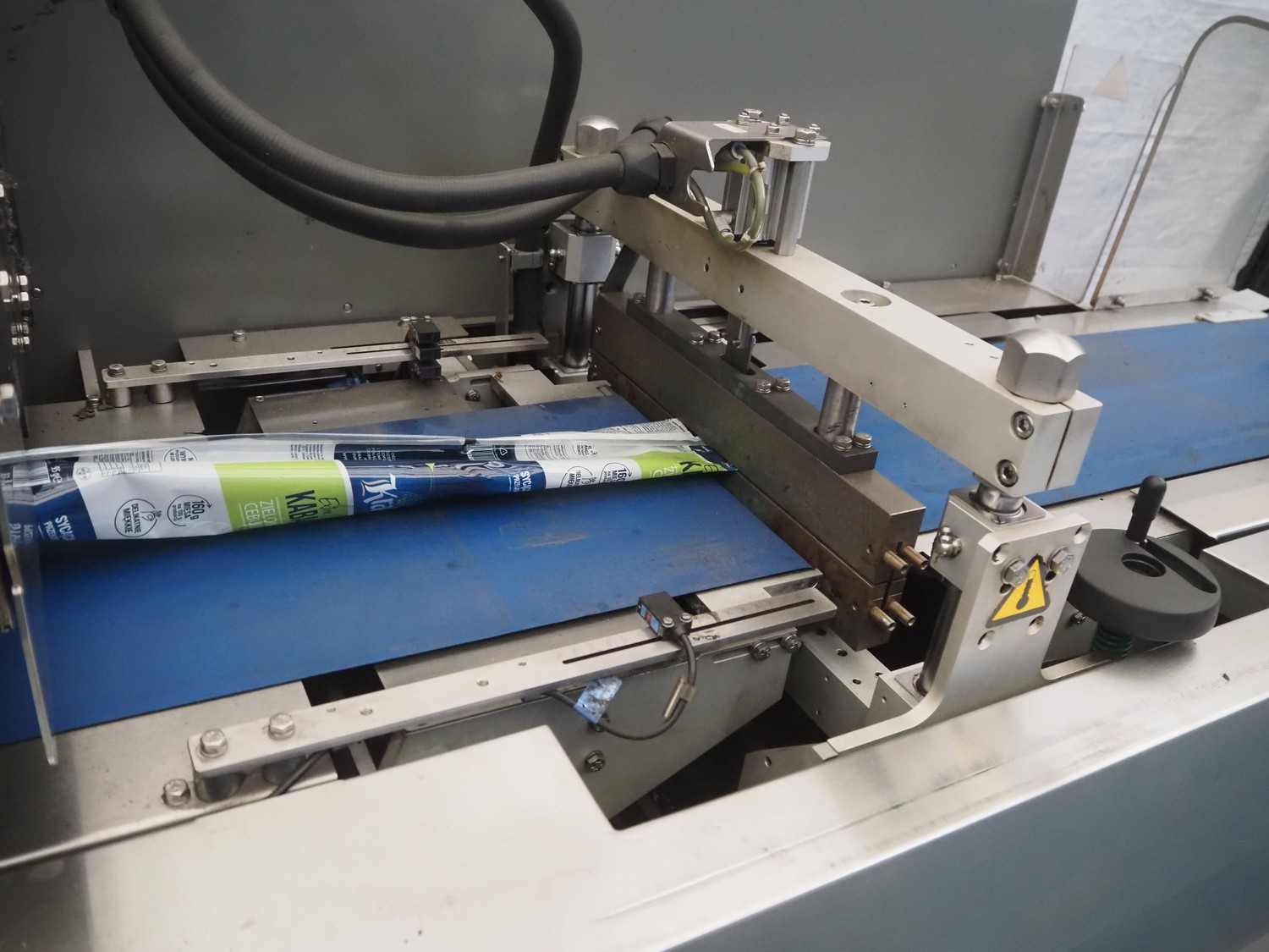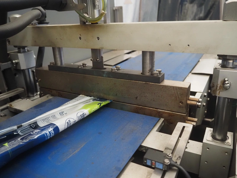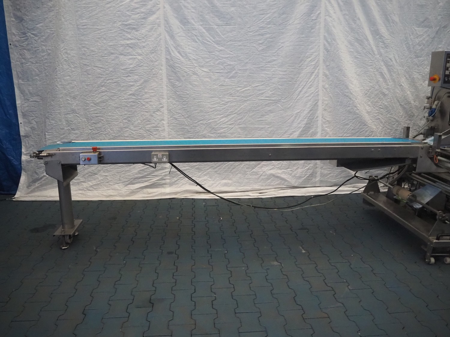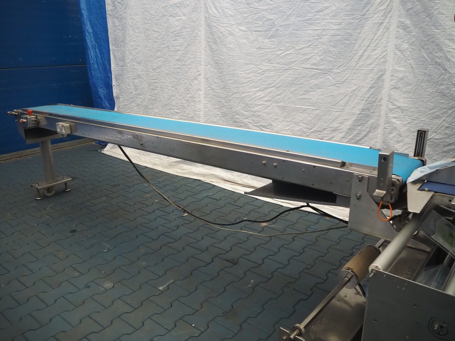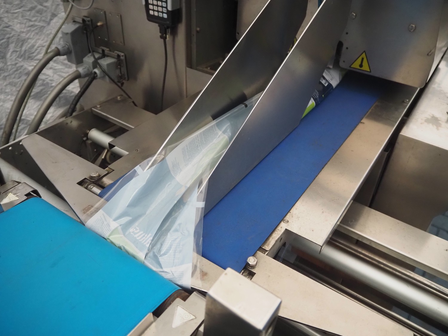 Ulma flowpacker, type: Sienna LS BI, serial number: 1220641, year of construction: 2013, 415 V, 50 Hz, 16 A, 10.5 kW, film width: 240 mm, plastic belt, belt width: 280 mm, seal length: 320 mm, seal width: 400 mm, total dimensions: 3000 mm x 1500 mm x 1730 mm. Including infeed belt, dimensions: 3400 mm x 580 mm x 920 mm.