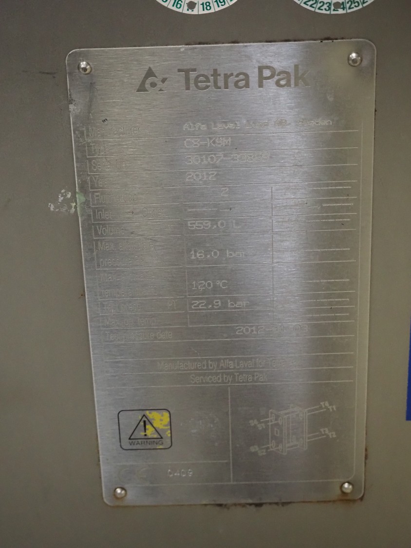 Alfa Laval / Tetra Pak heat exchanger used as buttermilk pasteurizer, type: C8-K8M, serial number: 30107-33855, year of construction: 2012, volume: 559.0 litres, PS: 16.0 litres, PT: 22.9 bar, TS: 120 °C, dimensions: 3200 mm x 550 mm x 1850 mm.