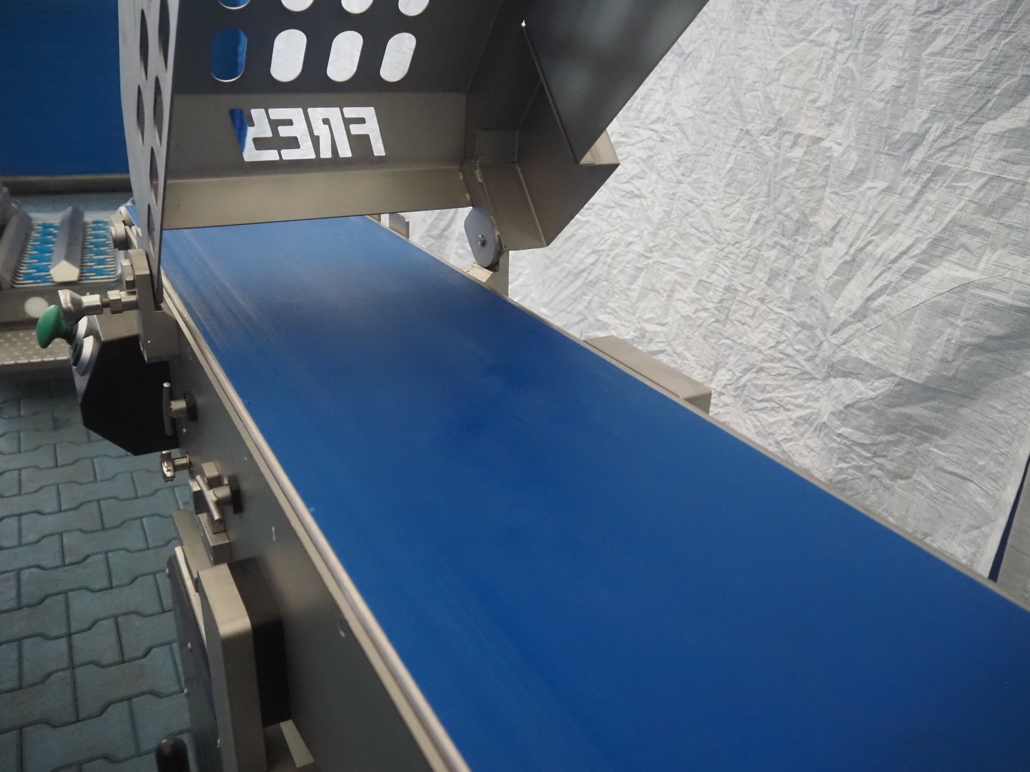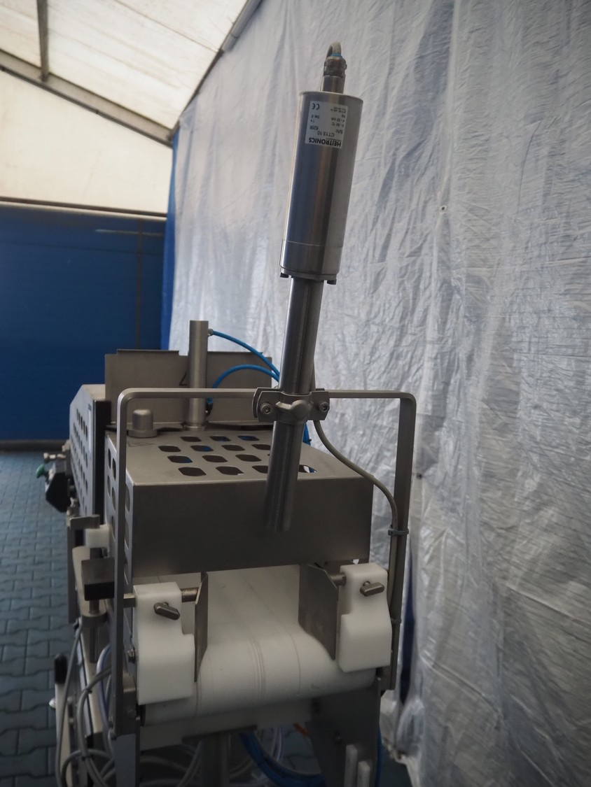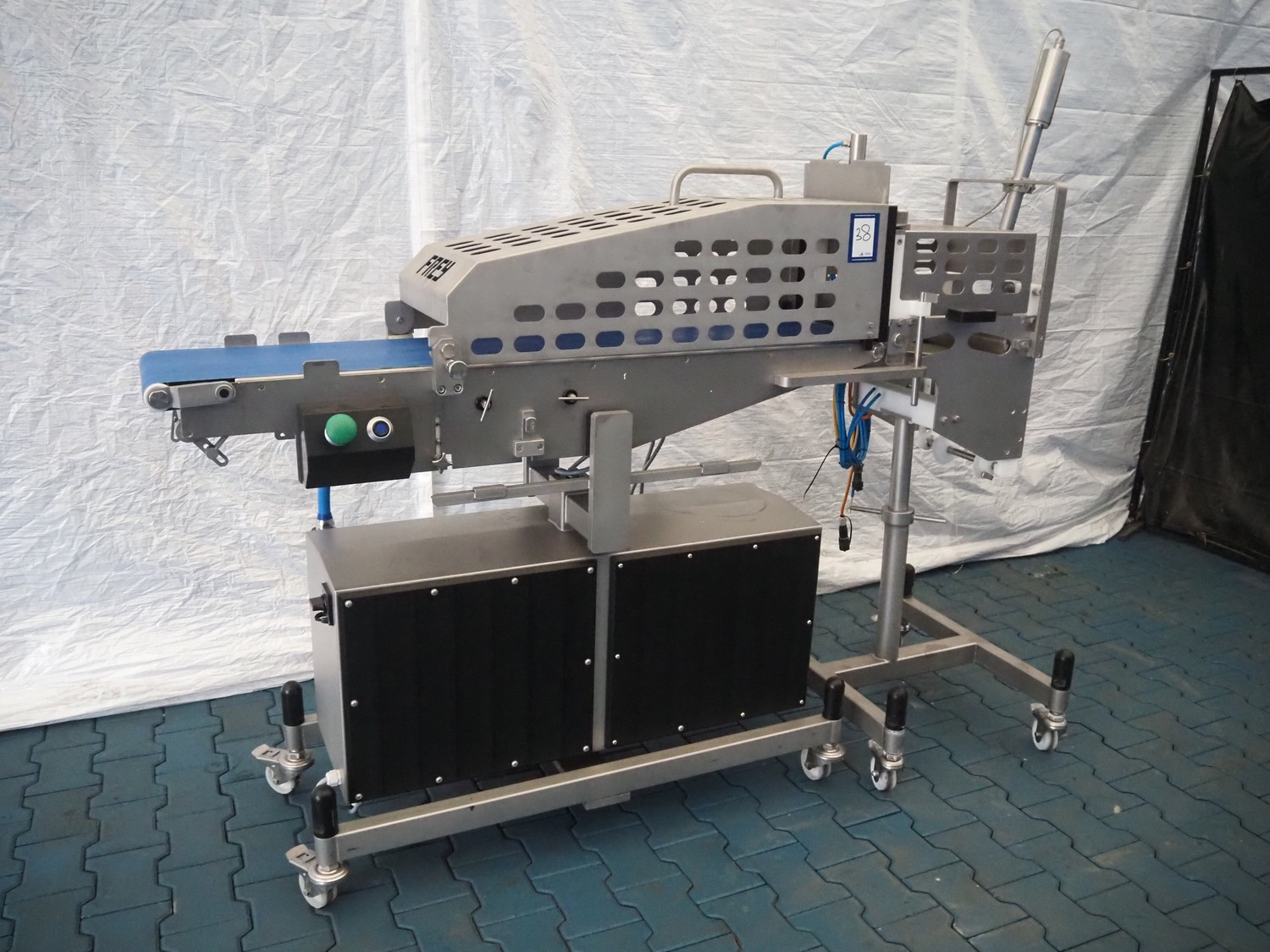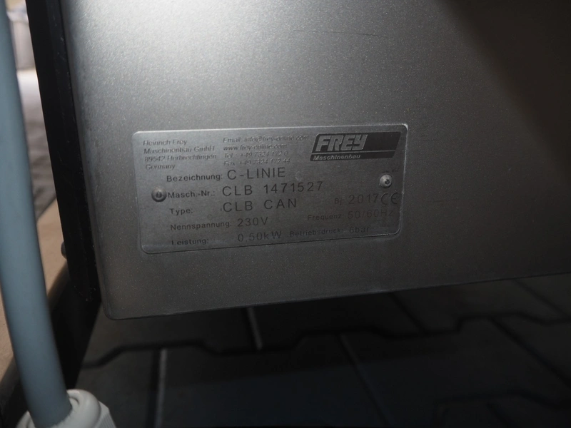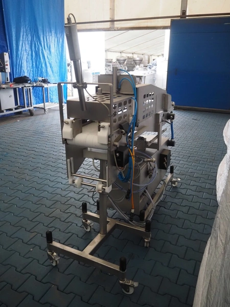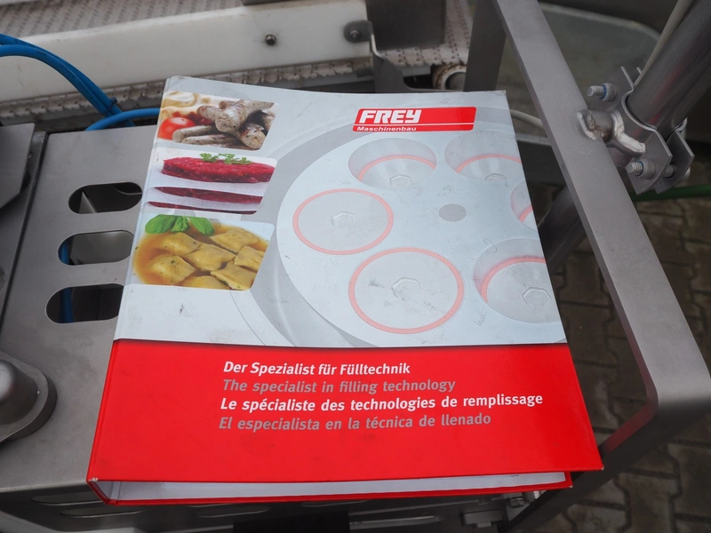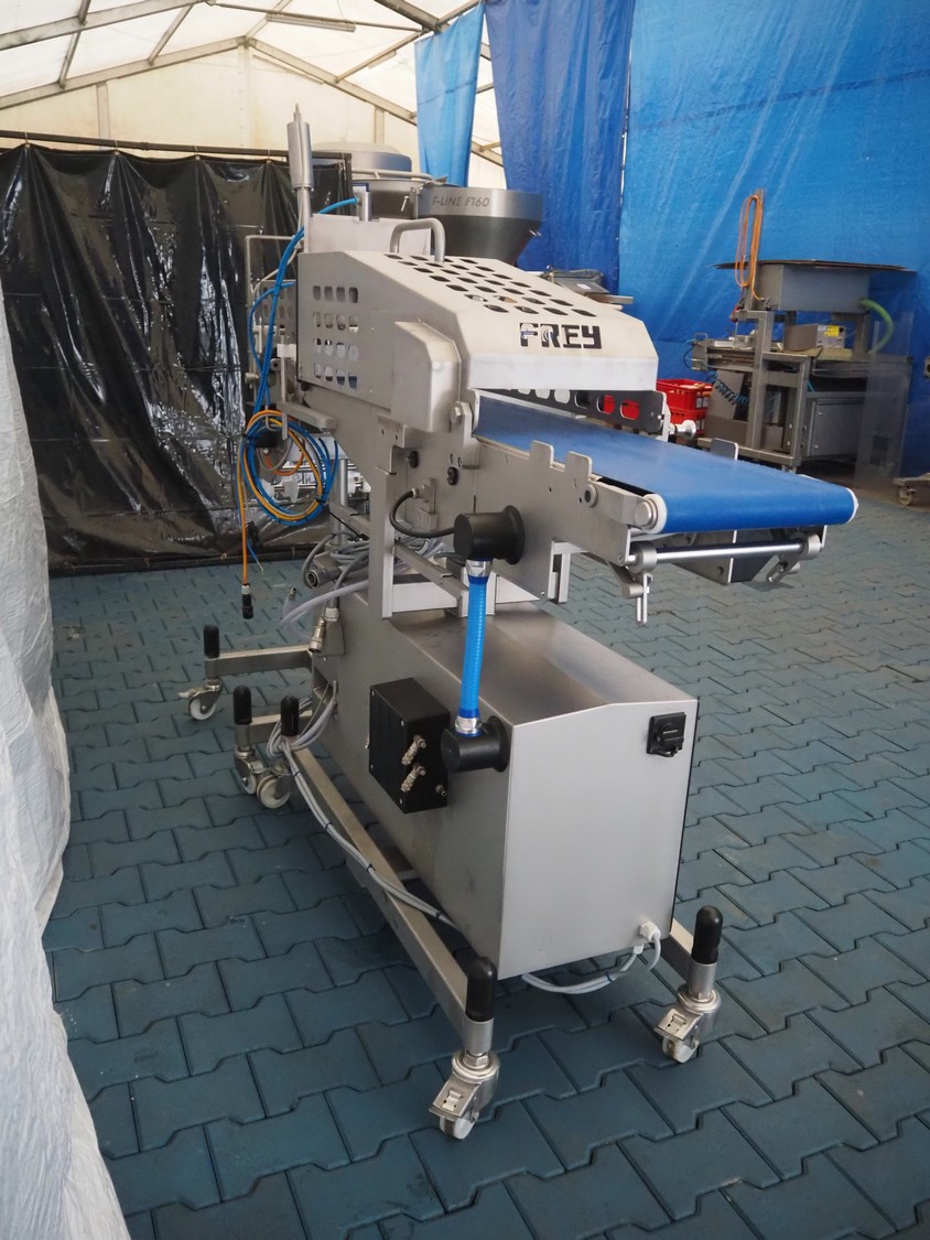 Frey Maschinenbau GmbH mobile minced meat portioner, type: CLB CAN, machine number: CLB 1471527, year of construction: 2017, 230 V, 50/60 Hz, 0.50 kW, plastic belt, belt width: (2x) 300 mm, clearance: 300 mm x 70 mm, total dimensions: 2050 mm x 700 mm x 1750 mm.