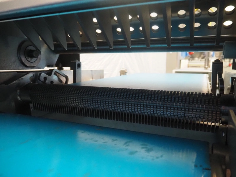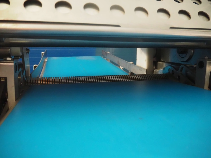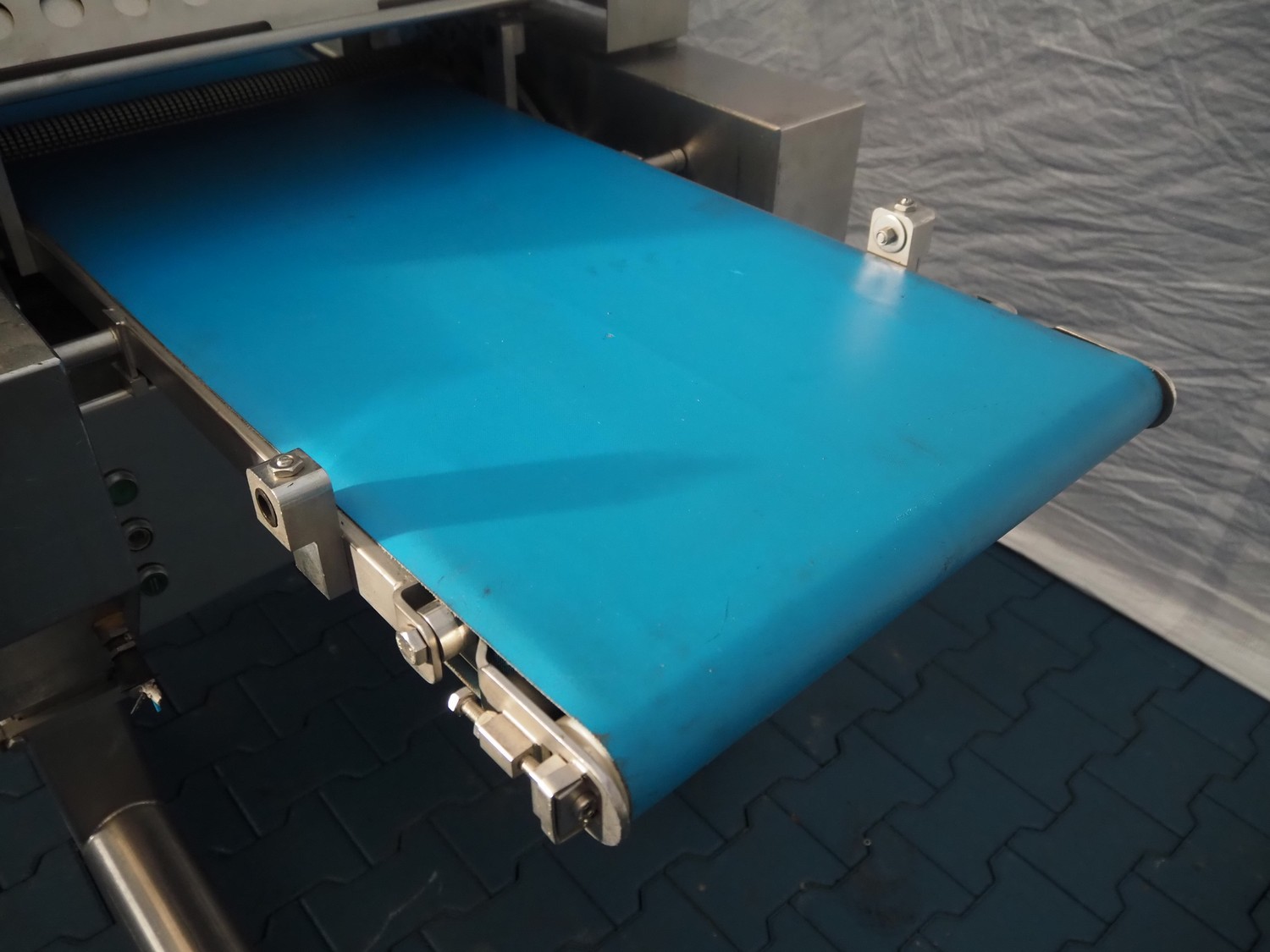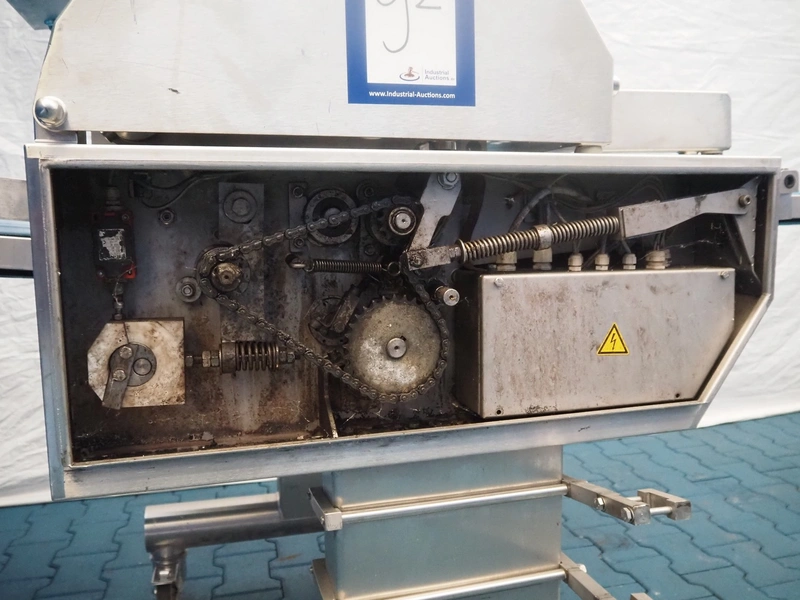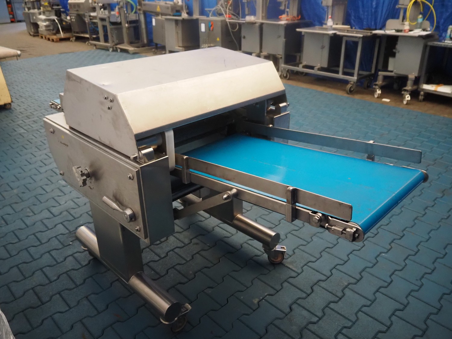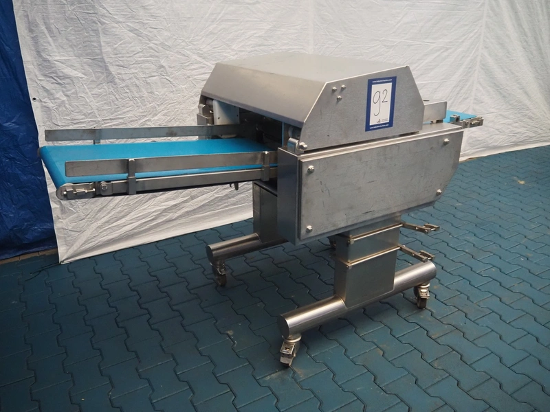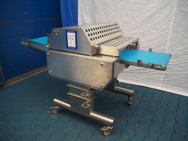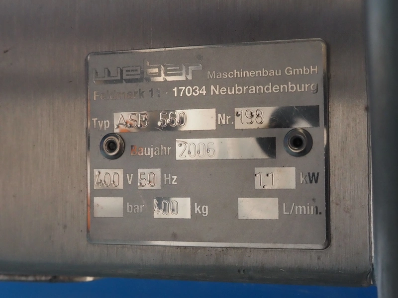 Weber mobile skinning and derinding machine, type: ASB 560, number: 198, year of construction: 2006, 400 V, 50 Hz, 1.1 kW, weight: 400 kg, plastic belt, belt width: 500 mm, working width: 500 mm, total dimensions: 2100 mm x 1000 mm x 1250 mm. Missing derinding roll and knife.