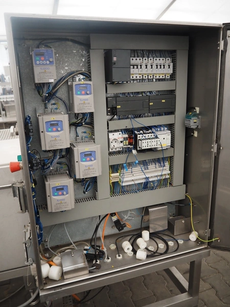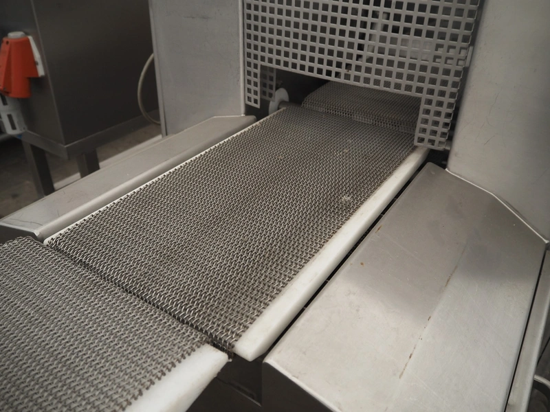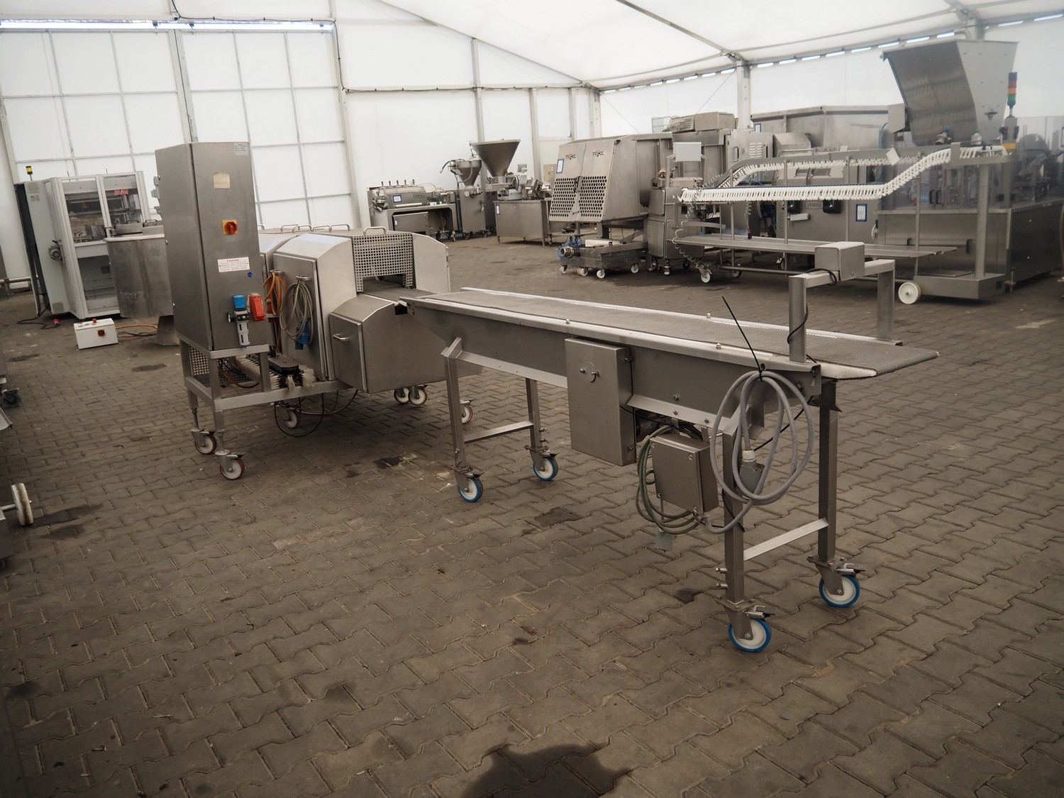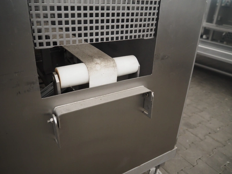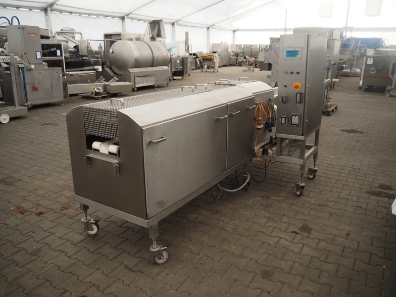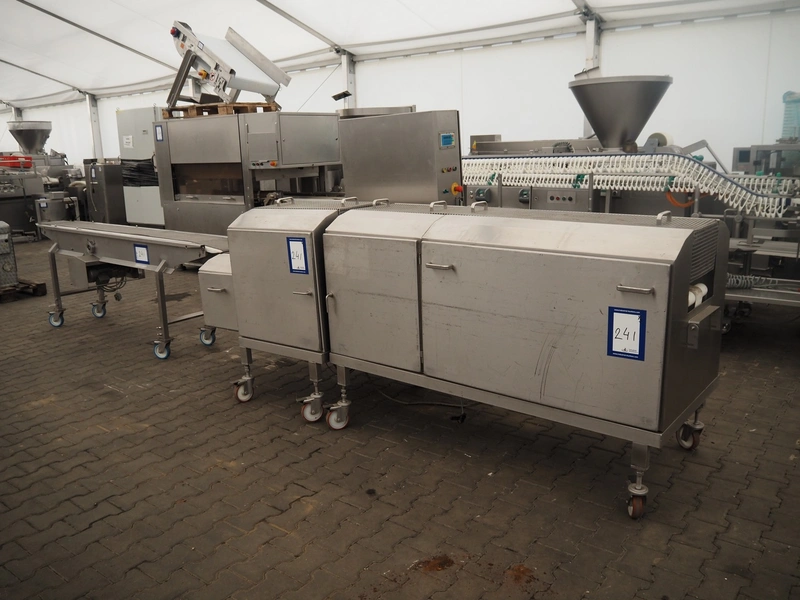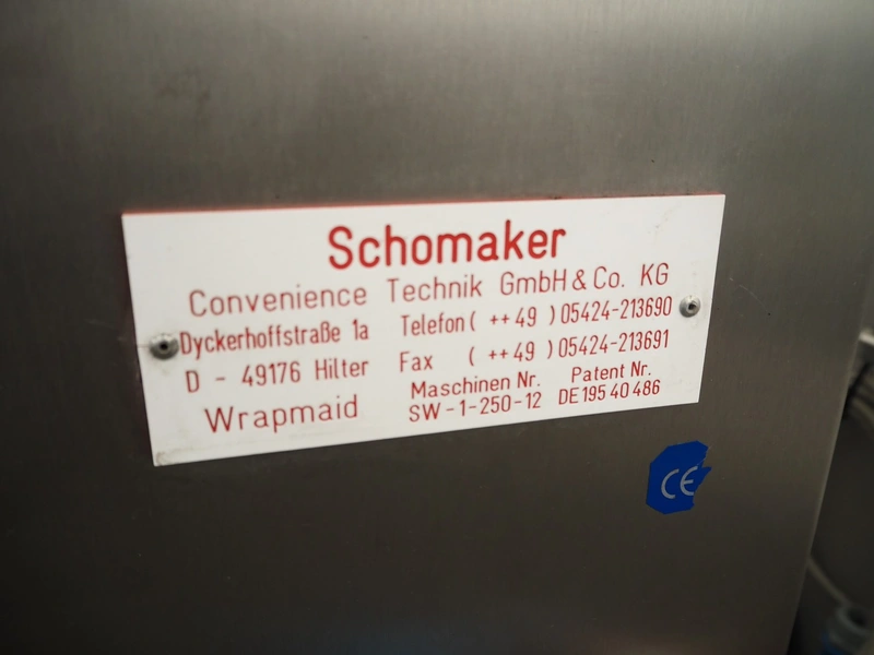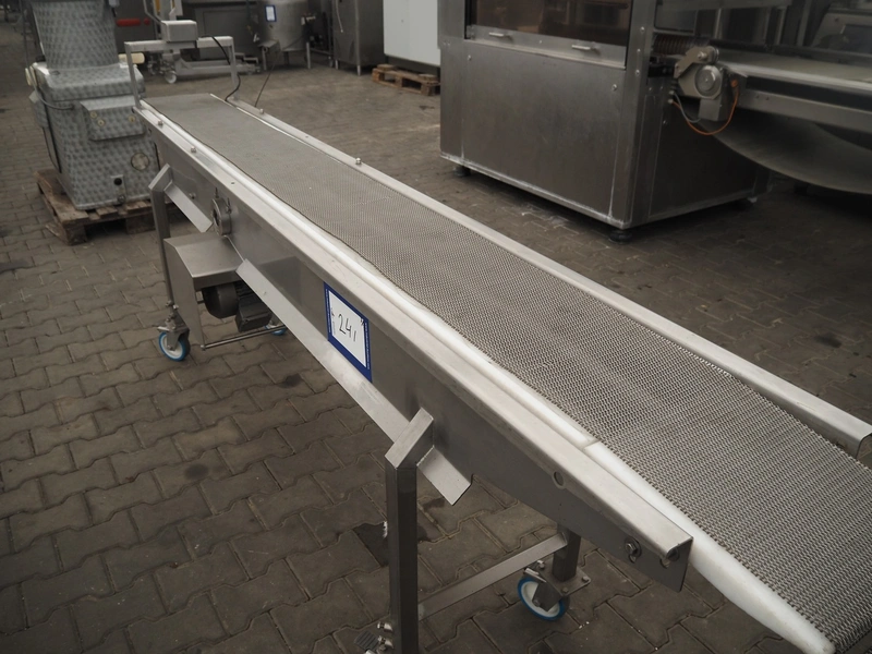 Schomaker mobile slicer line, consisting of: infeed belt with plastic belt, belt width: 90 mm, total dimensions infeed belt: 1800 mm x 850 mm x 1200 mm, slicer, machine number: SW-1-250-12, s/s mesh belt, belt width: 250 mm, working width: 250 mm, total dimensions slicer: 1120 mm x 1500 mm x 1700 mm, outfeed belt with s/s mesh belt, belt width: 250 mm, total dimensions outfeed belt: 2800 mm x 550 mm x 1200 mm.
