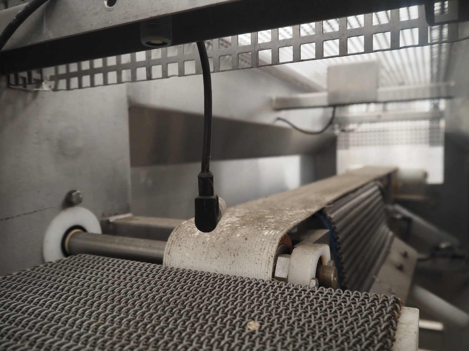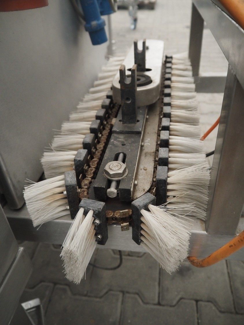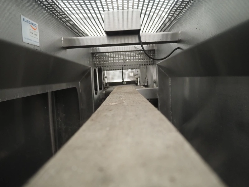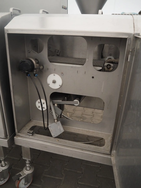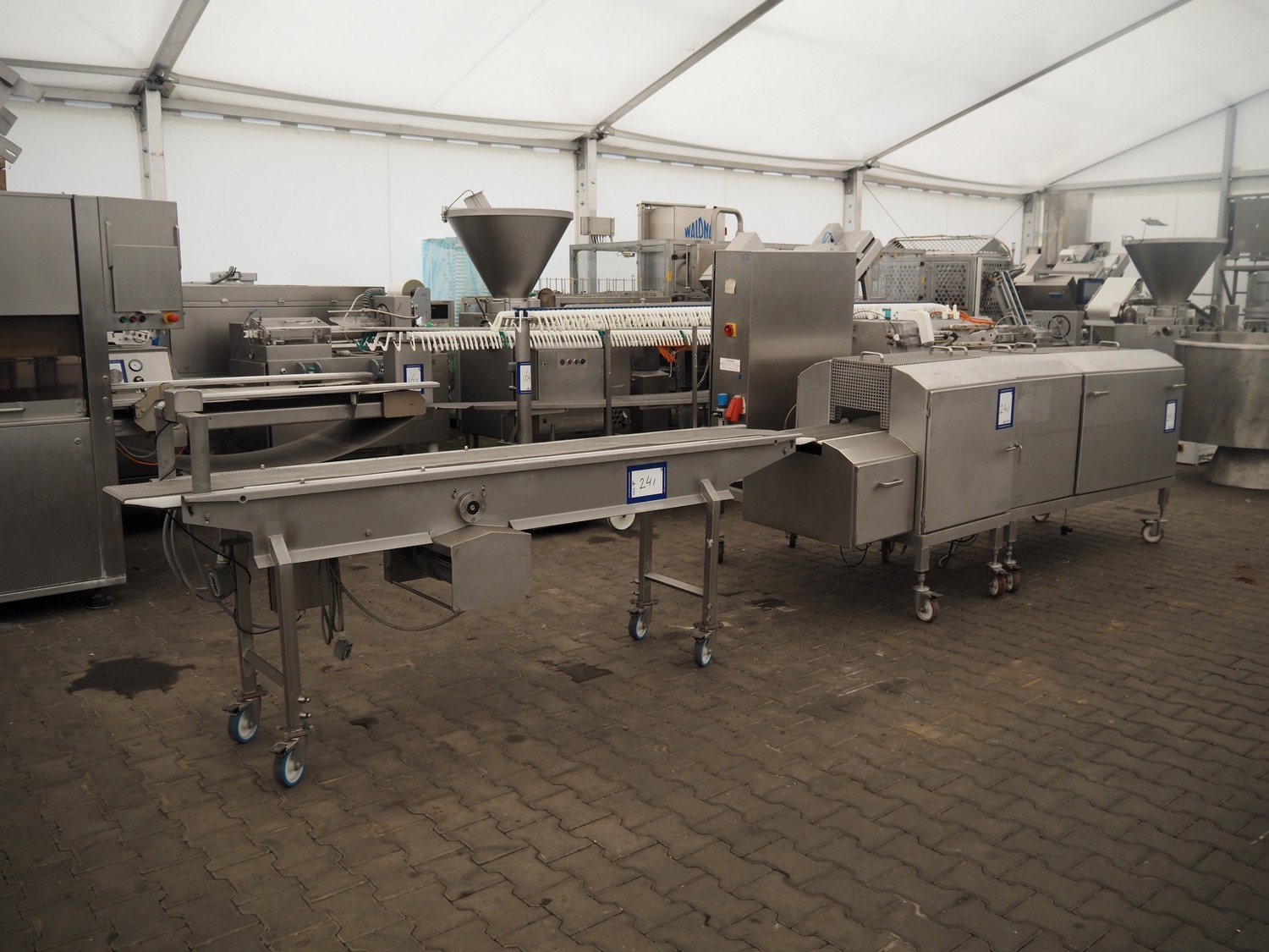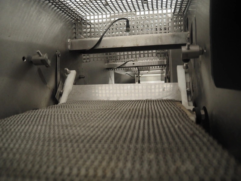 Schomaker mobile slicer line, consisting of: infeed belt with plastic belt, belt width: 90 mm, total dimensions infeed belt: 1800 mm x 850 mm x 1200 mm, slicer, machine number: SW-1-250-12, s/s mesh belt, belt width: 250 mm, working width: 250 mm, total dimensions slicer: 1120 mm x 1500 mm x 1700 mm, outfeed belt with s/s mesh belt, belt width: 250 mm, total dimensions outfeed belt: 2800 mm x 550 mm x 1200 mm.