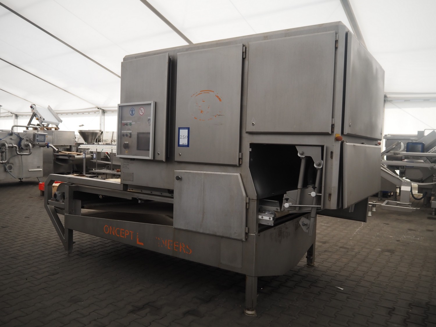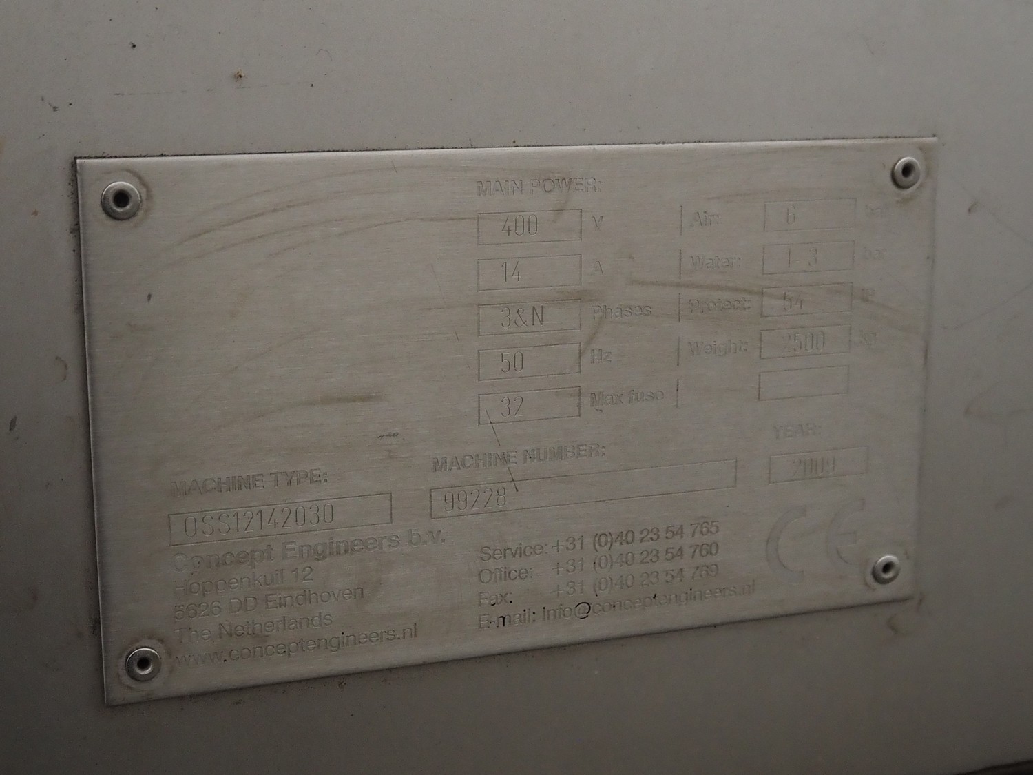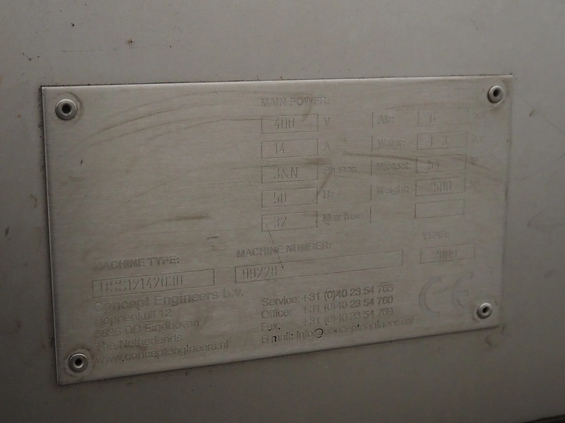Concept Engineers optical sorting machine, type: OSS12142030, machine number: 99228, year of construction: 2009, 400 V, 3 Ph, 50 Hz, 14 A, weight: 2500 kg, plastic belt, belt width: 1400 mm, clearance: 1200 mm x 120 mm, total dimensions: 4150 mm x 1900 mm x 2600 mm.