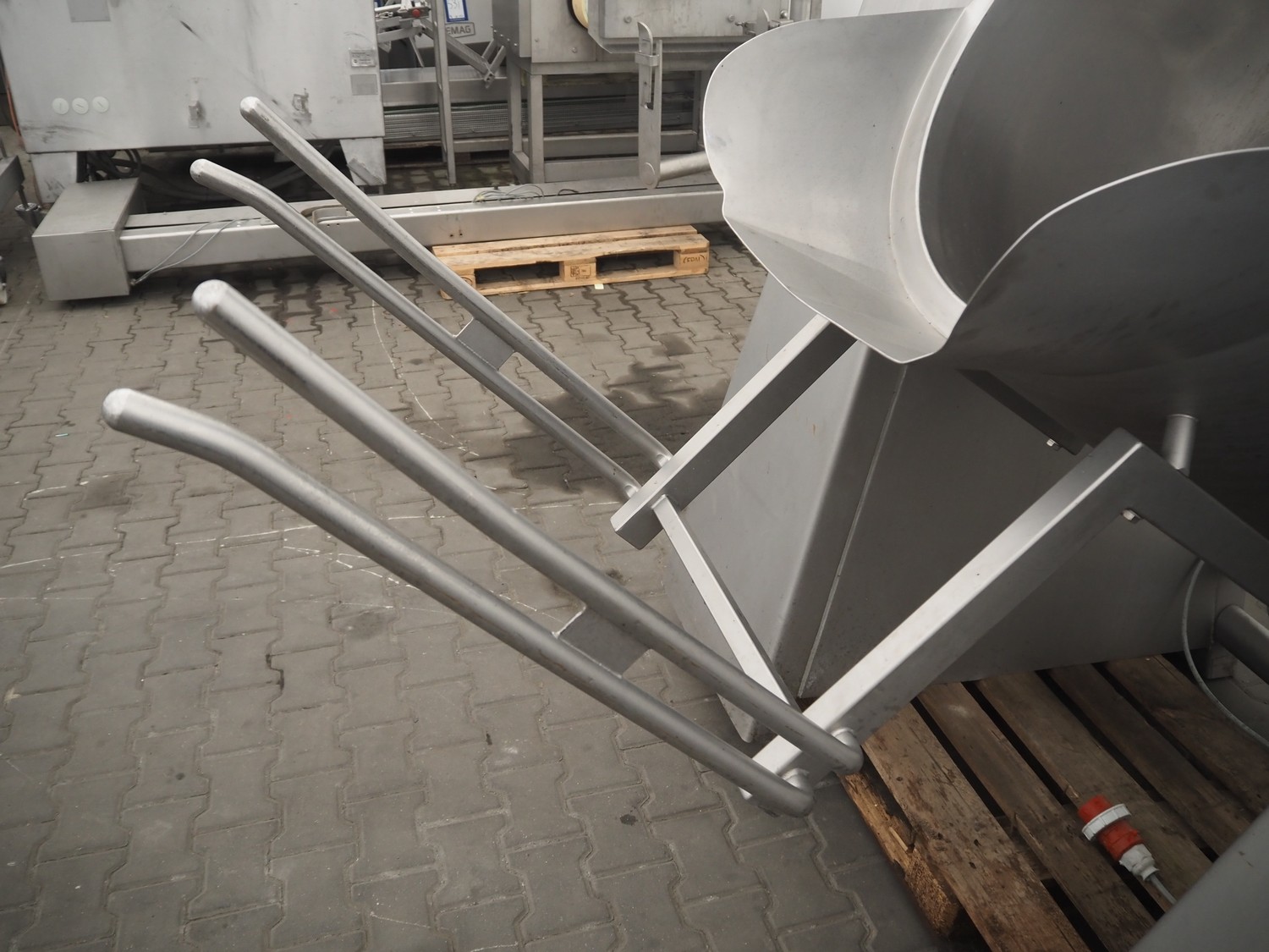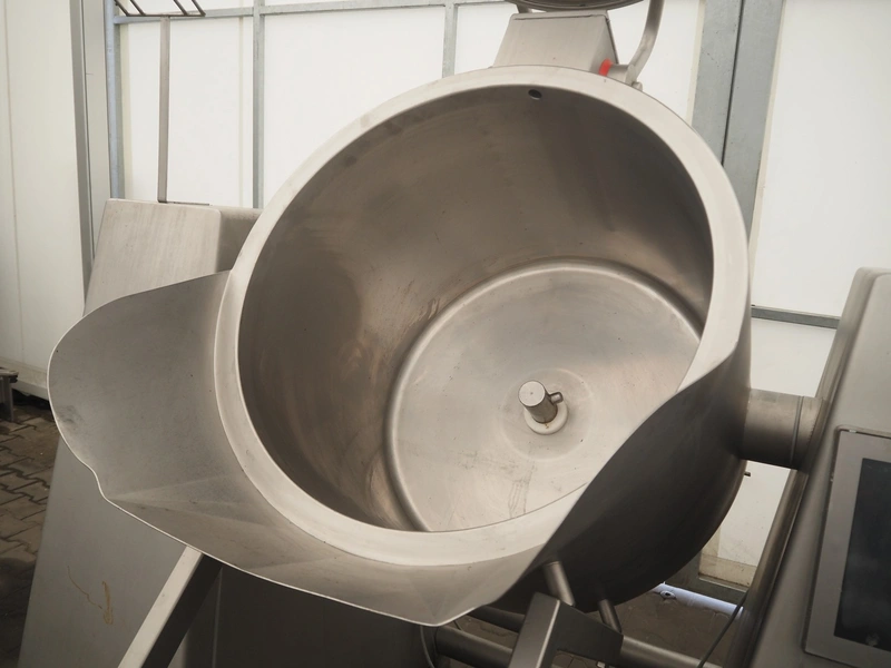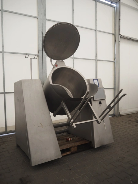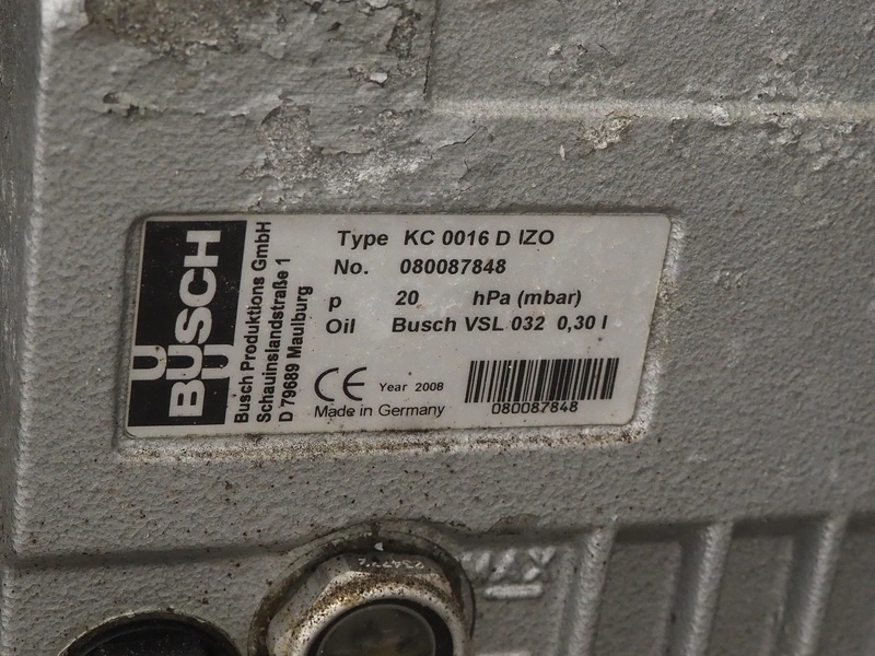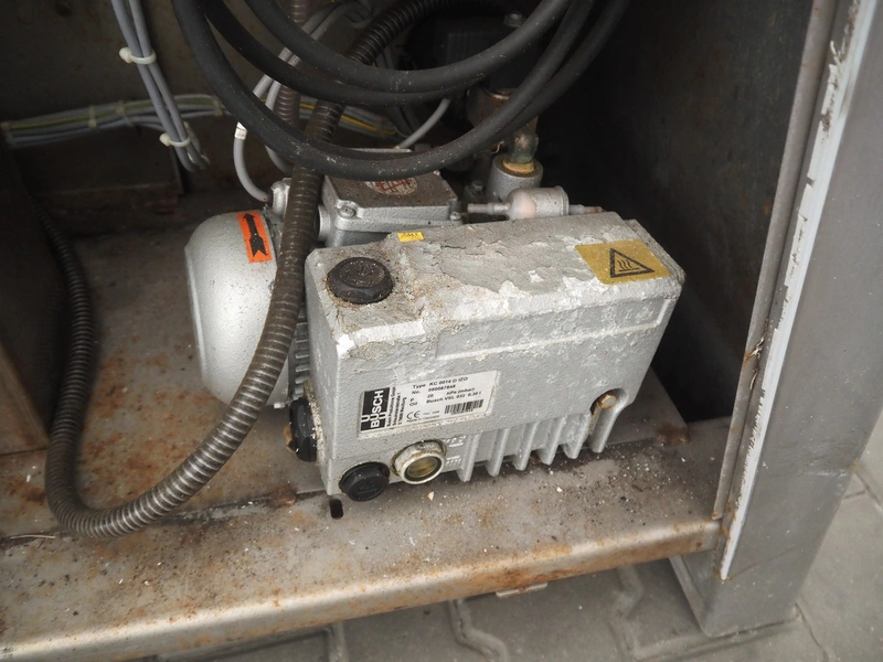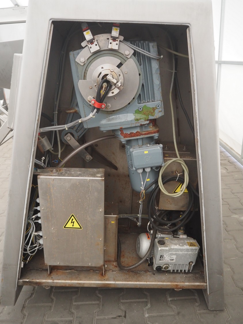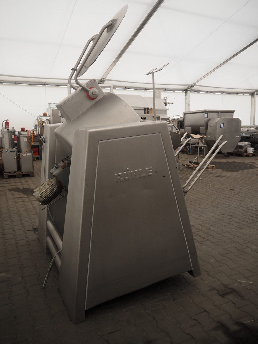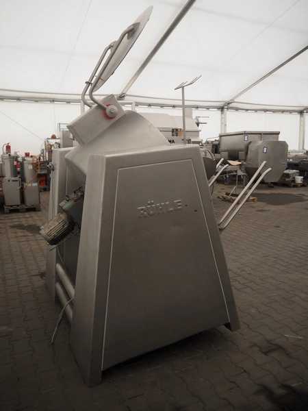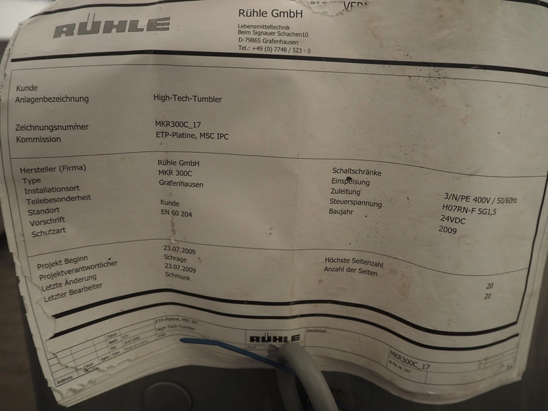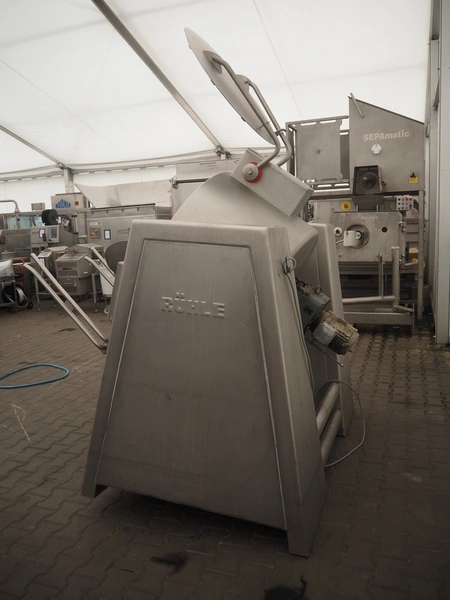 Rühle vacuum tumbler with lifter for 200 liter meat bins, type: MKR 300C, year of construction: 2009, 400 V, 3 Ph, 50/60 Hz, Busch vacuum pump, type: KC 0016 D IZO, serial number: 080087848, year of construction: 2008, capacity: 16 m³/h, total dimensions: 2200 mm x 1900 mm x 1900 mm.