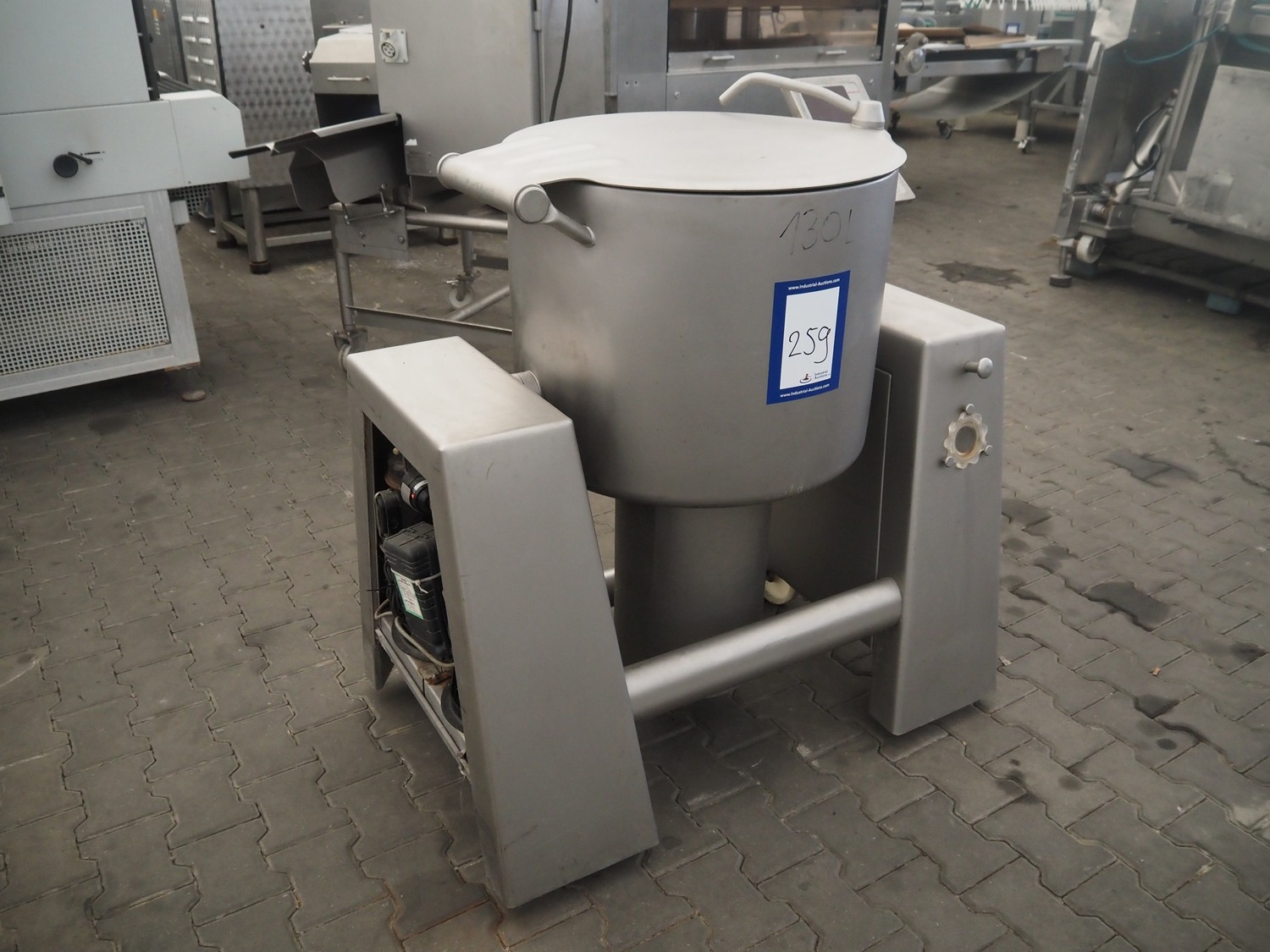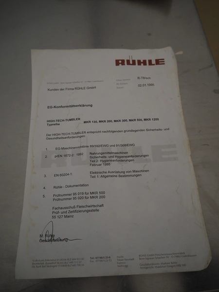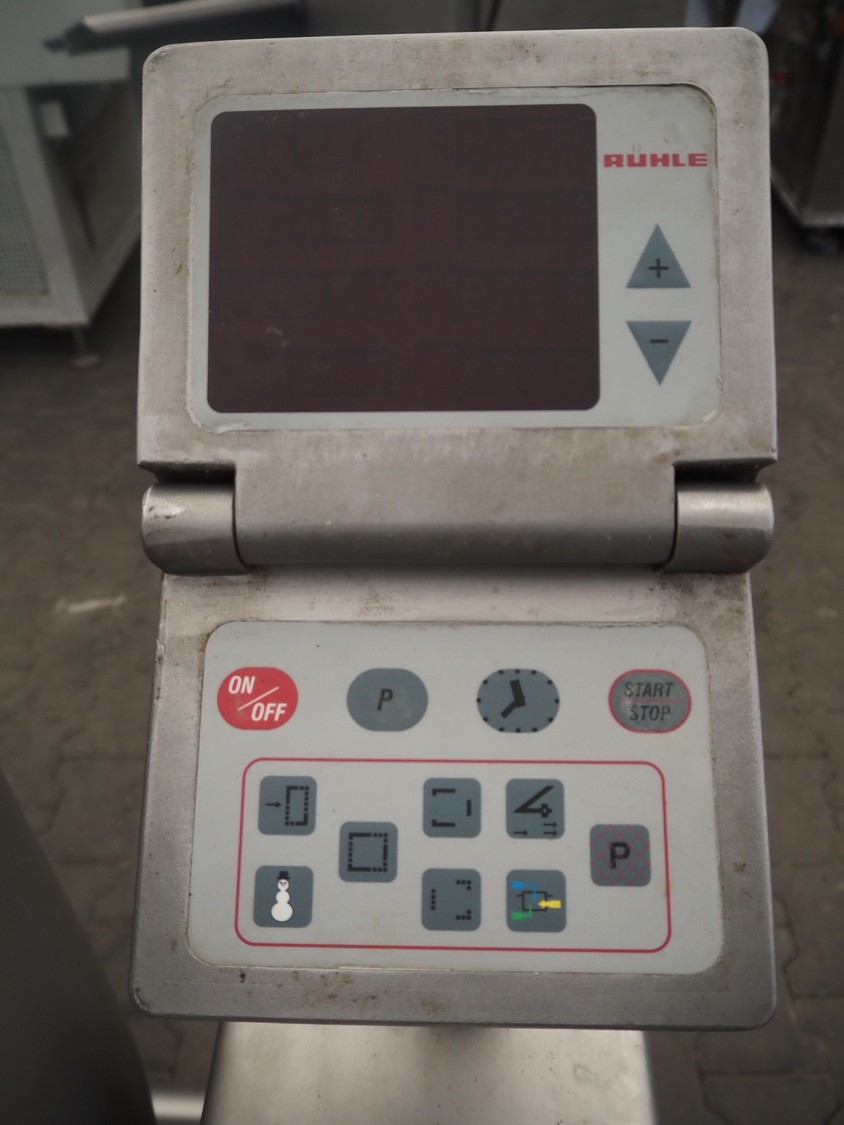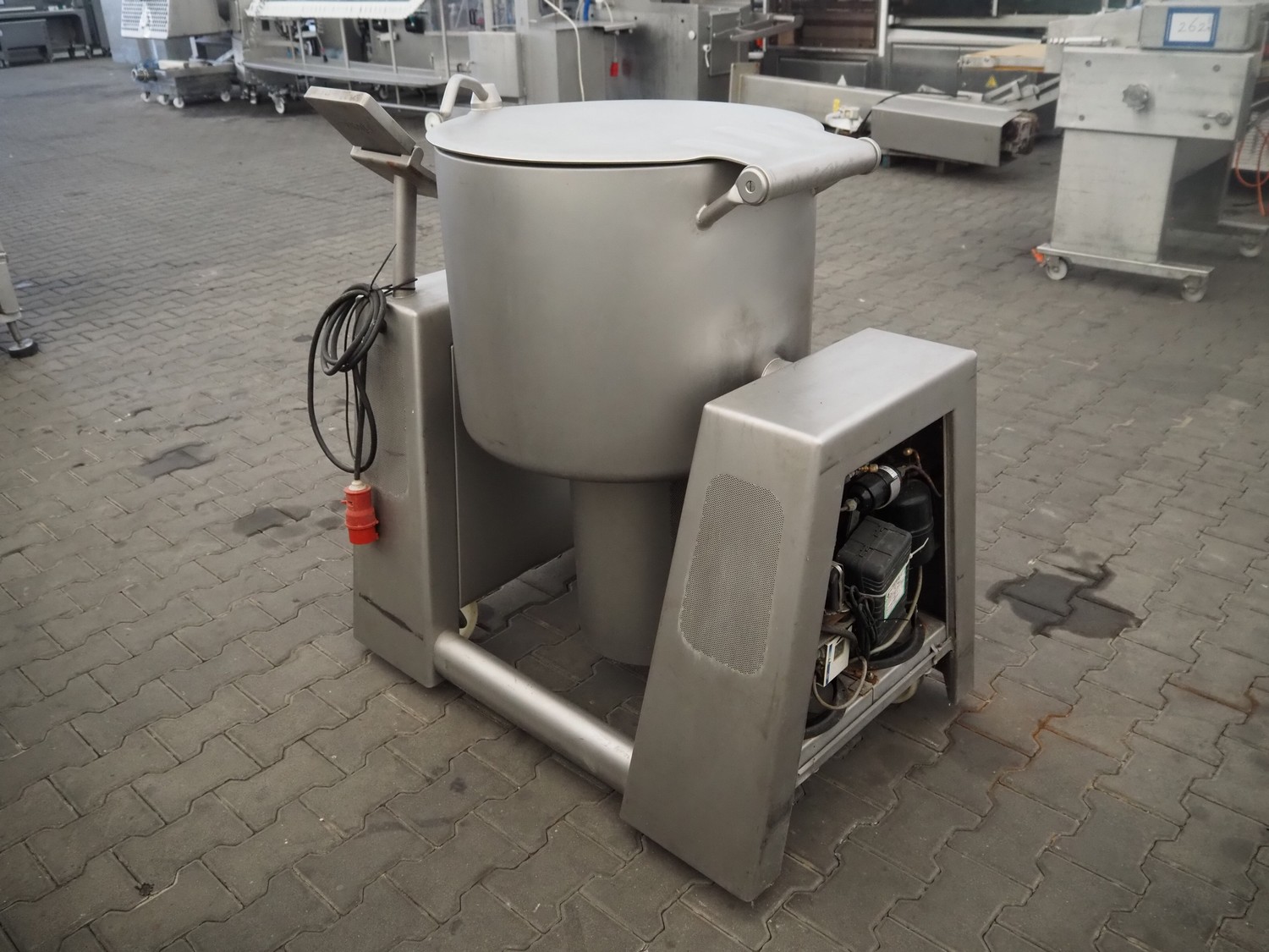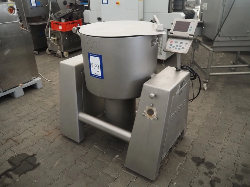 Rühle mobile cooled vacuum tumbler, type: MKR 130, number: 506, 380 V, 3 Ph, 50 Hz, 3.15 kW, volume: 130 liter, total dimensions: 1150 mm x 750 mm x 1250 mm. Missing cover