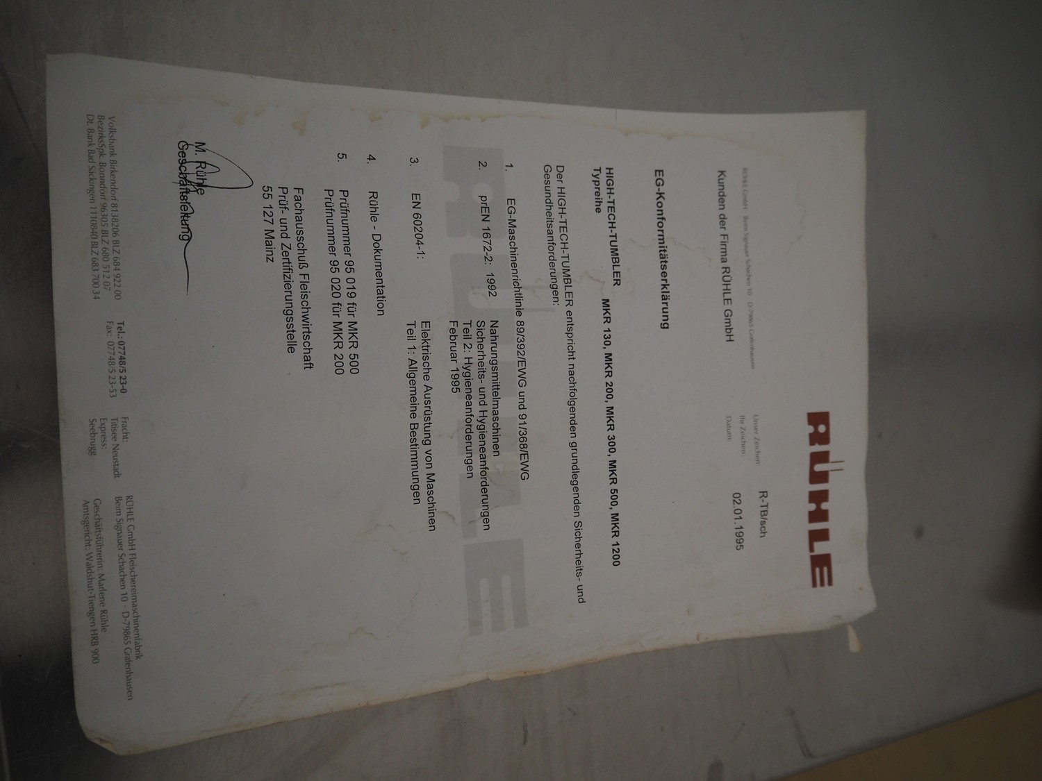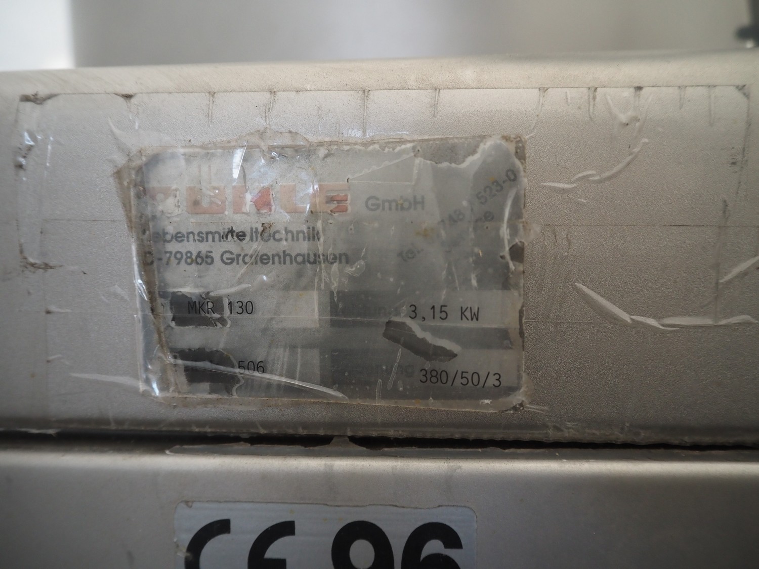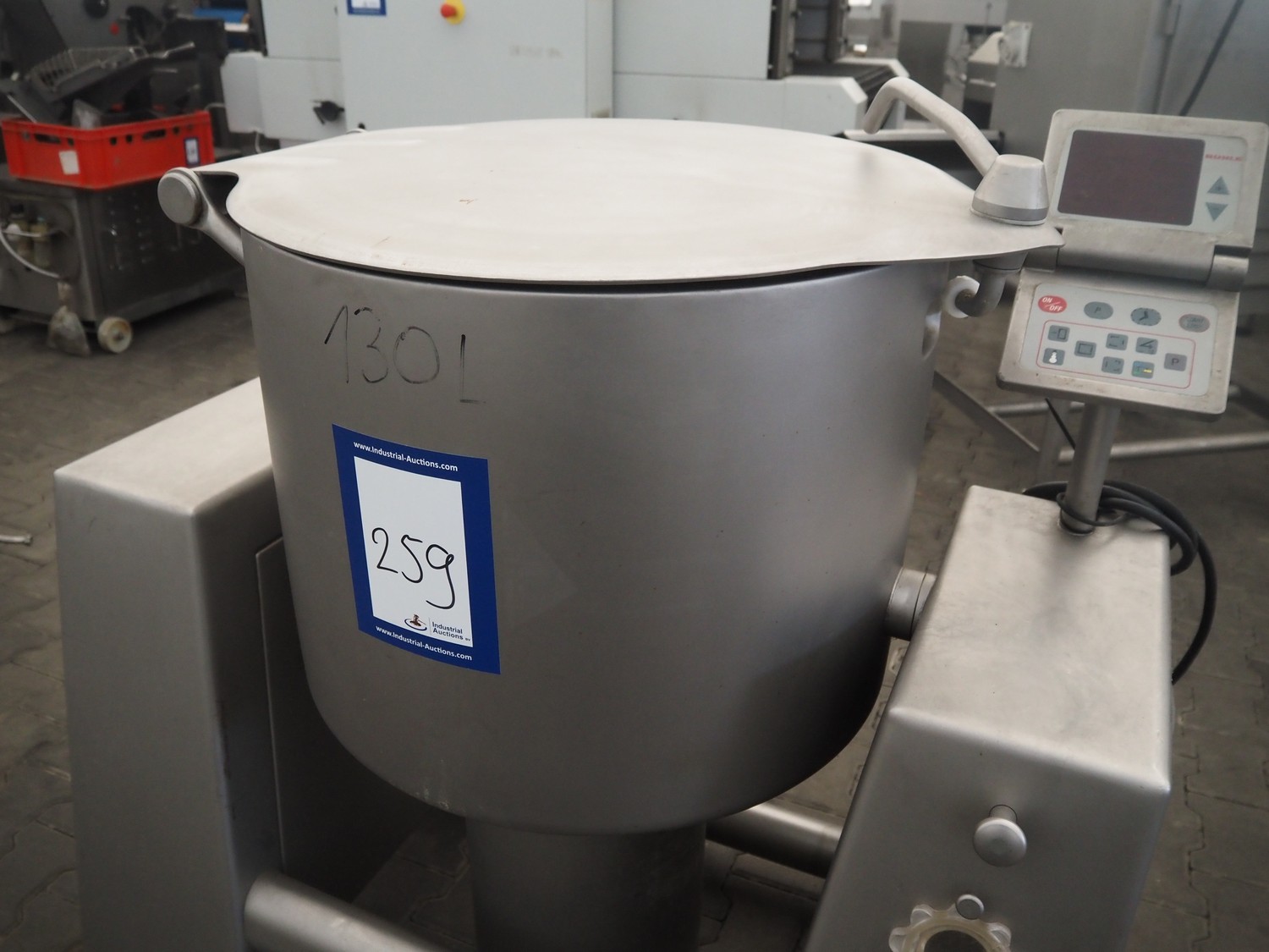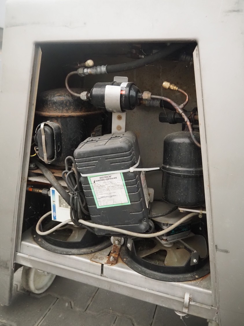 Rühle mobile cooled vacuum tumbler, type: MKR 130, number: 506, 380 V, 3 Ph, 50 Hz, 3.15 kW, volume: 130 liter, total dimensions: 1150 mm x 750 mm x 1250 mm. Missing cover