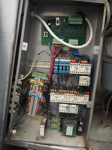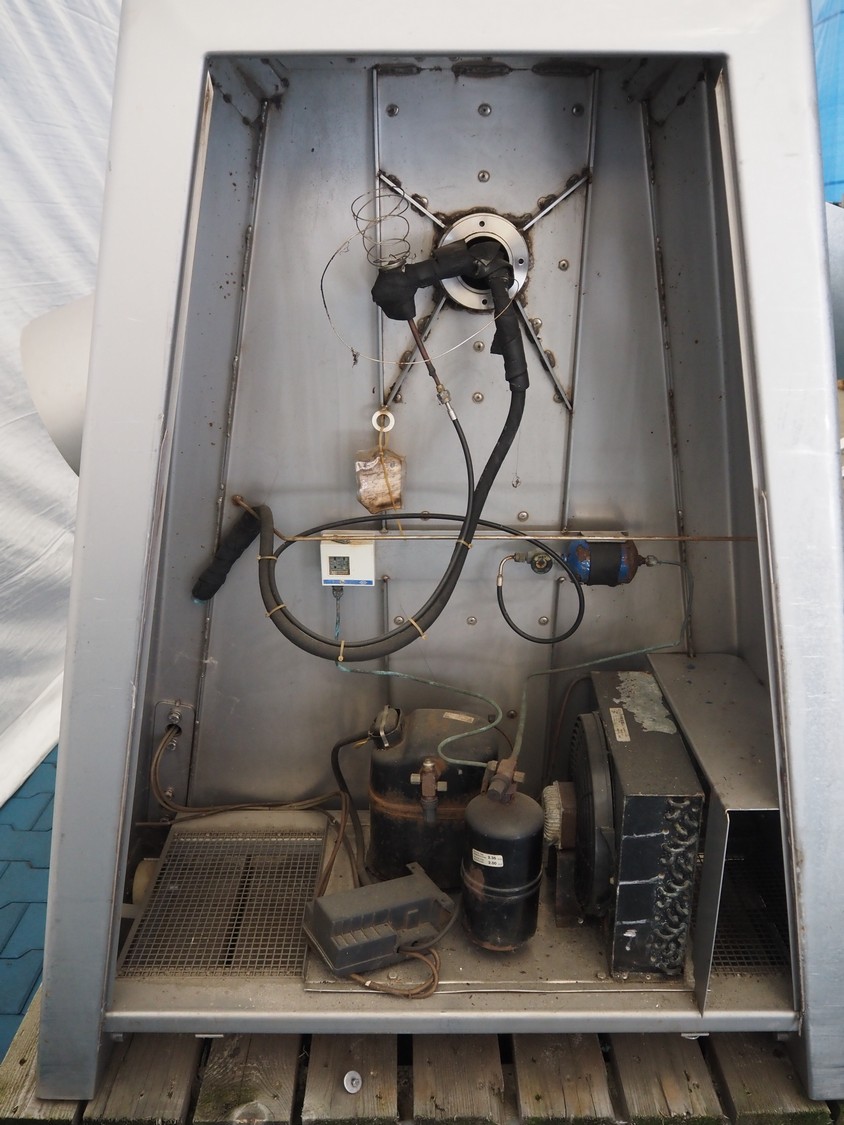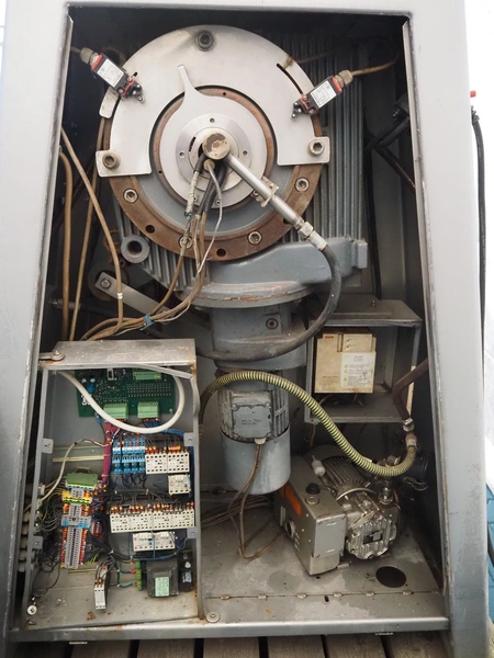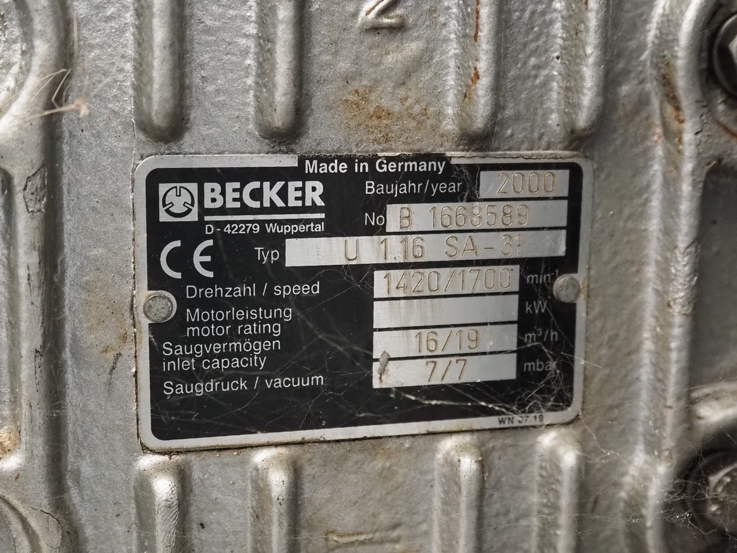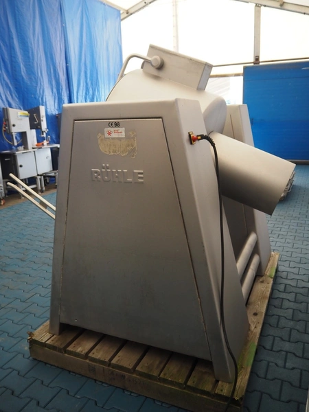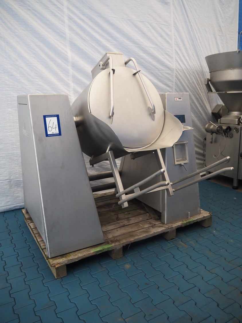 Rühle cooled vacuum tumbler with lifter for 200 liter meat bins, model: MKR 300, number: 178, Becker vacuum pump, type: U 1.16 SA-31, year of construction: 2000, capacity: 16/19 m³ per hour, dimensions: 2000 mm x 1250 mm x 3000 mm.