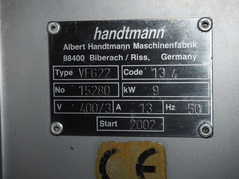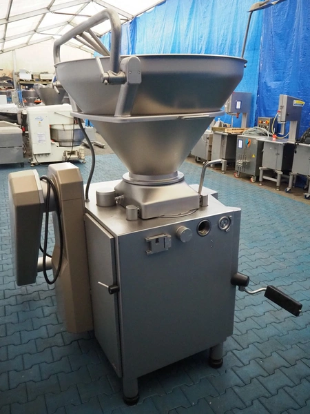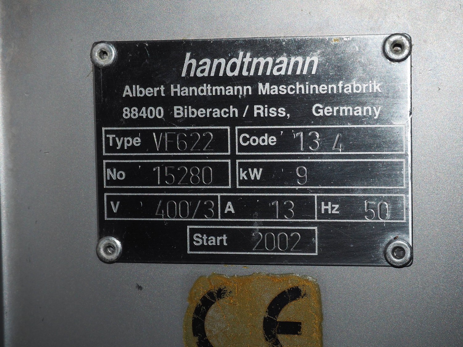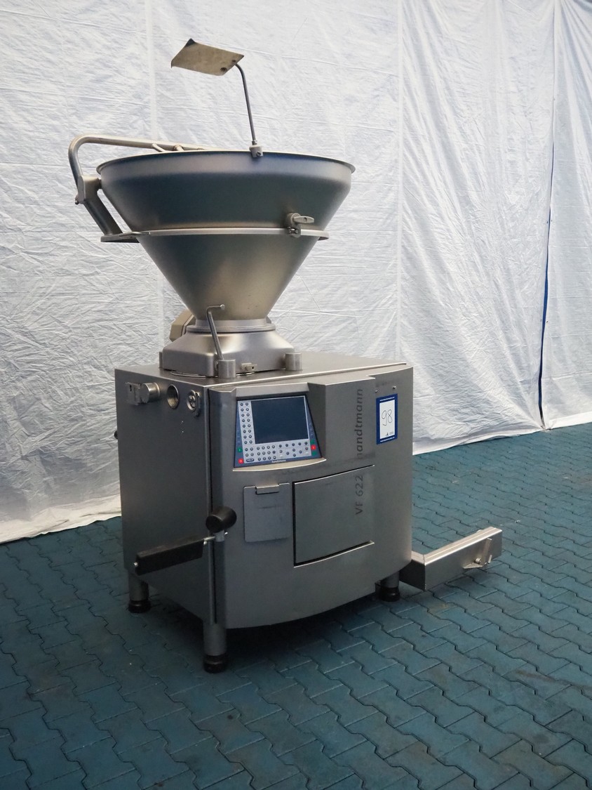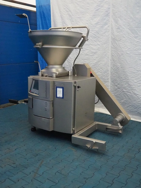 Handtmann vacuum filling machine with lifter for meat bins, type: VF622, number: 15280, year of construction: 2002, 400 V, 3 Ph, 50 Hz, 13 A, 9 kW, Busch vacuum pump, type: KB 0040 D, number: 060098007, year of construction: 2009, capacity: 40 m³ per hour, dimensions: 1750 mm x 1000 mm x 1400 mm.