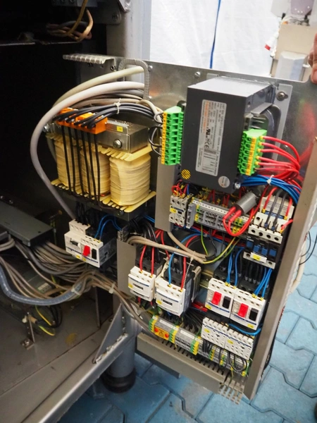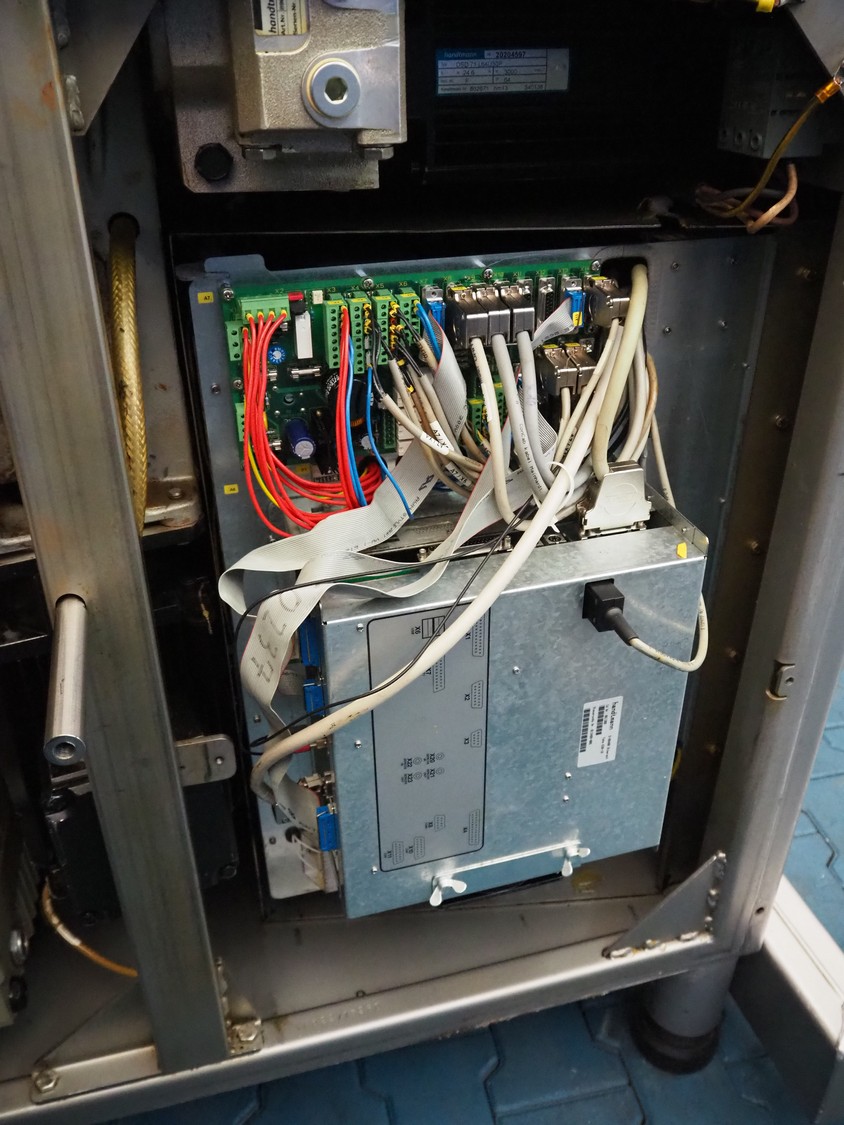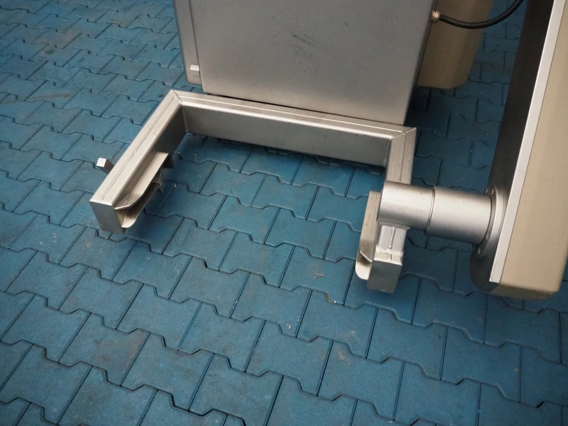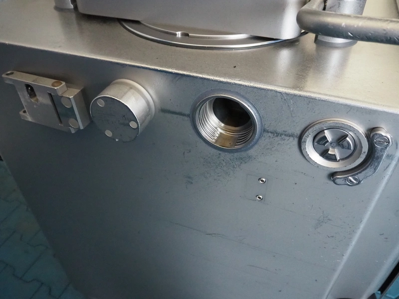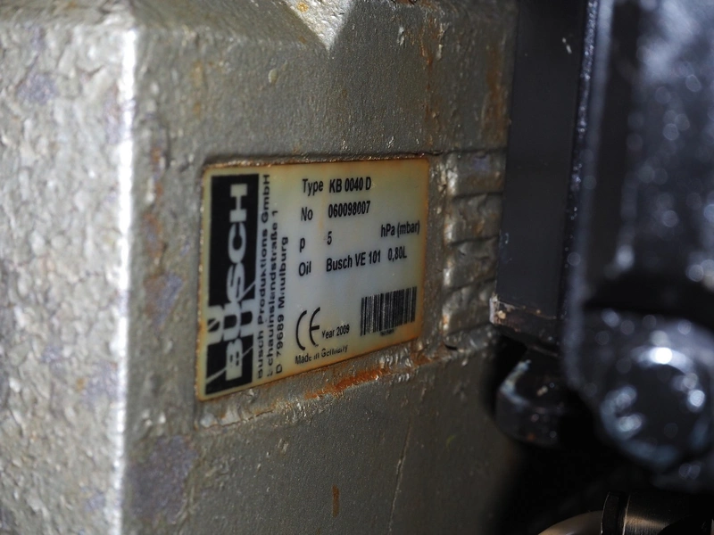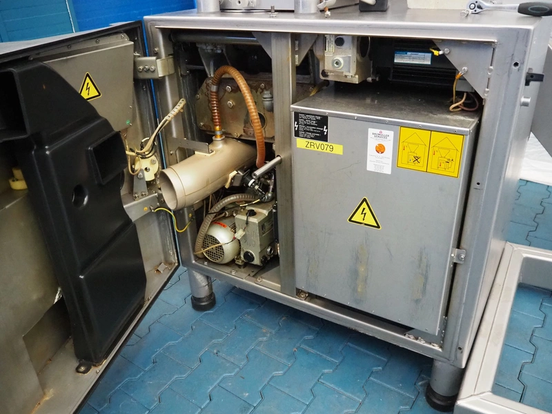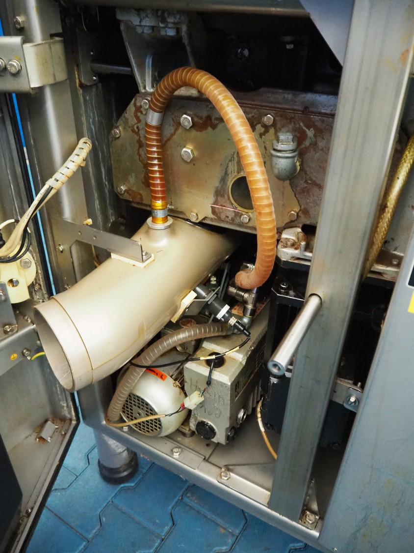 Handtmann vacuum filling machine with lifter for meat bins, type: VF622, number: 15280, year of construction: 2002, 400 V, 3 Ph, 50 Hz, 13 A, 9 kW, Busch vacuum pump, type: KB 0040 D, number: 060098007, year of construction: 2009, capacity: 40 m³ per hour, dimensions: 1750 mm x 1000 mm x 1400 mm.