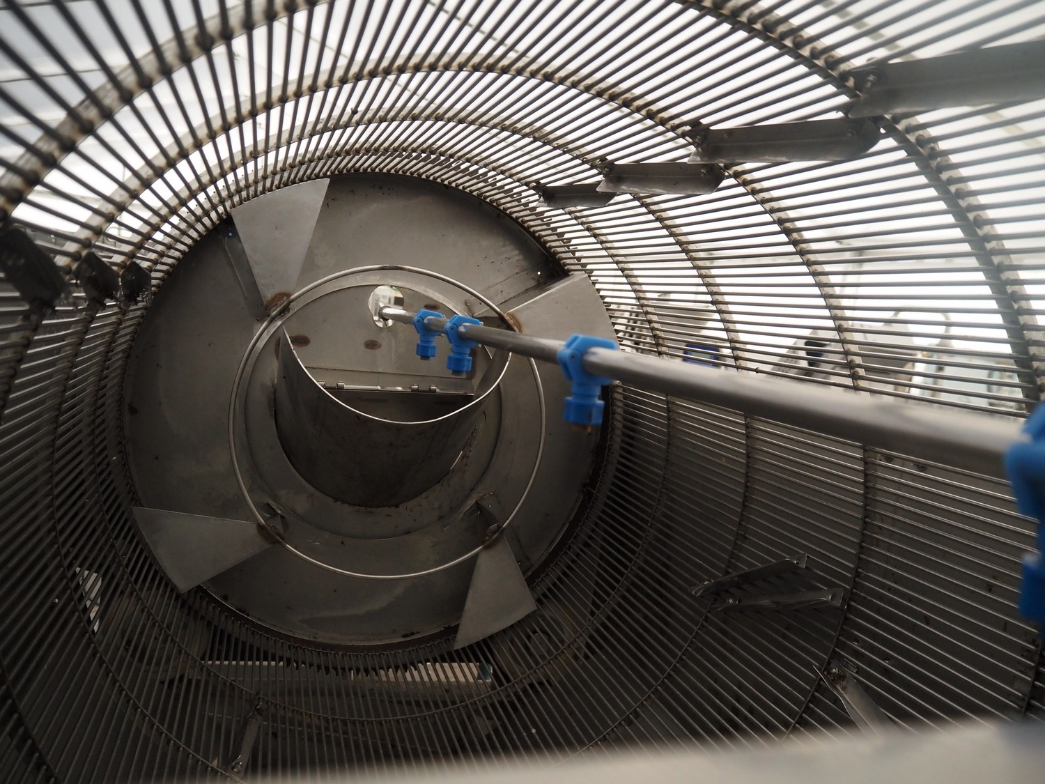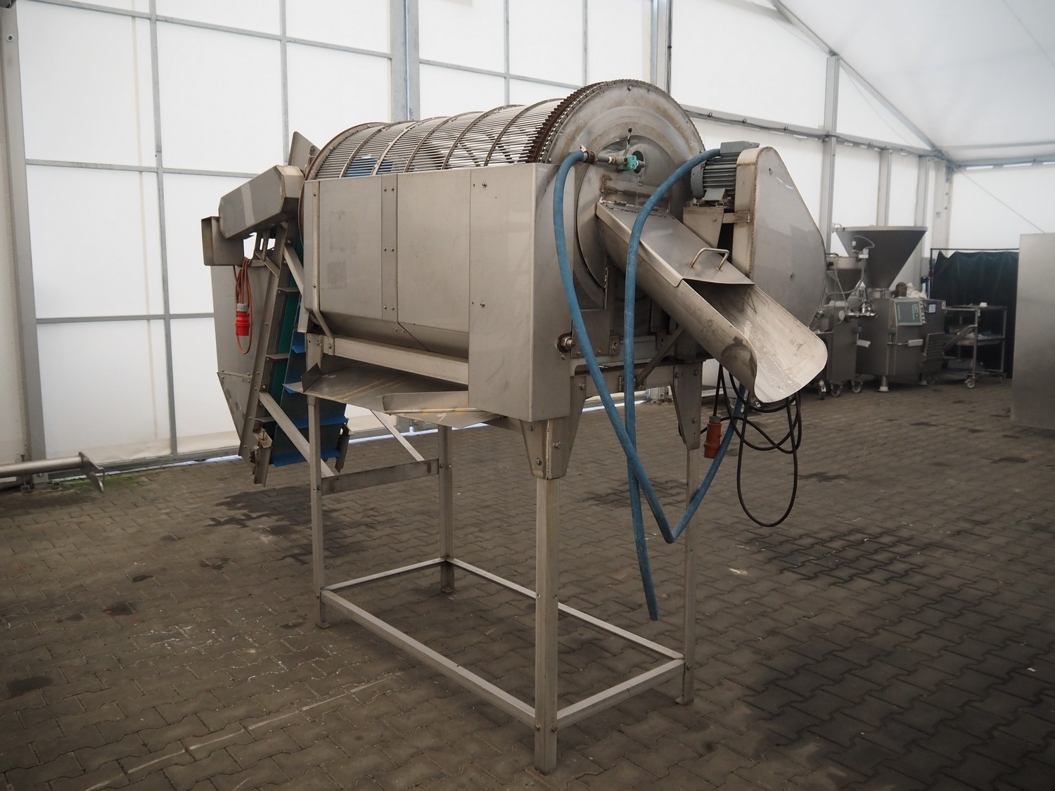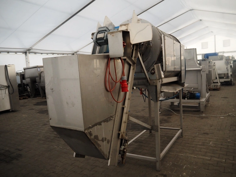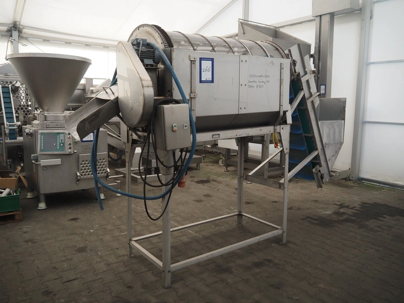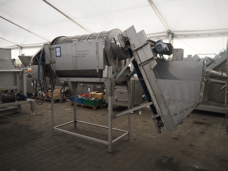 S/s washing drum with elevating belt, belt width: 370 mm, divider height: 60 mm, distance between dividers: 200 mm, diameter drum: 800 mm, total dimensions: 3700 mm x 1250 mm x 2230 mm.