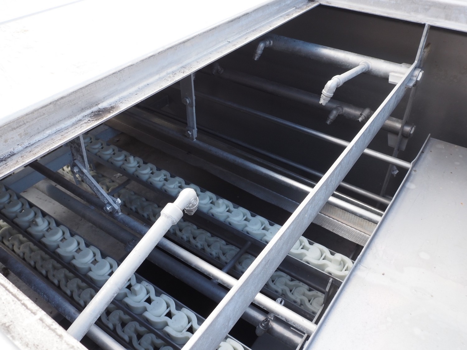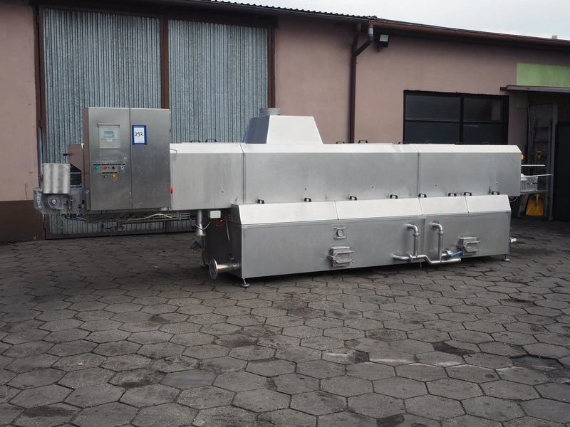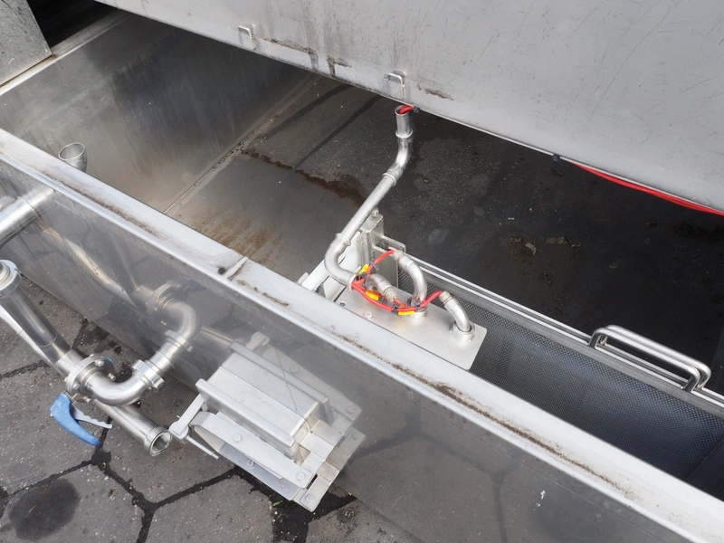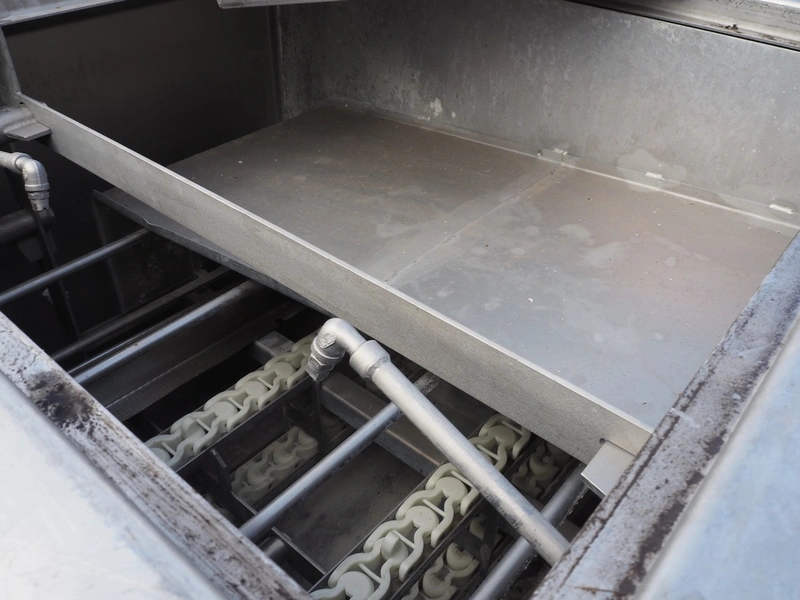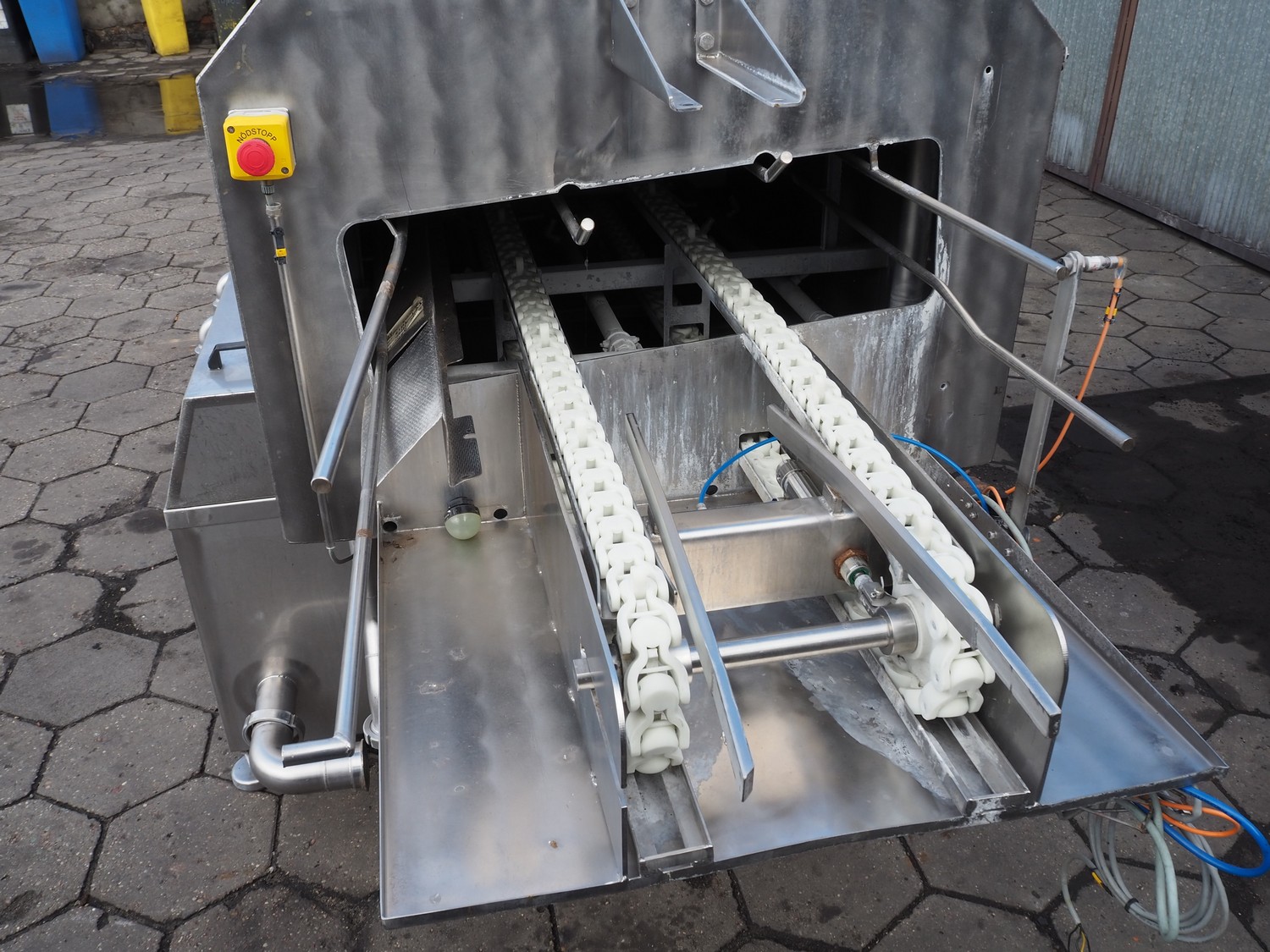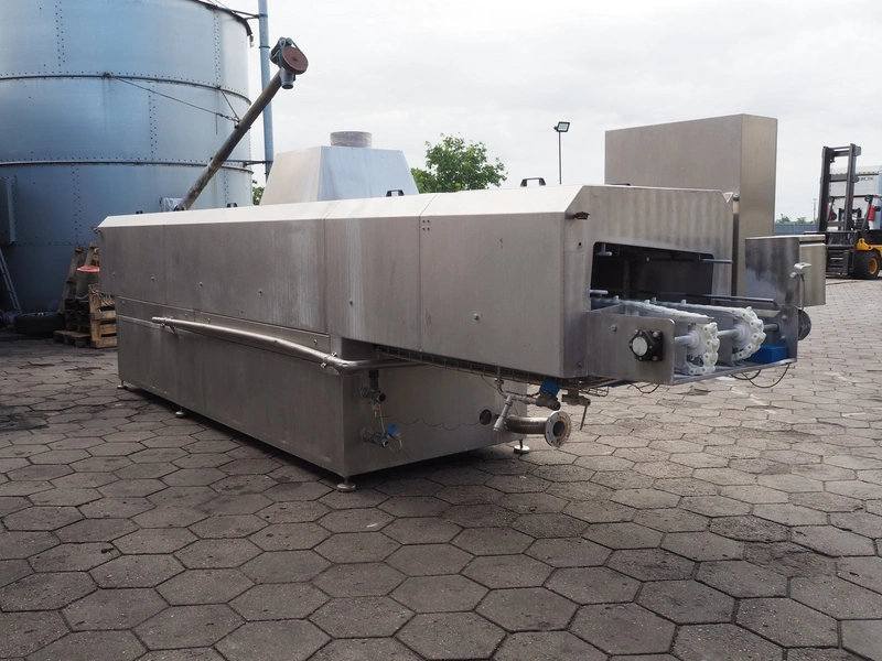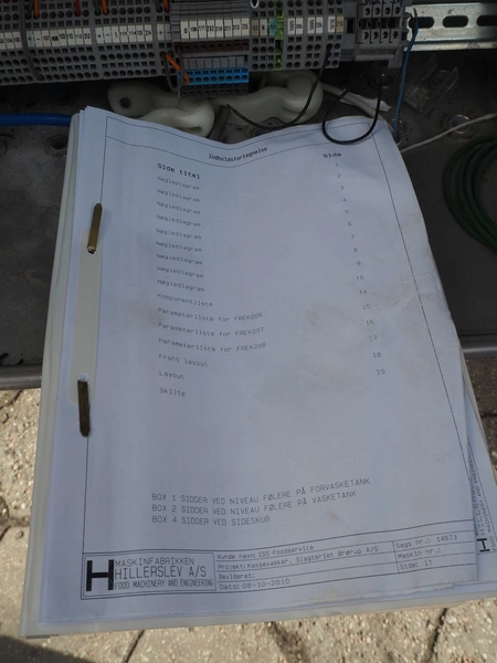 Maskinfabrikken Hillerslev a/s crate washer, plastic chain belt, belt width: 350 mm, clearance: 650 mm x 200 mm, total dimensions: 7300 mm x 1500 mm x 2000 mm.