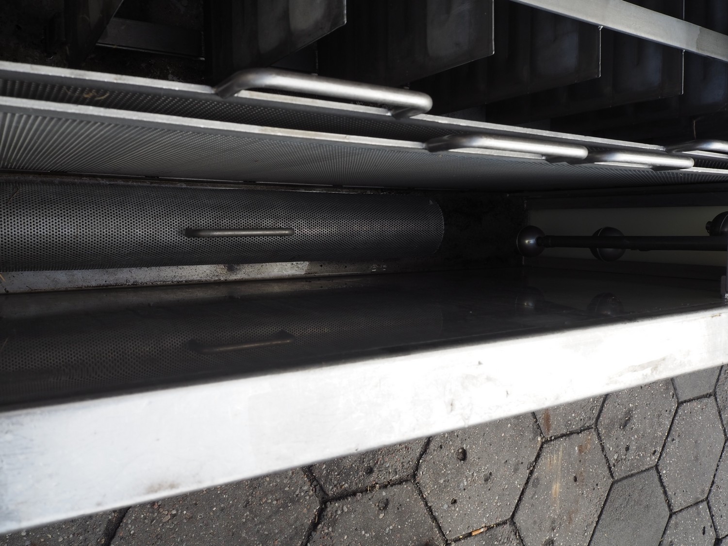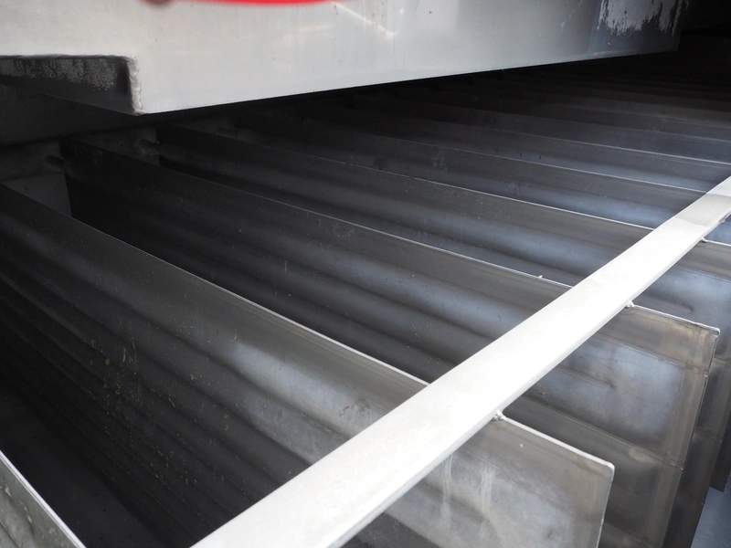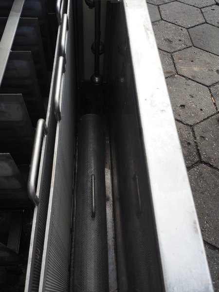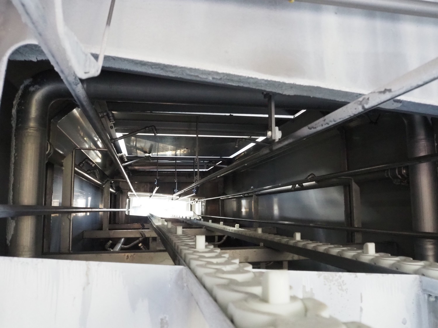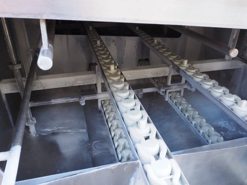 Maskinfabrikken Hillerslev a/s crate washer, plastic chain belt, belt width: 350 mm, clearance: 650 mm x 200 mm, total dimensions: 7300 mm x 1500 mm x 2000 mm.
