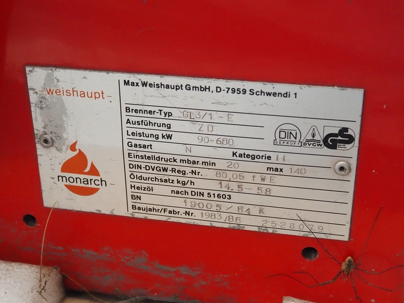 Max Weishaupt GmbH burner, type: GL3/1-E, serial number: 2528079, year of construction: 1983, 90-680 kW, 20-140 bar,14.5-58 kg per hour, dimensions: 1100 mm x 700 mm x 500 mm.