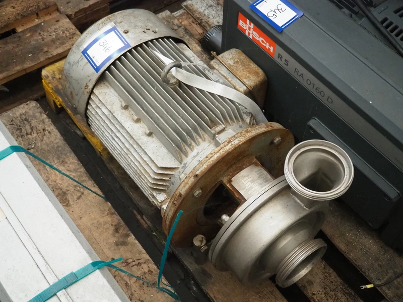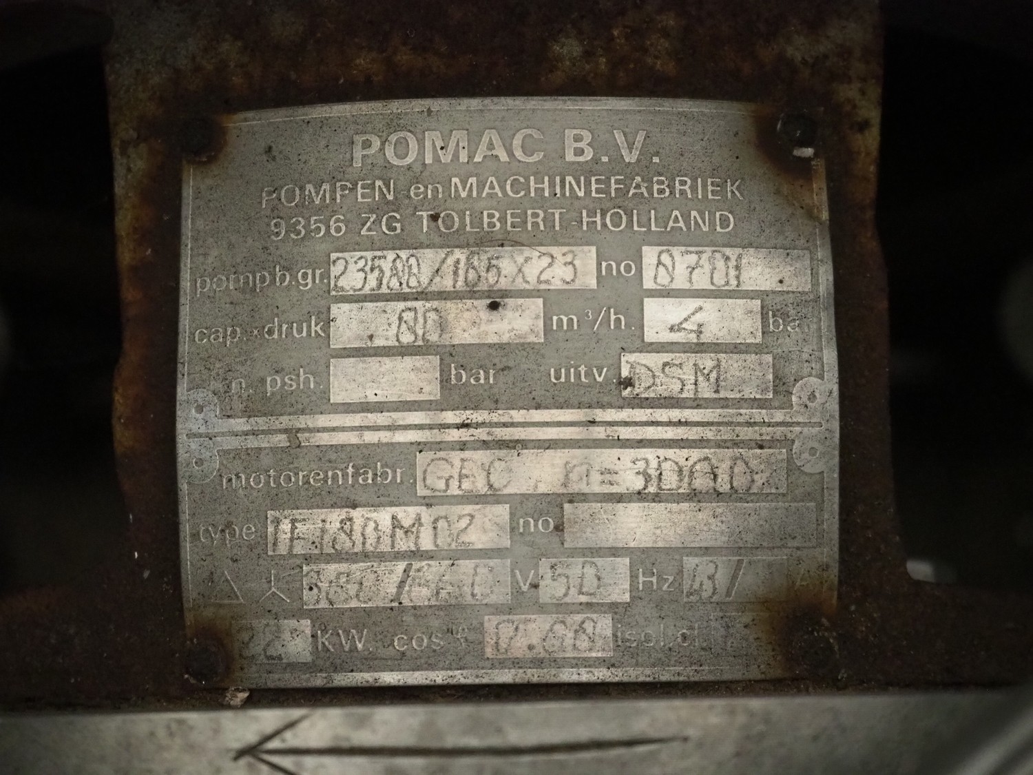 Pomac B.V. centrifugal pump, type: 1FMOM07, serial number: 8701, 380/660 V, 50 Hz, capacity: 80 m³ per hour, dimensions: 720 mm x 400 mm x 400 mm.