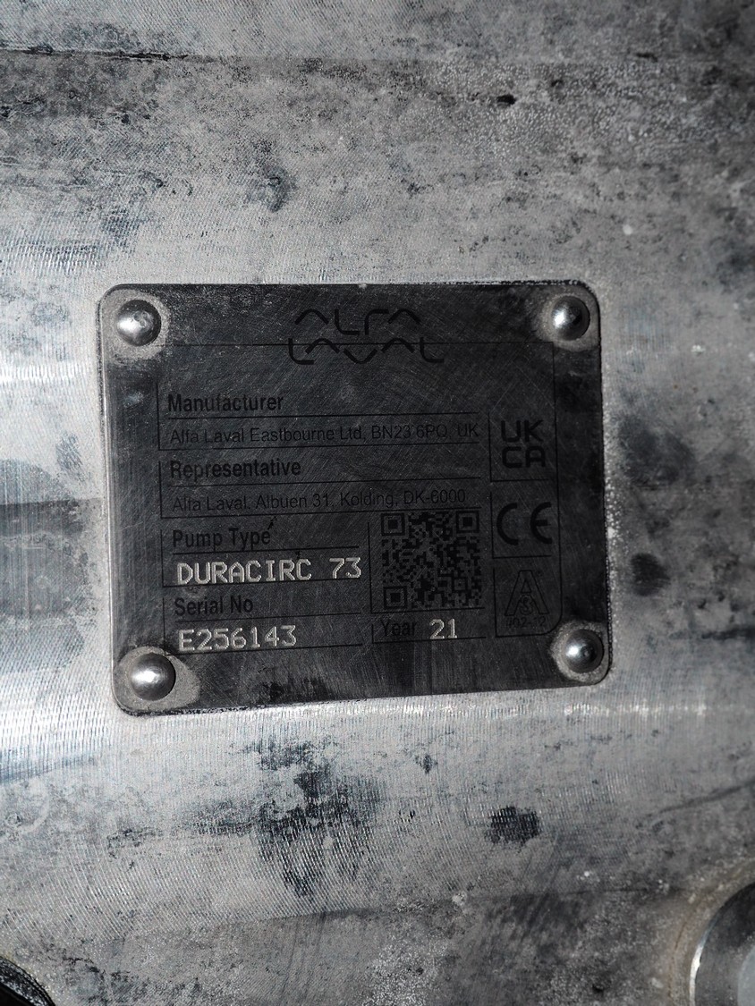 Alfa Laval circumferential piston pump, pump type: DURACIRC 73, serial number: E256143, year of construction: 2021, dimensions: 1600 mm x 600 mm x 800 mm.
