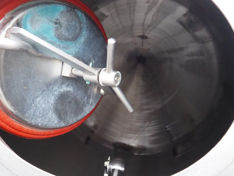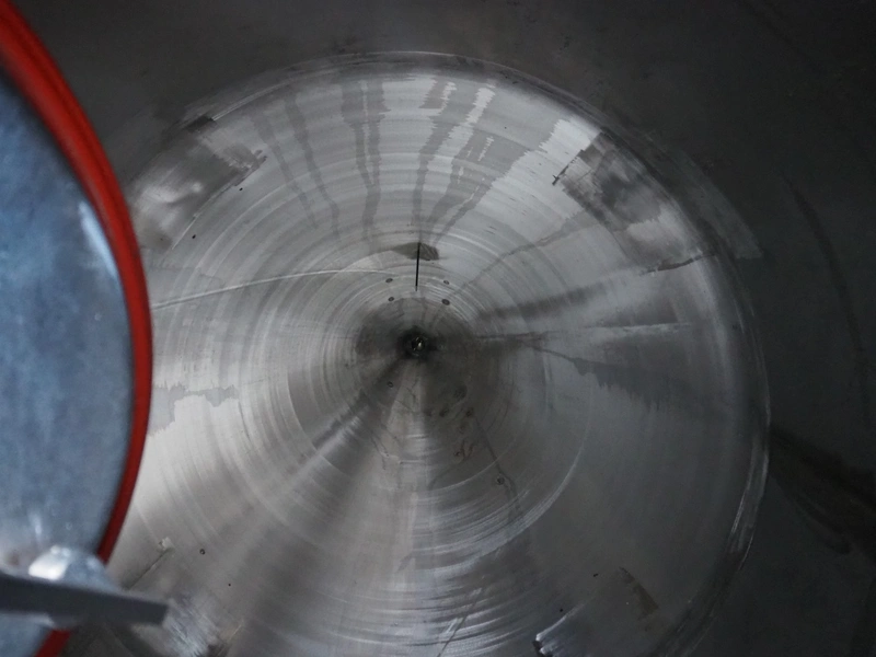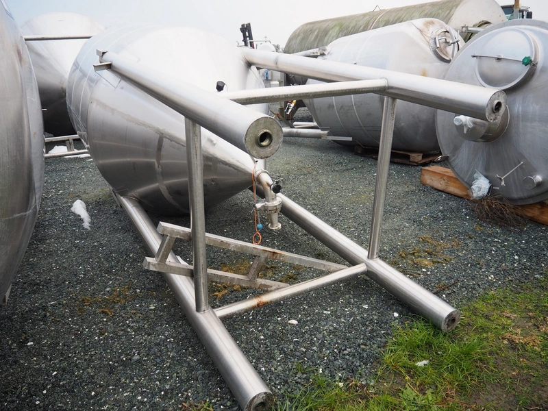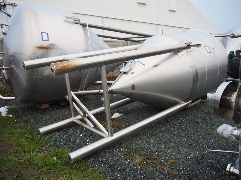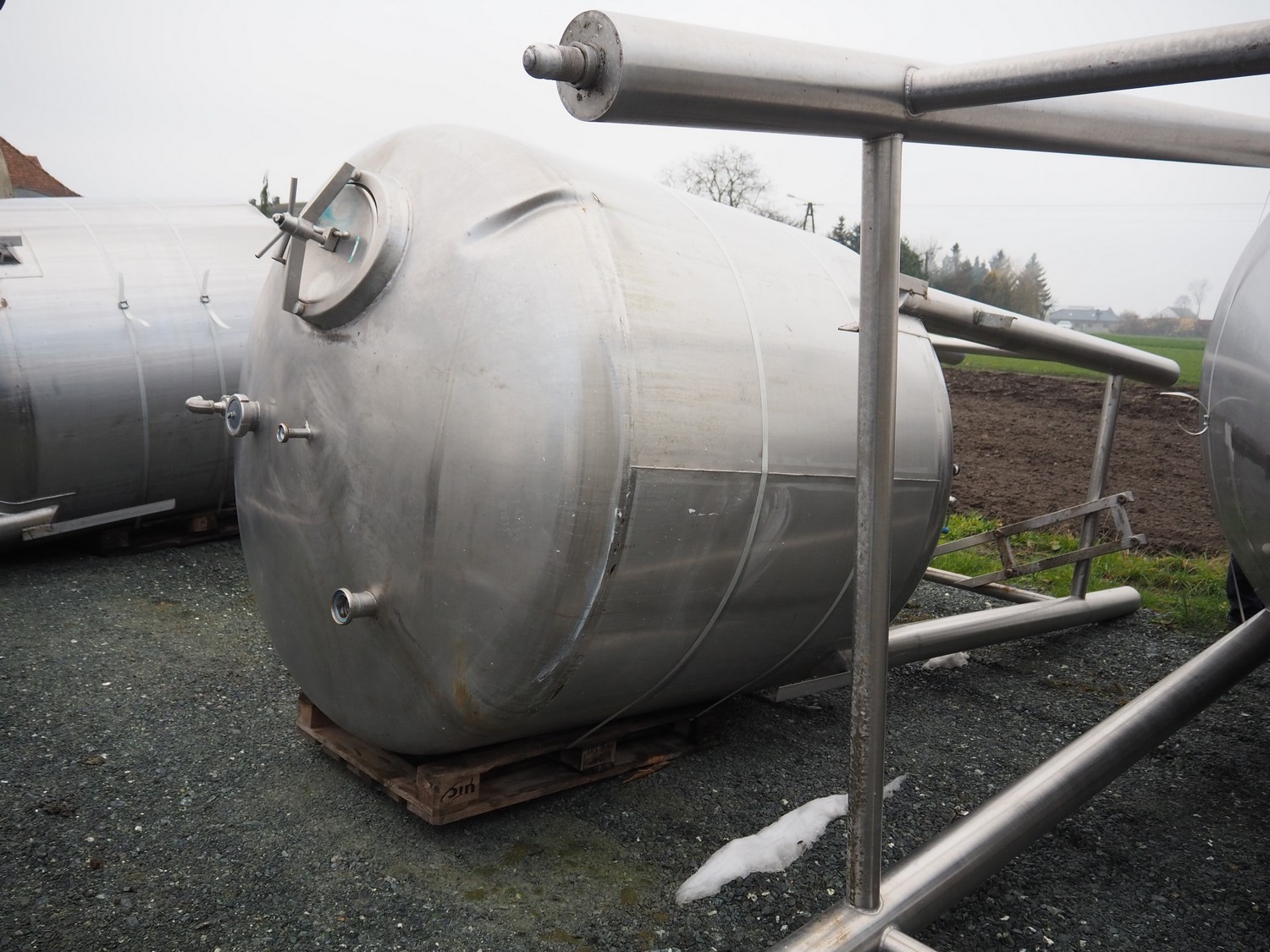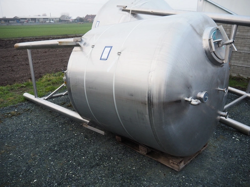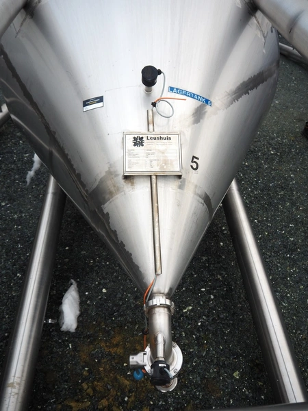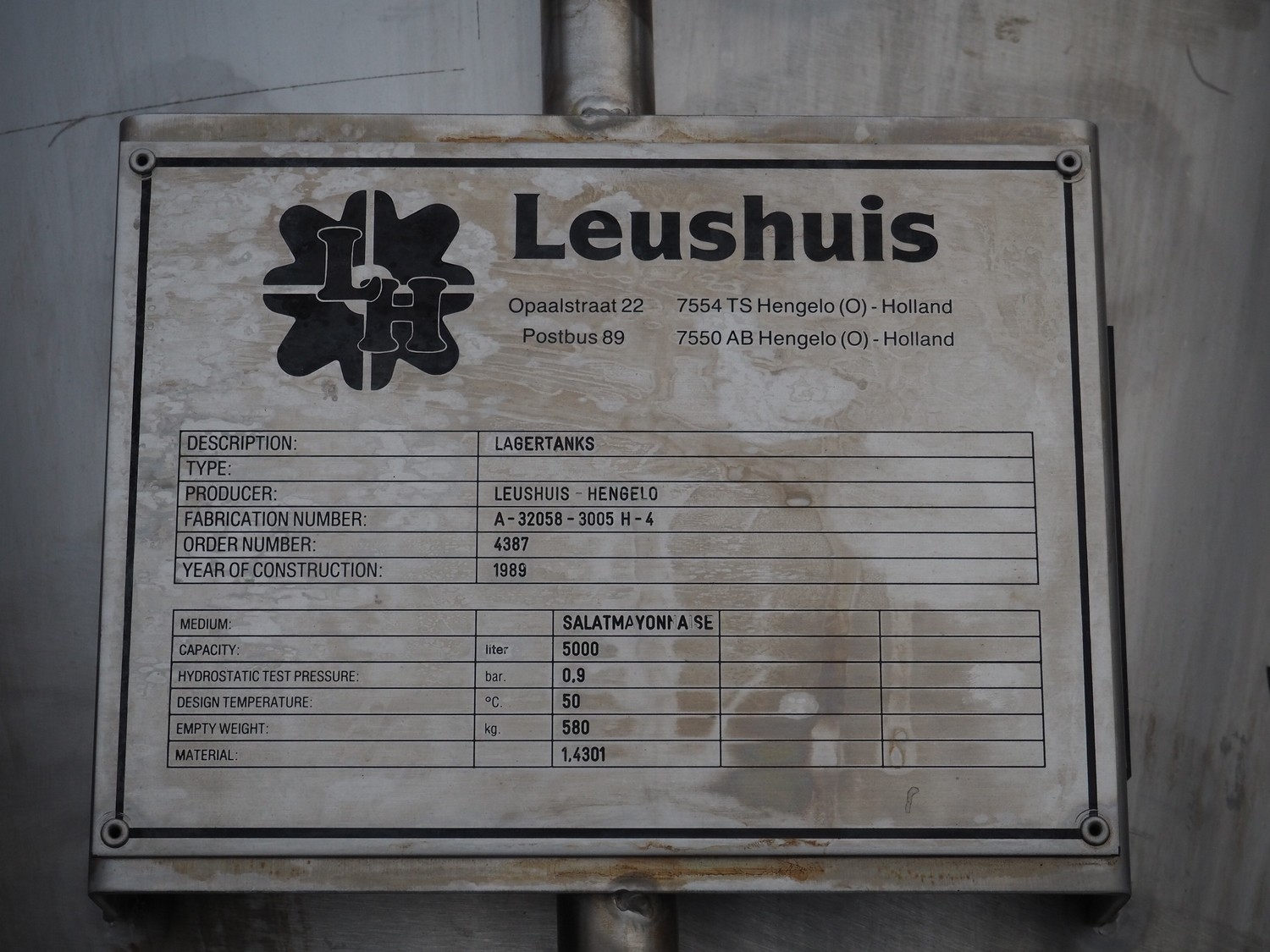 Leushuis s/s storage tank for mayonnaise, fabrication number: A-32058-3005 H-4, year of construction: 1989, medium: Salatmayonnaise, capacity: 5000 liter, hydrostatic test pressure: 0.9 bar, design temperature: 50 °C, empty weight: 580 kg, dimensions: Ø 1800 mm x 4900 mm. Tank is damaged.