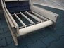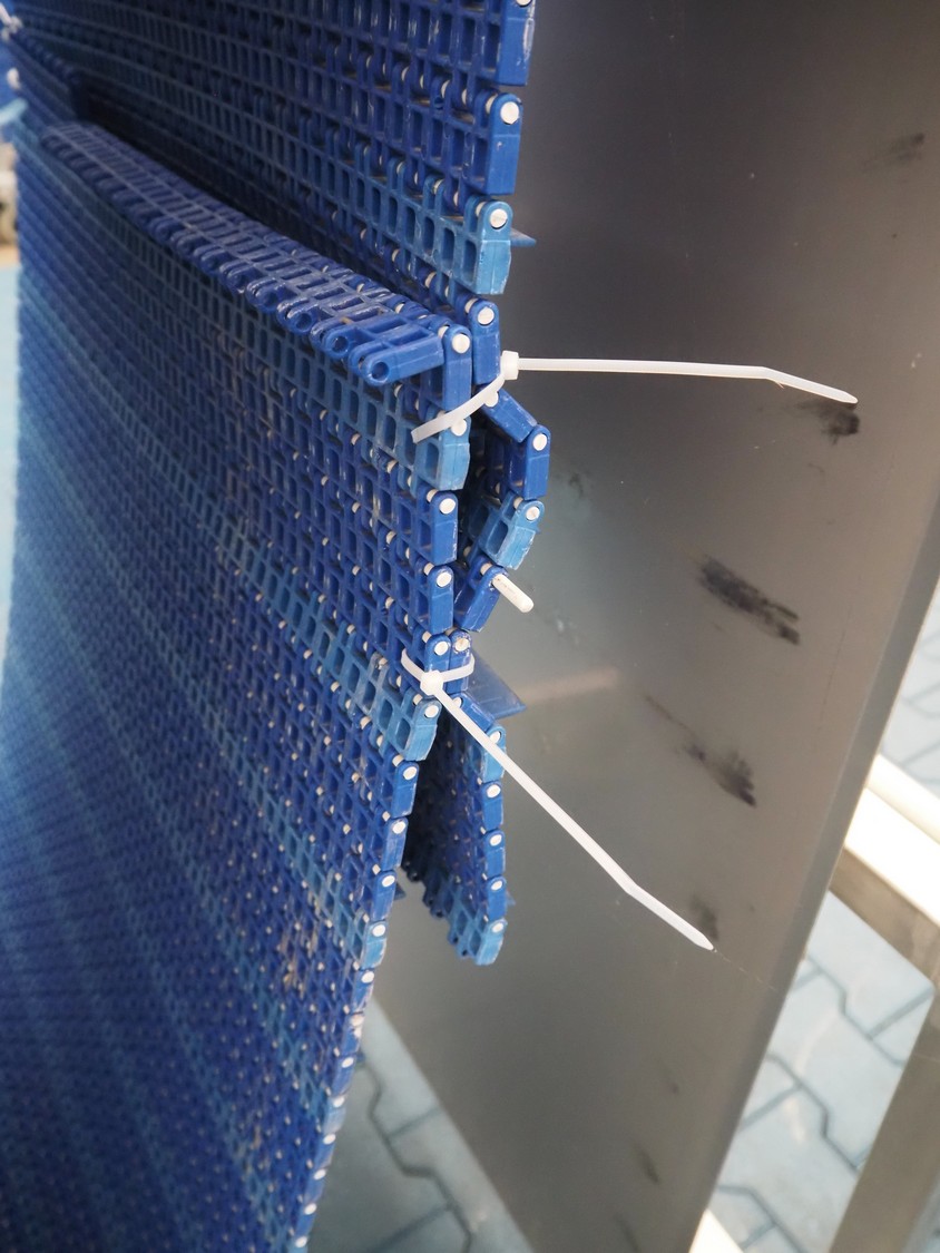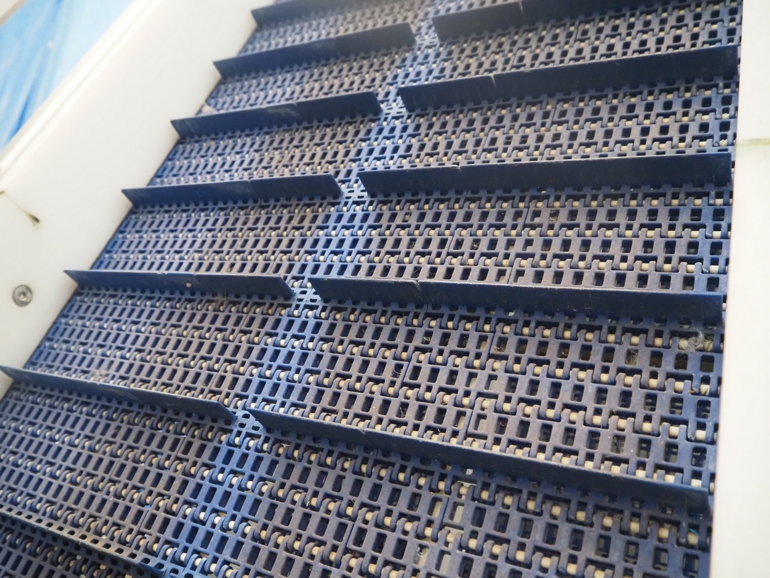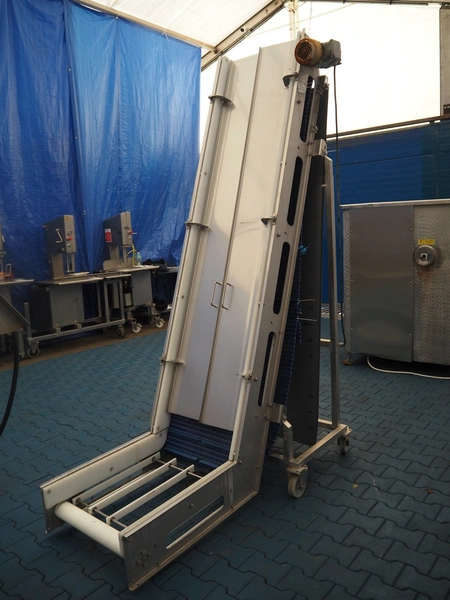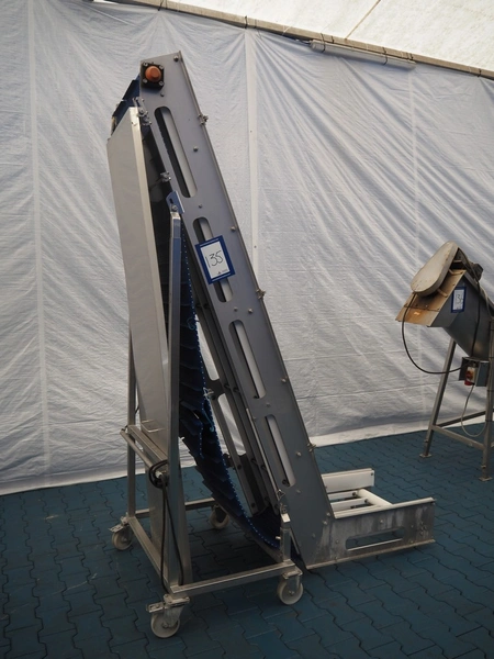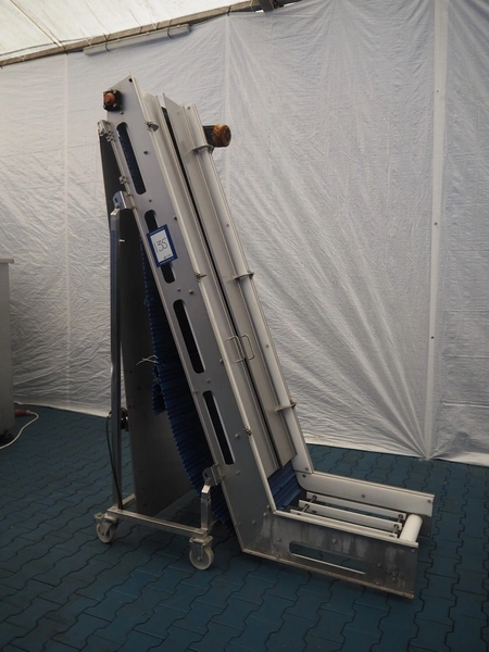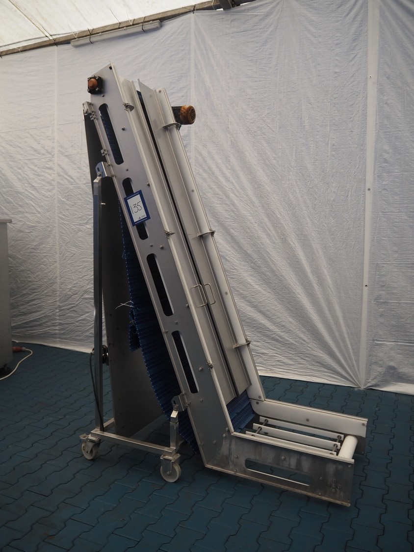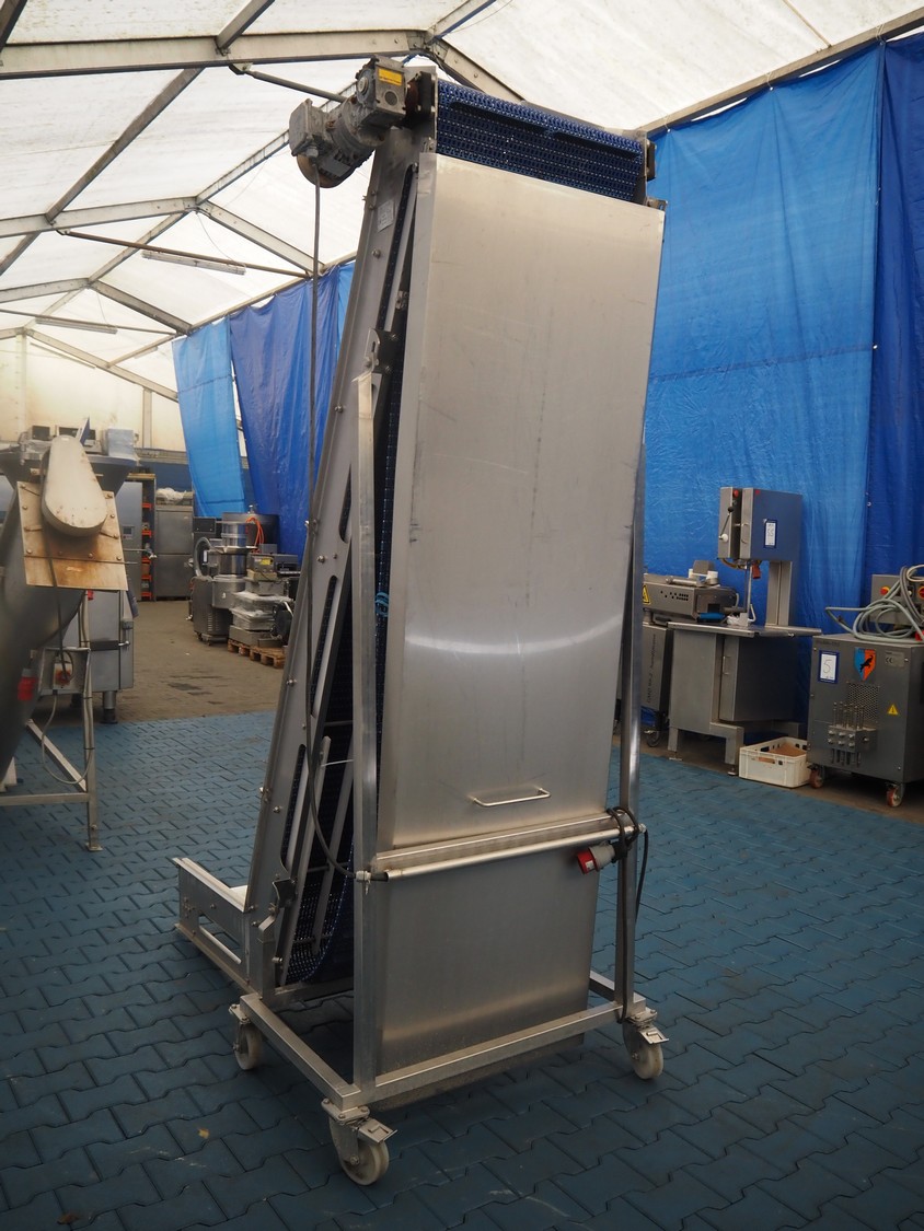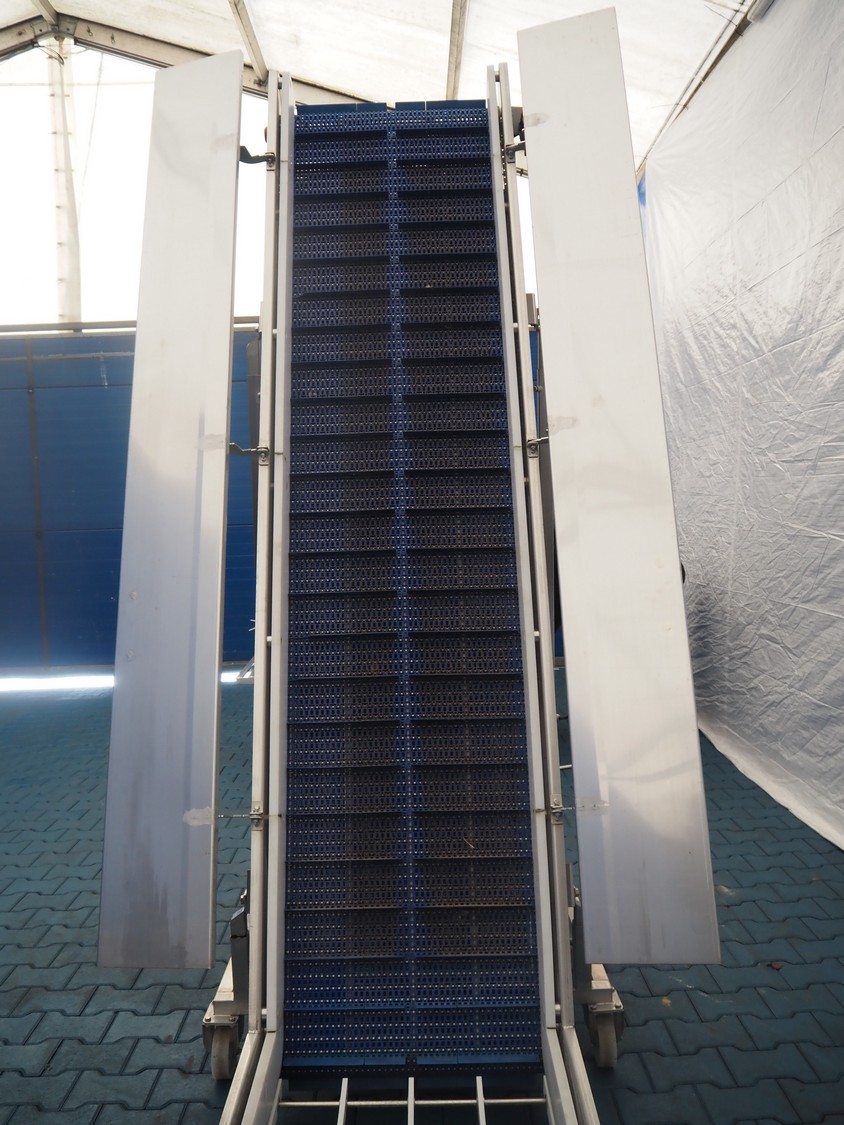 Setu AB mobile elevating belt with dividers, s/s frame, model: SUL, serial number: 22503, year of construction: 2011, plastic belt with dividers, belt width: 550, divider height: 30 mm, distance between dividers: 100 mm, elevating height: 2550 mm, total dimensions: 1720 mm x 1000 mm x 2600 mm. Plastic mesh belt broken.
