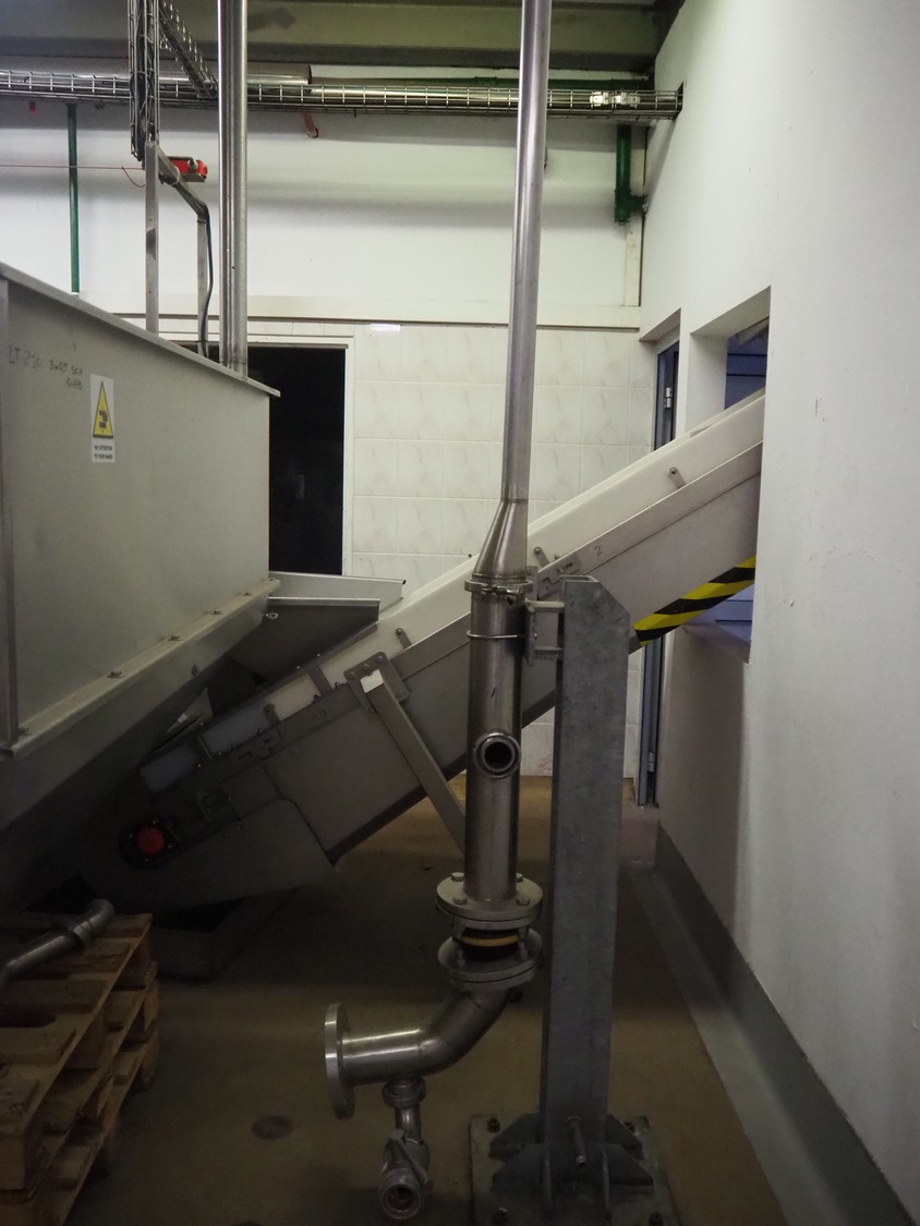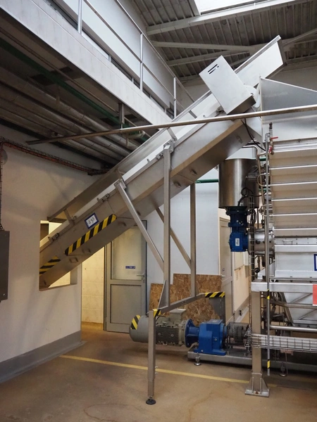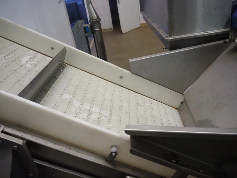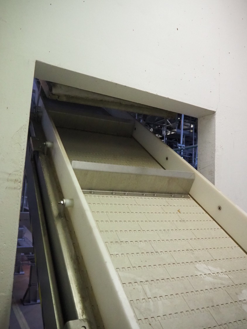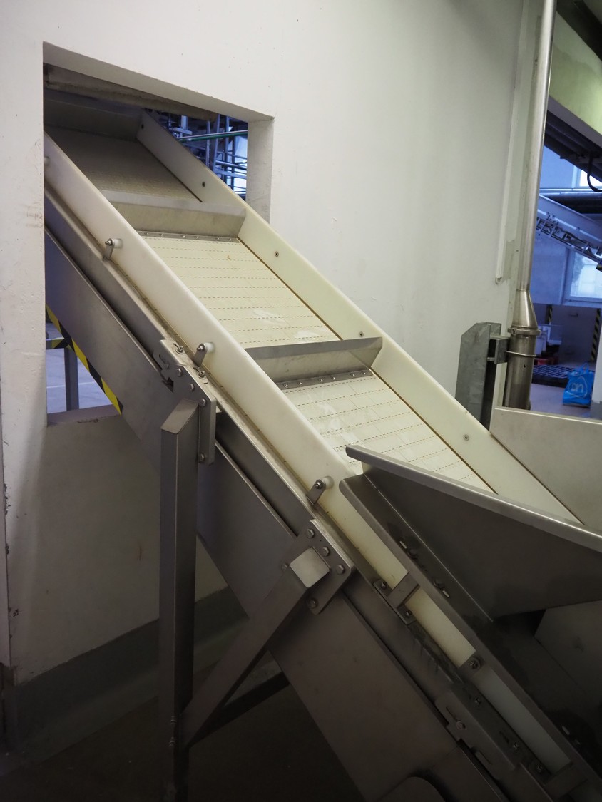 CFT S.p.A. elevating belt, plastic belt with dividers, belt width: 600 mm, divider height: 120 mm, distance between dividers: 700 mm, elevating height: 3100 mm, total dimensions: 5000 mm x 1900 mm x 3900 mm.