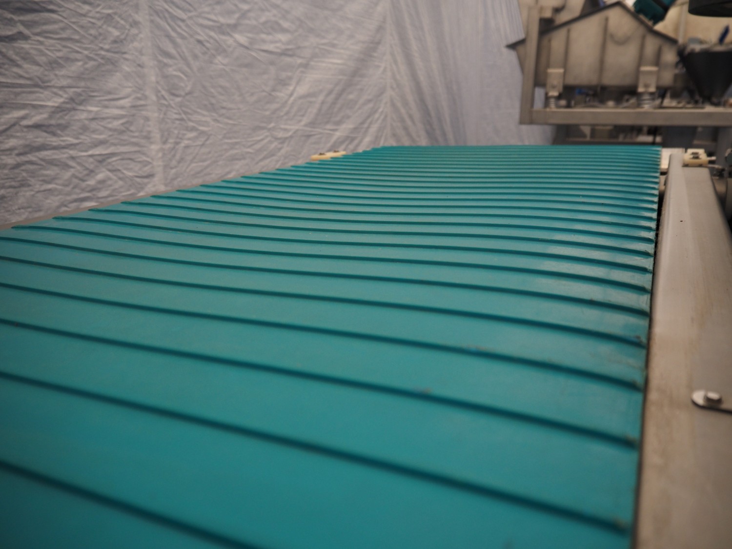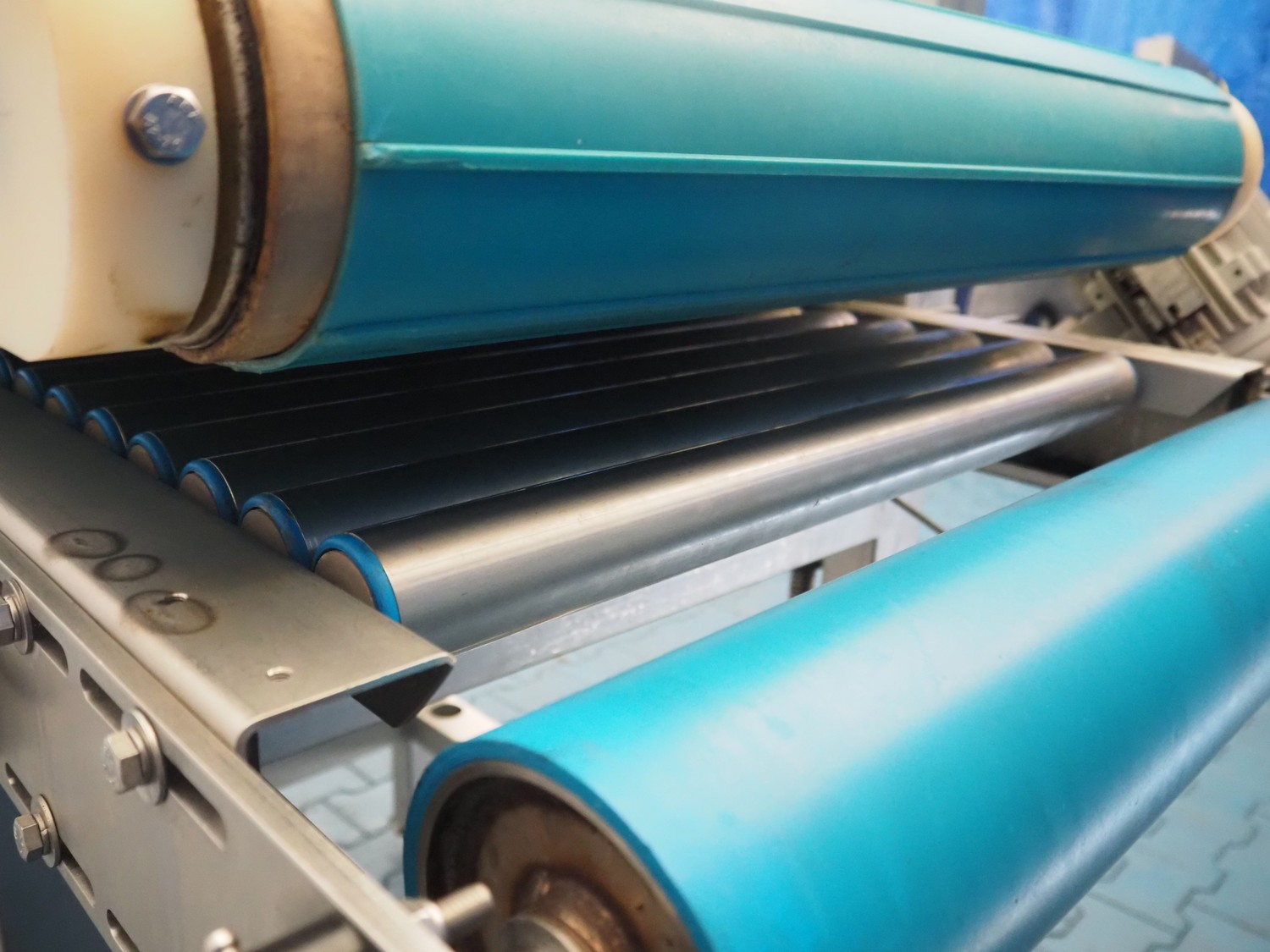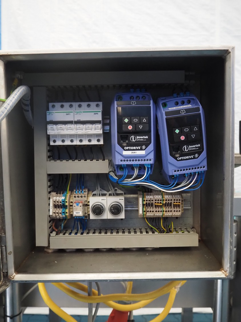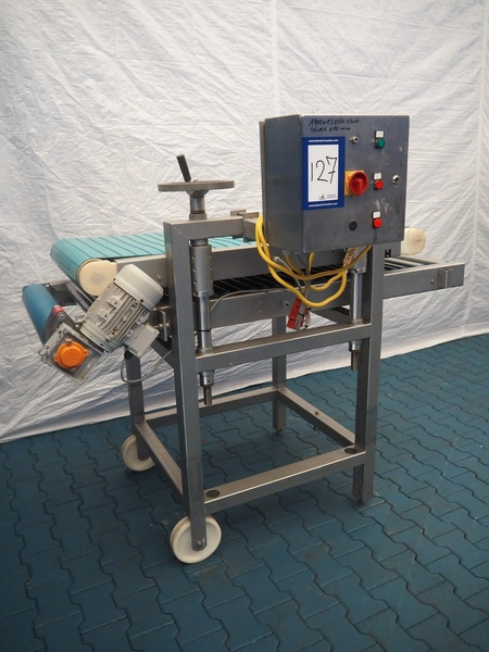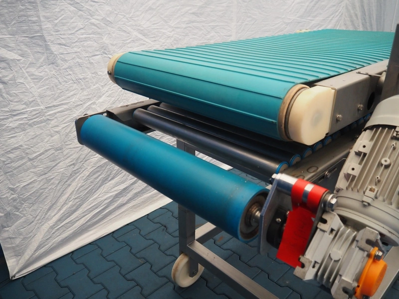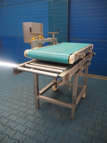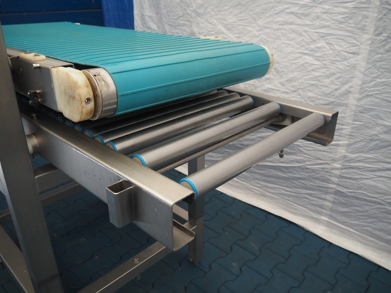 Mobile transport belt with roller conveyor, s/s frame, plastic belt, belt width: 615 mm, s/s rollers, roller width: 590 mm, total dimensions: 1880 mm x 1290 mm x 1660 mm.