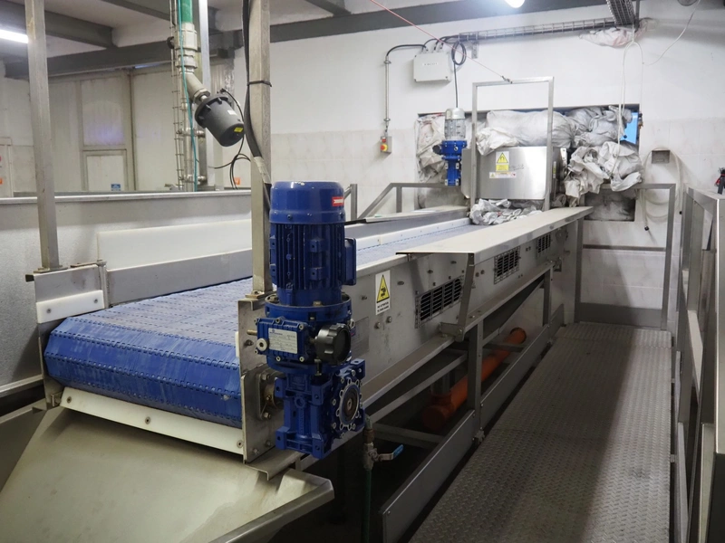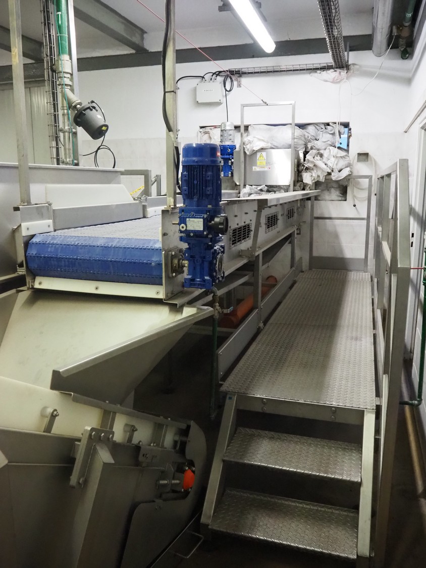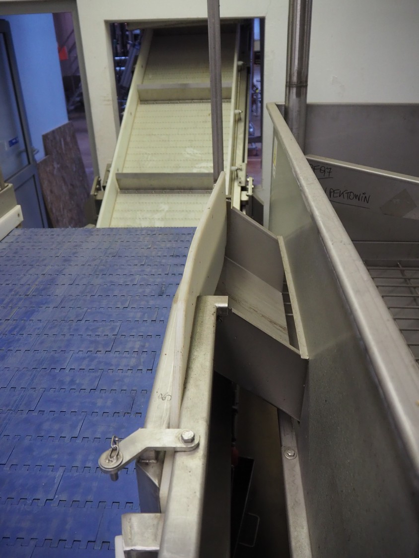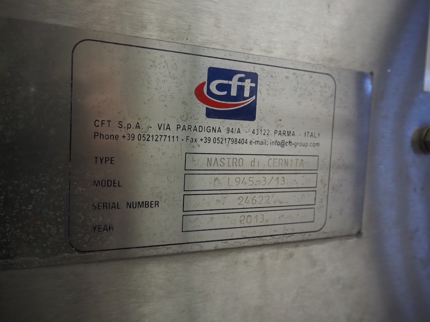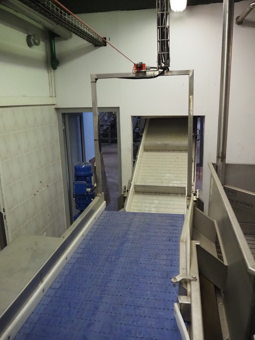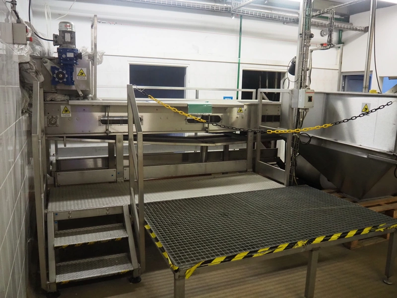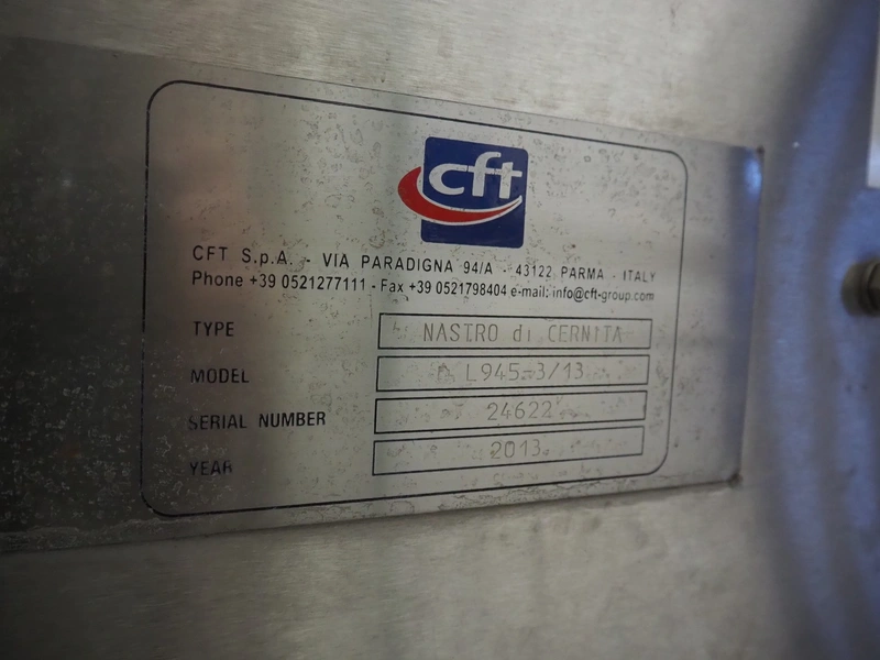 CFT S.p.A. inspection belt with s/s work platform, type: NASTRO di CERNITA, model: L945-3/13, serial number: 24622, year of construction: 2013, plastic belt, belt width: 600 mm, total dimensions: 4200 mm x 2800 mm x 1680 mm.