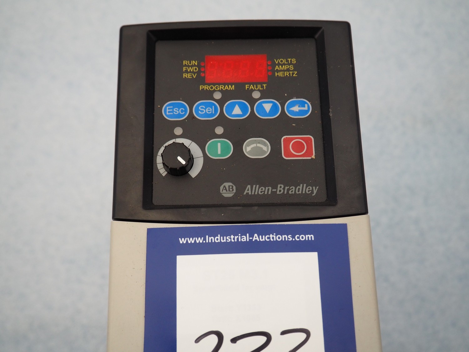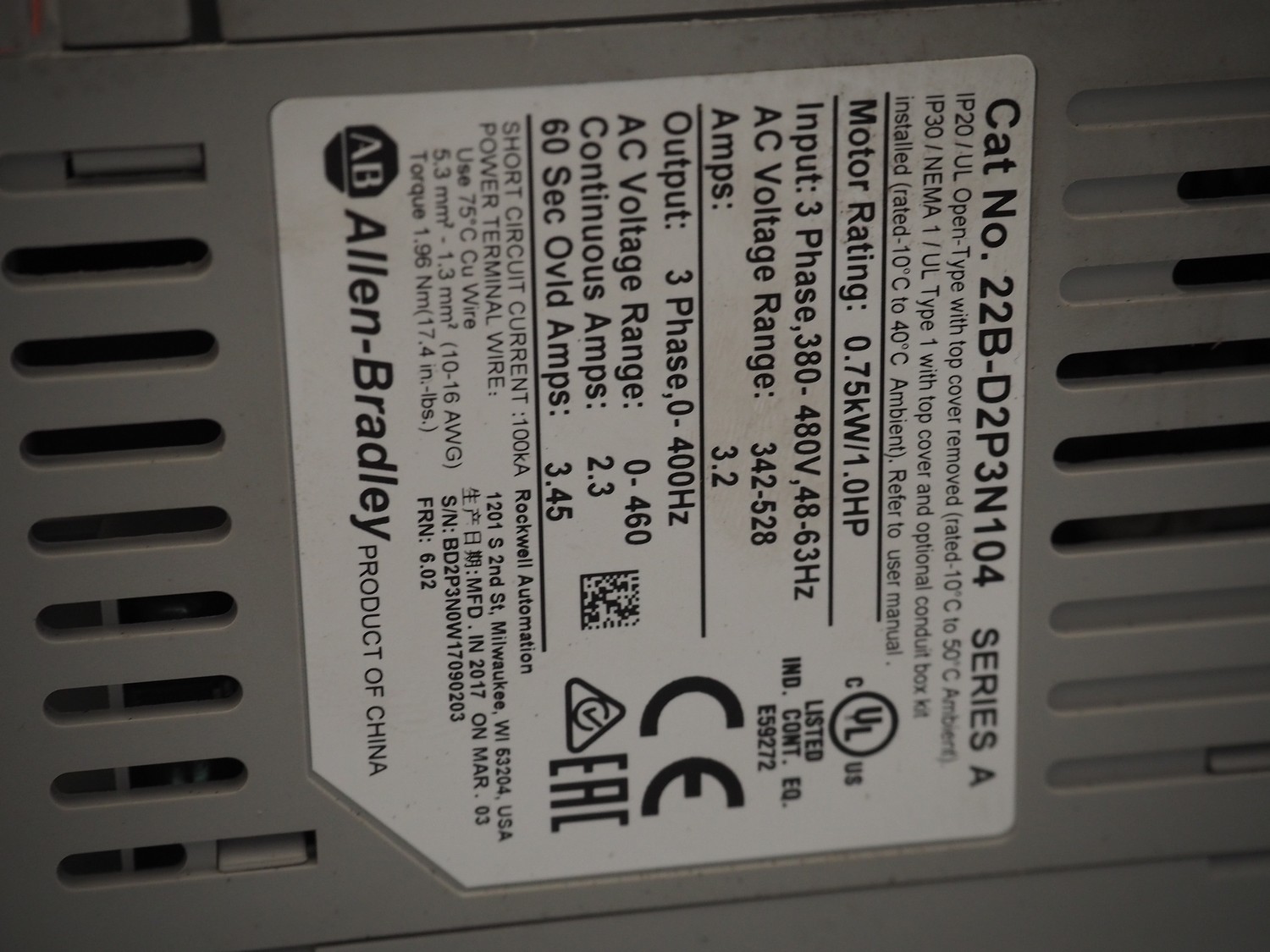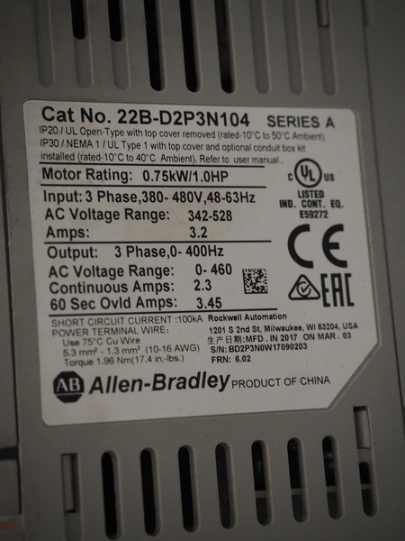 Allen Bradley frequency converter, serial number: BD2P3N0W17090203, 380-480 V, 3 Ph, 48-63 Hz, 3.2 A, 0.75 kW.