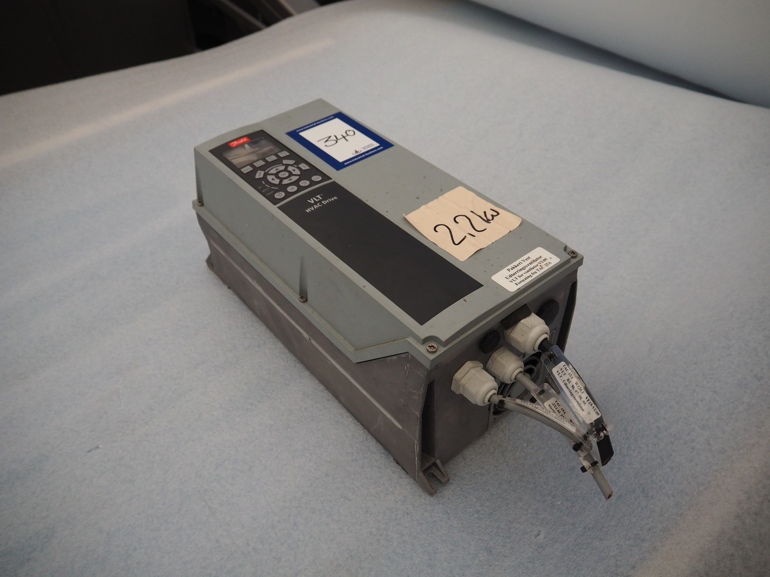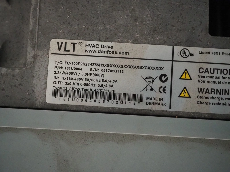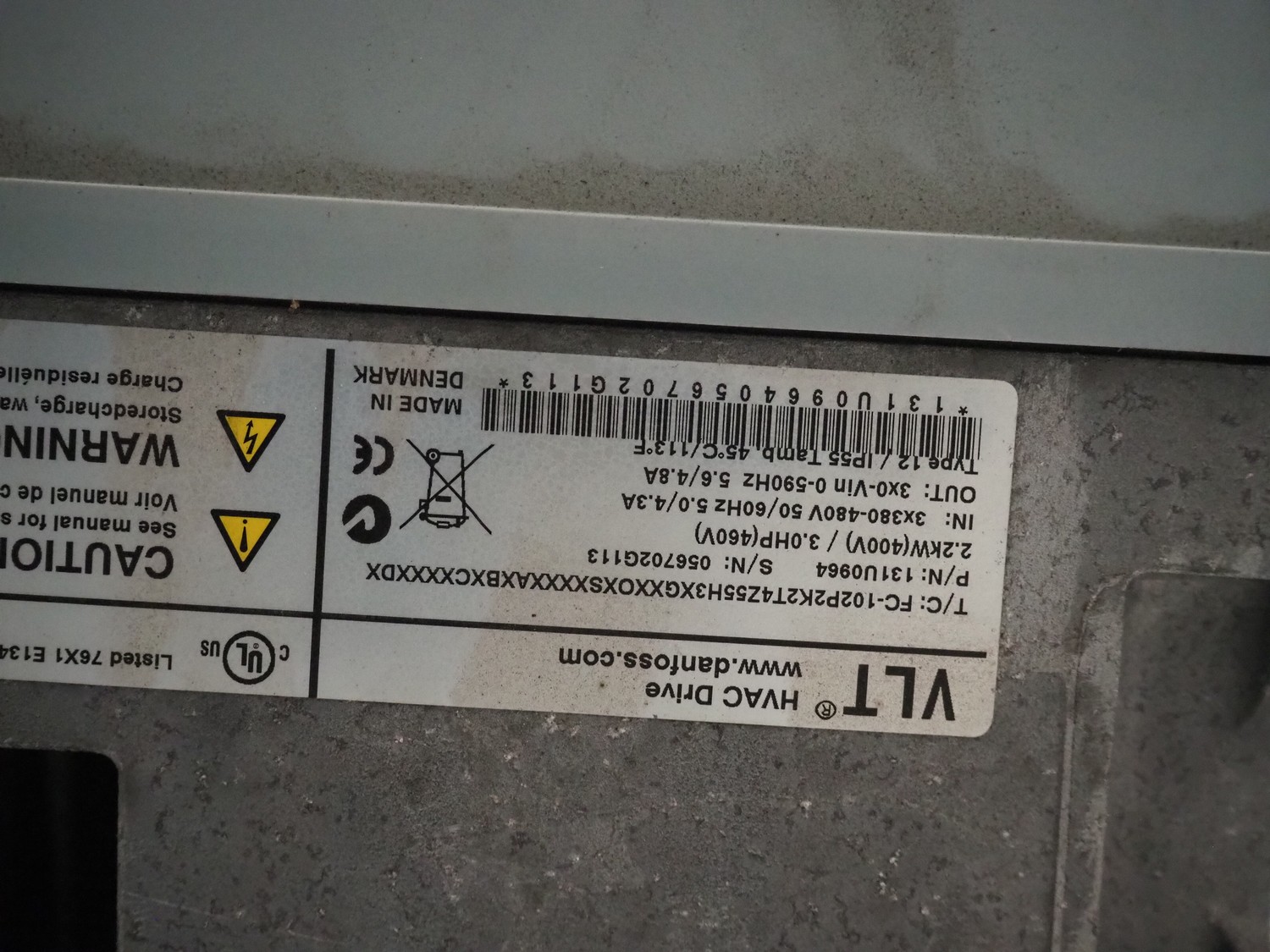 Danfoss frequency converter, model: VLT, serial number: 056702G113, 380-480 V, 3 Ph, 50/60 Hz, 4.7/3.9 A, 2.2 kW.