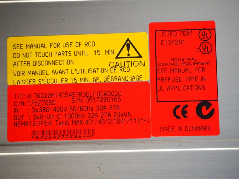 Danfoss frequency converter, model: VLT, serial number: 051729G165, 380-460 V, 3 Ph, 50/60 Hz, 3.8 A.