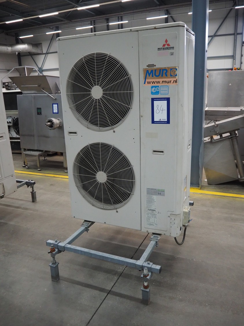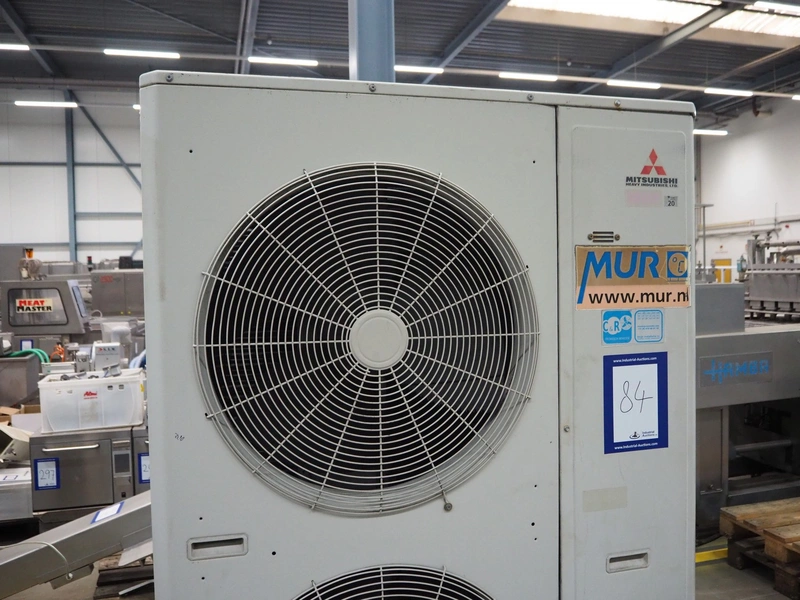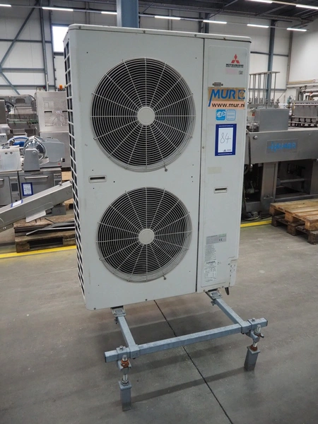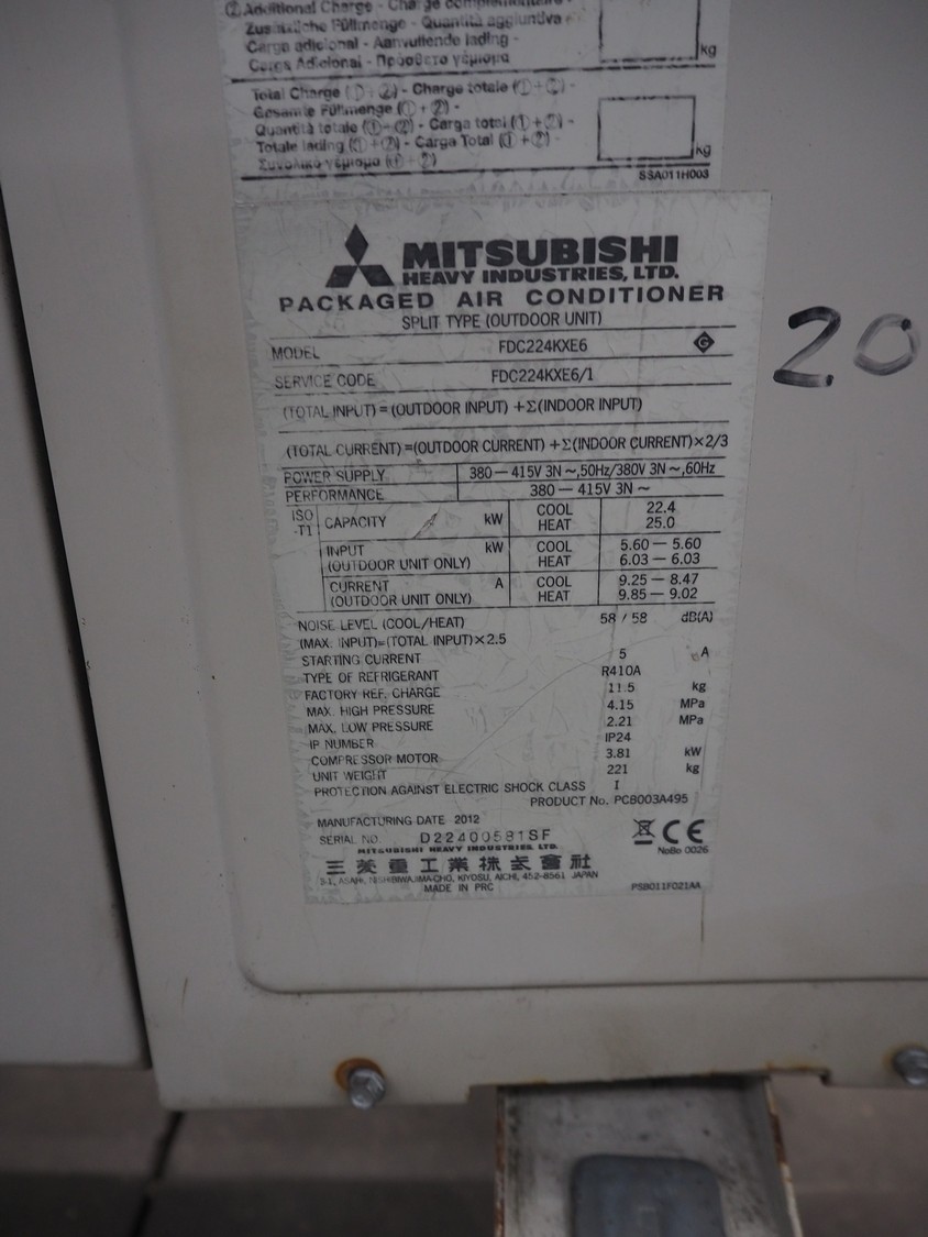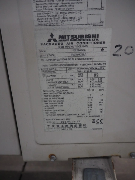 Mitsubishi outside cooling unit, model: FDC224KXE6, serial number: FDC224KXE6/1, refrigerant: R410A, dimensions: 1100 mm x 1500 mm x 2000 mm.