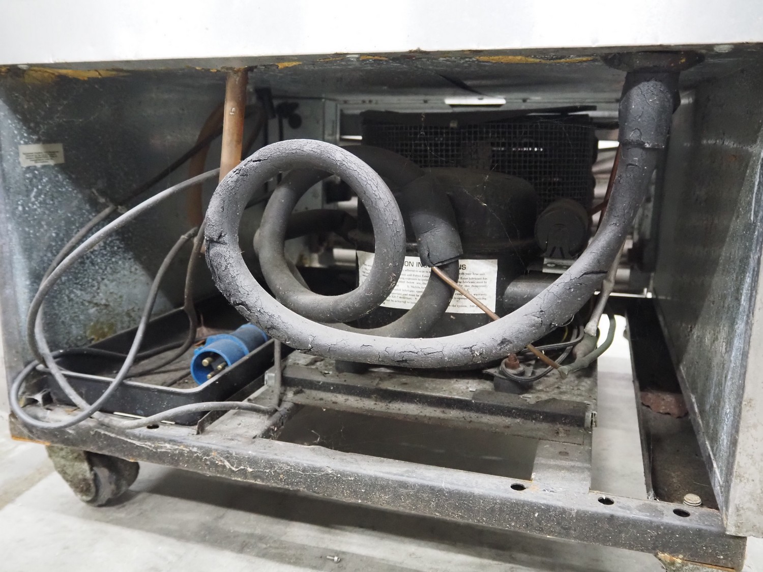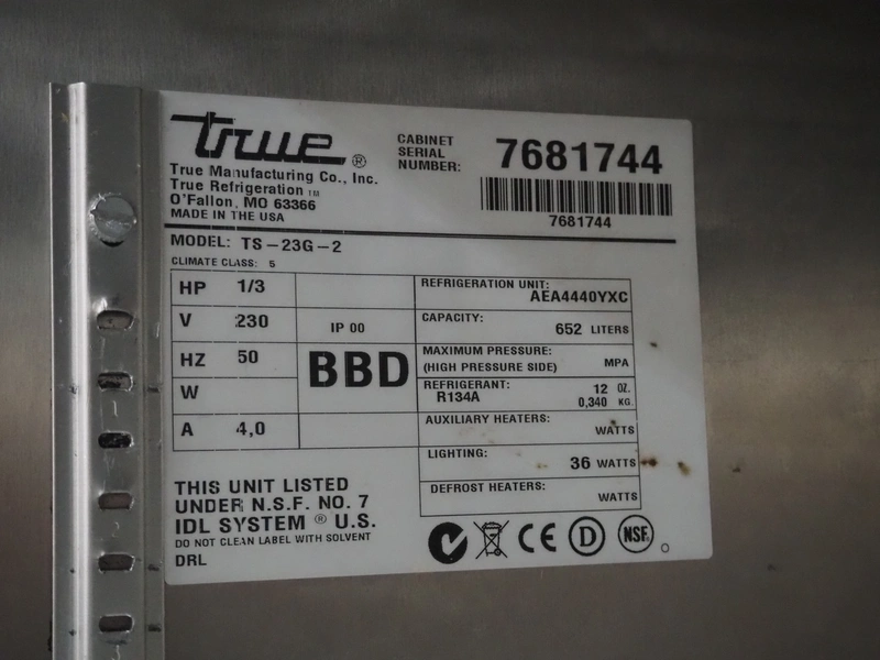 True mobile refrigerator, model: TS-23G-2, serial number: 7681744, 230 V, 50 Hz, 4 A, refrigerant: R134A, 0.34 kg, capacity: 652 liter, floor dimensions: 580 mm x 540 mm, inside dimensions: 600 mm x 610 mm x 1450 mm, total dimensions: 690 mm x 800 mm x 2070 mm.