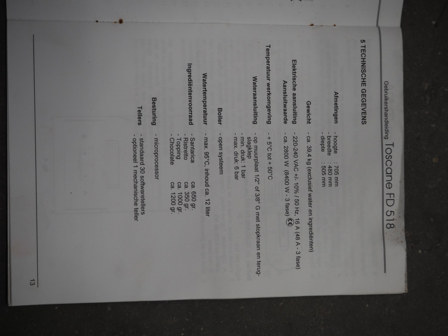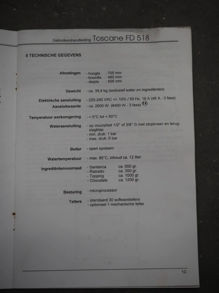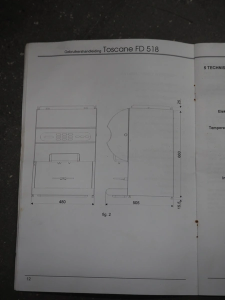 D&T Products coffee machine, type: Toscane FD 518, serial number: 00083482, 230/400 V, 50 Hz, 2.8.8.4 kW, dimensions: 520 mm x 475 mm x 710 mm.