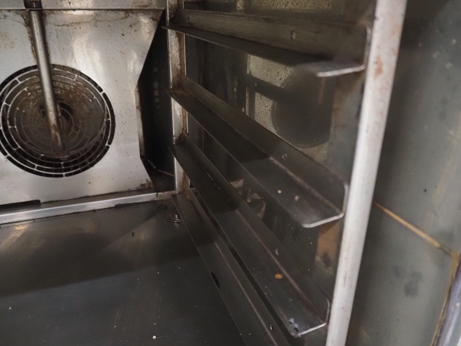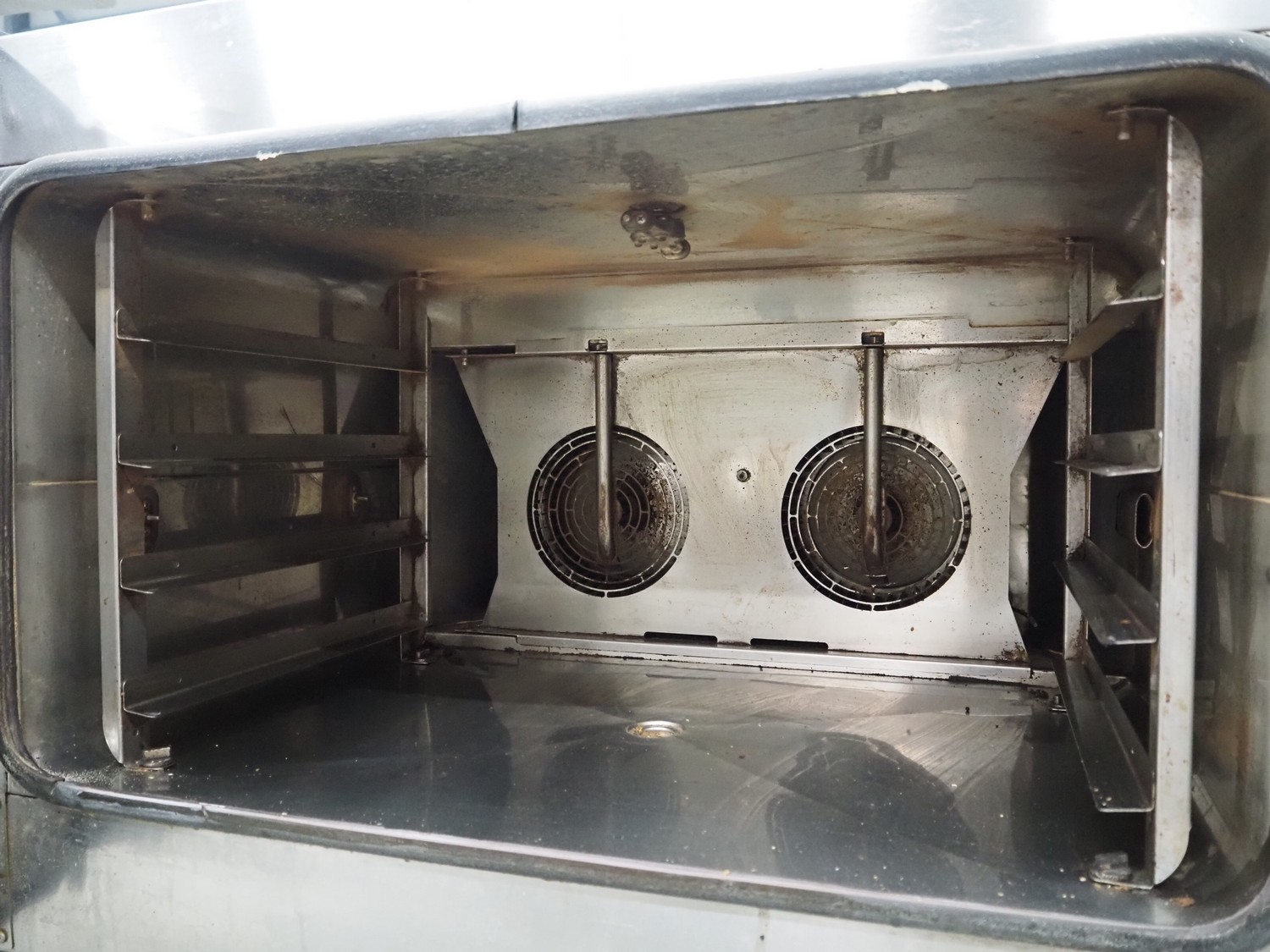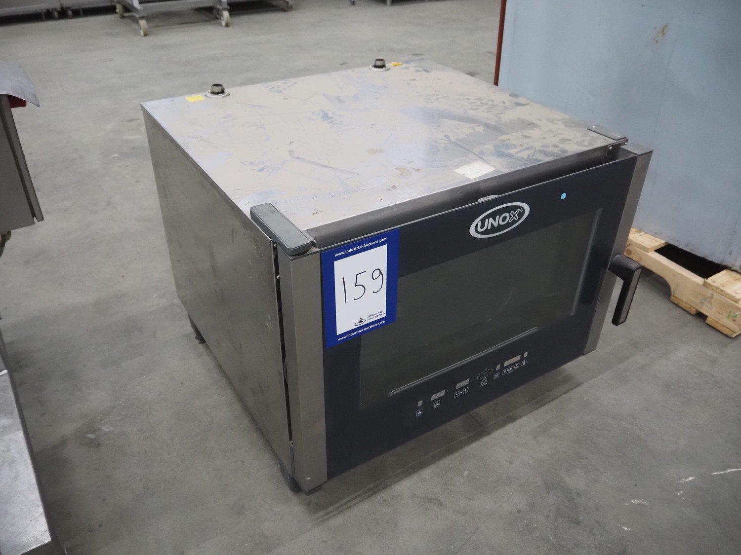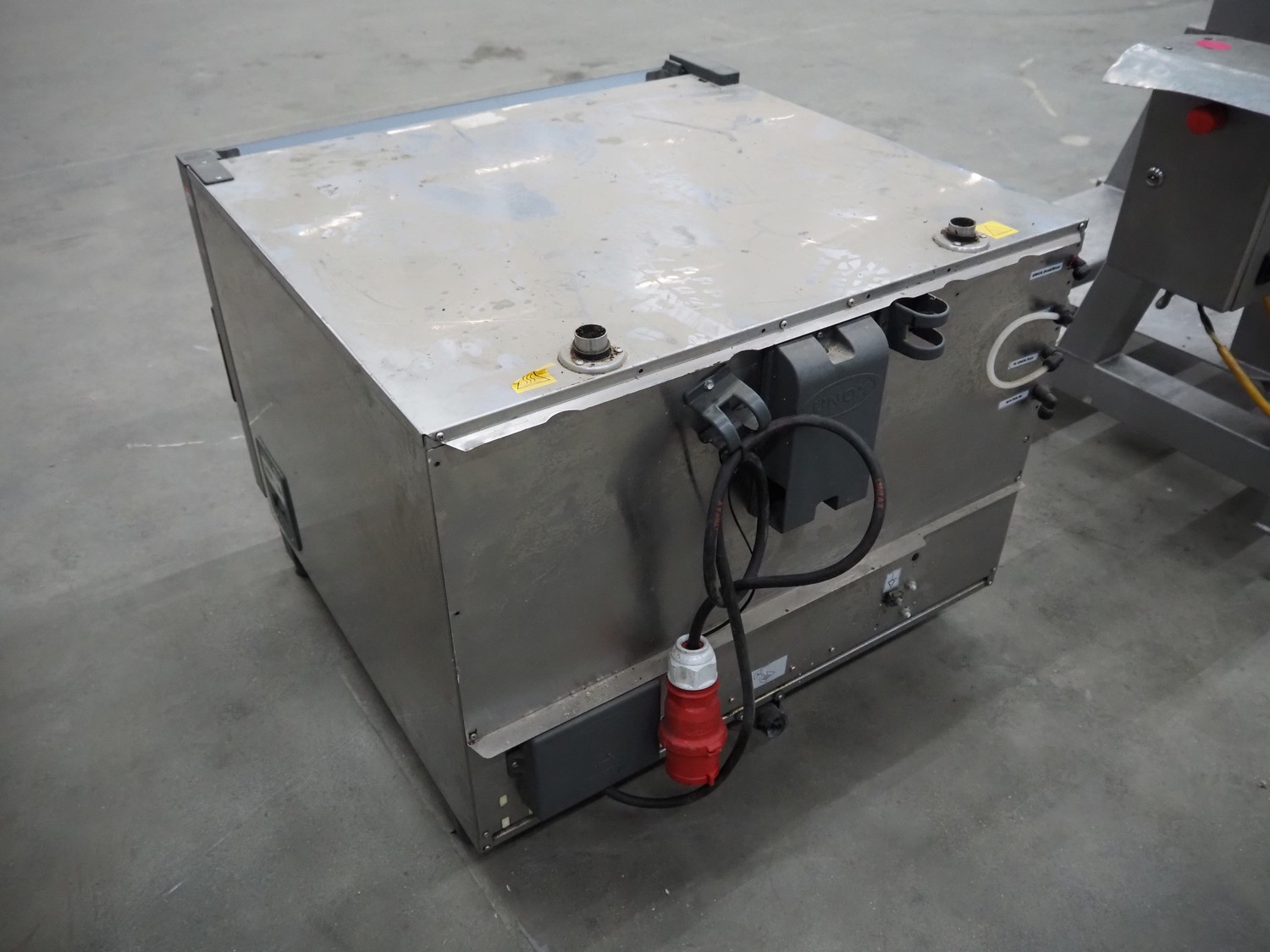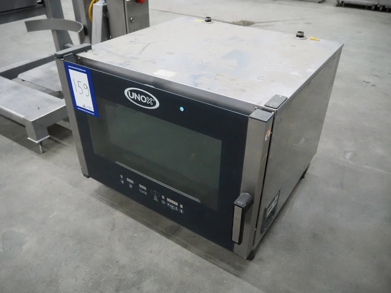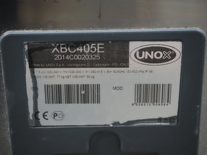 Unox combisteamer, type: XBC405E, serial number: 2014C0020325, 220-240/380-415 V, 1/3 Ph, 50/60 Hz, 7.5 kW, gross weight: 77 kg, net weight: 60 kg, 4 floors, dimensions each floor: 360 mm x 600 mm, total dimensions: 860 mm x 560 mm x 700 mm.