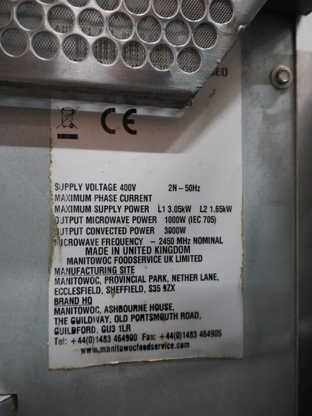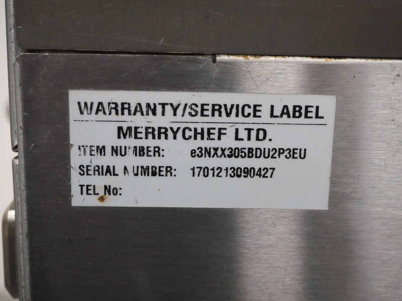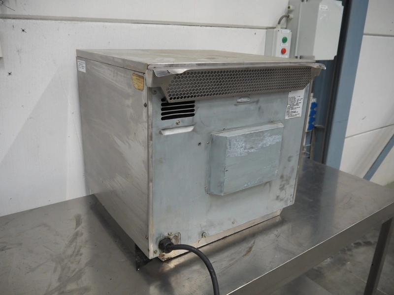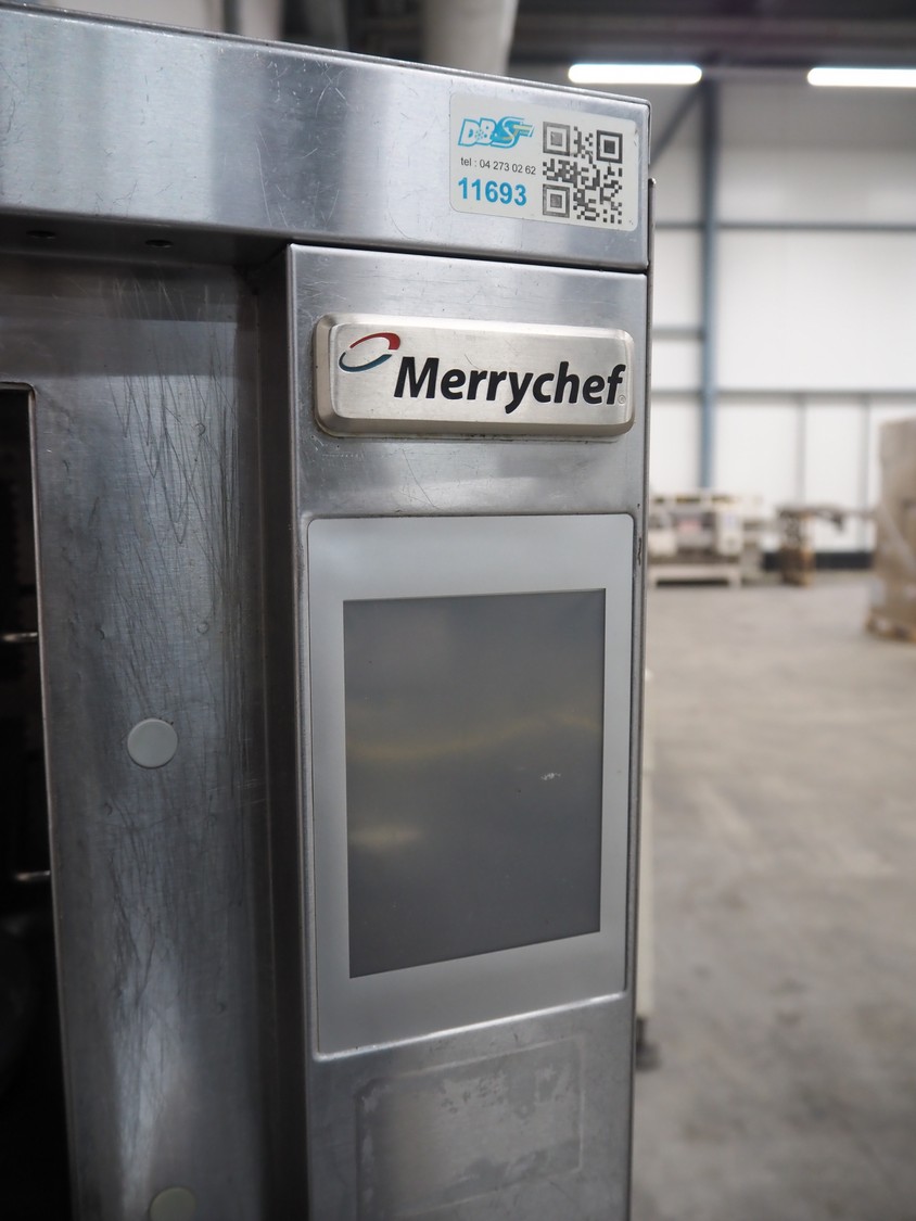 Merrychef turbo oven, model: eikon e3, serial number: 1701213090427, 400 V, 2 Ph, 50 Hz, 2 floors, dimensions each floor: 330 mm x 300 mm, total dimensions: 630 mm x 590 mm x 550 mm.