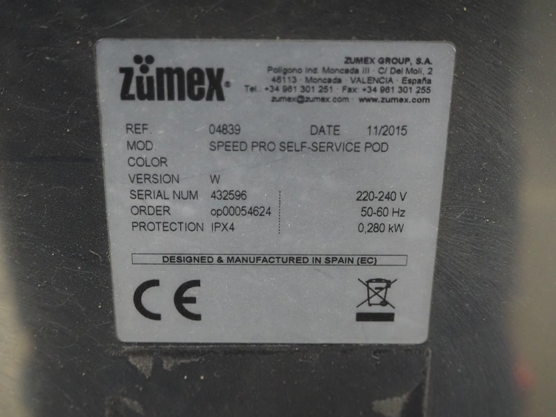 Zumex mobile juicer, model: SPEED PRO SELF-SERVICE, serial number: 432596, year of construction: 11-2015, 220/240 V, 50/60 Hz, 0.280 kW, dimensions: 700 mm x 680 mm x 1750 mm.