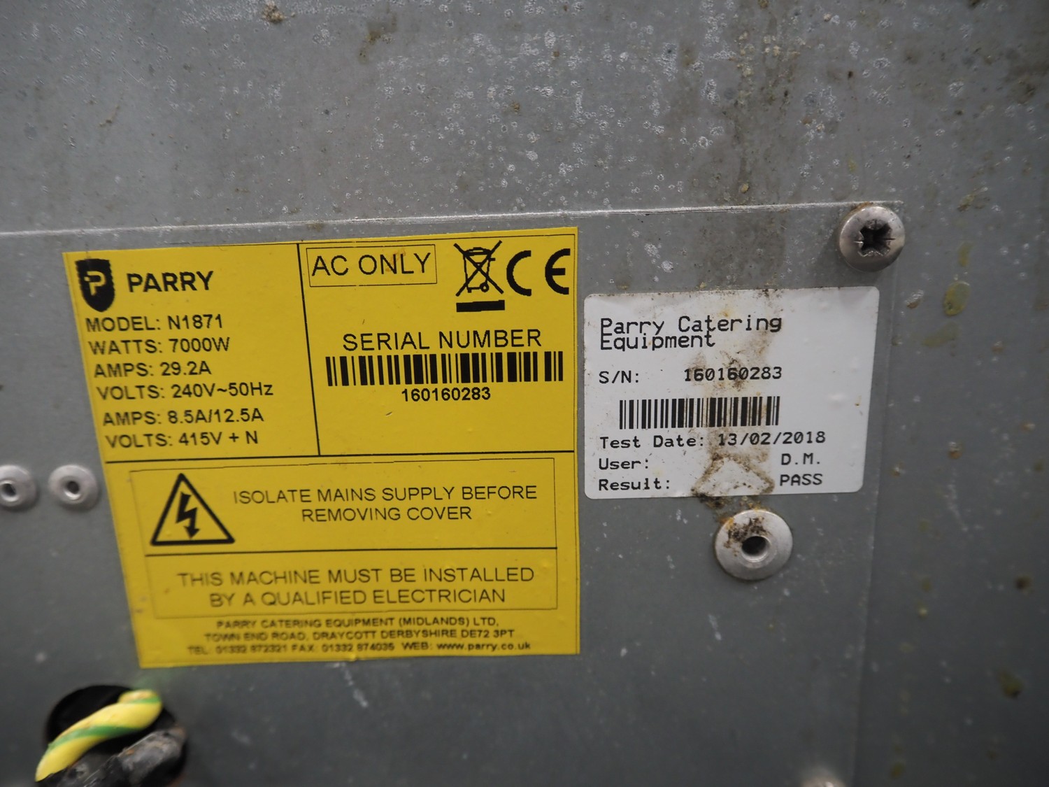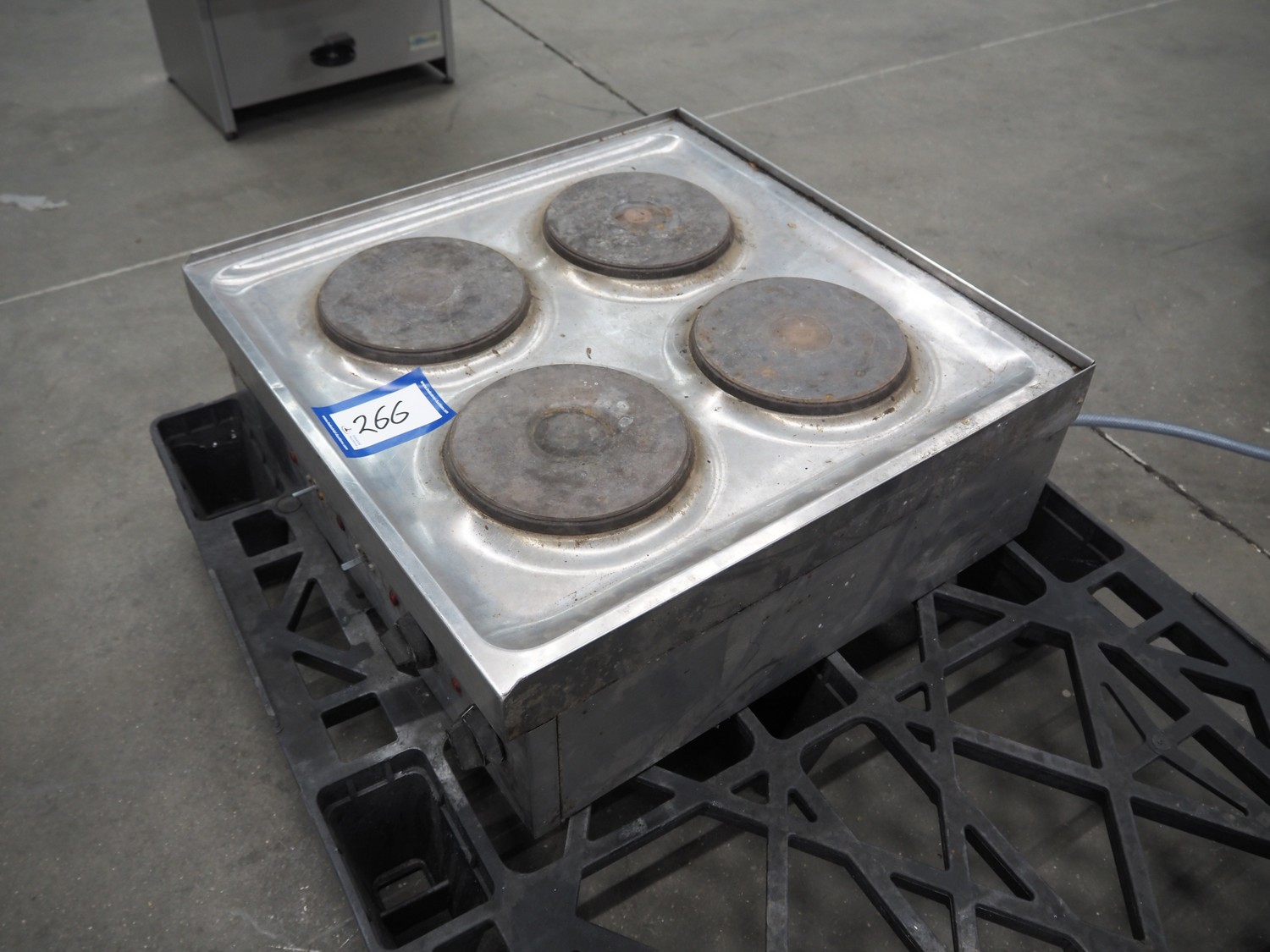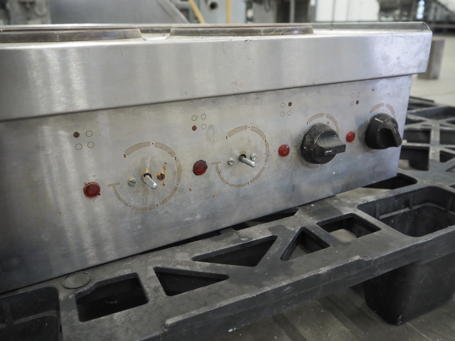 Parry 4 pits stove, model: N1871, serial number: 160160283, 240/415 V, 50 Hz, 8.5/12.5/29.2 A, 7 kW, dimensions: 600 mm x 610 mm x 220 mm. Missing 2 buttons.