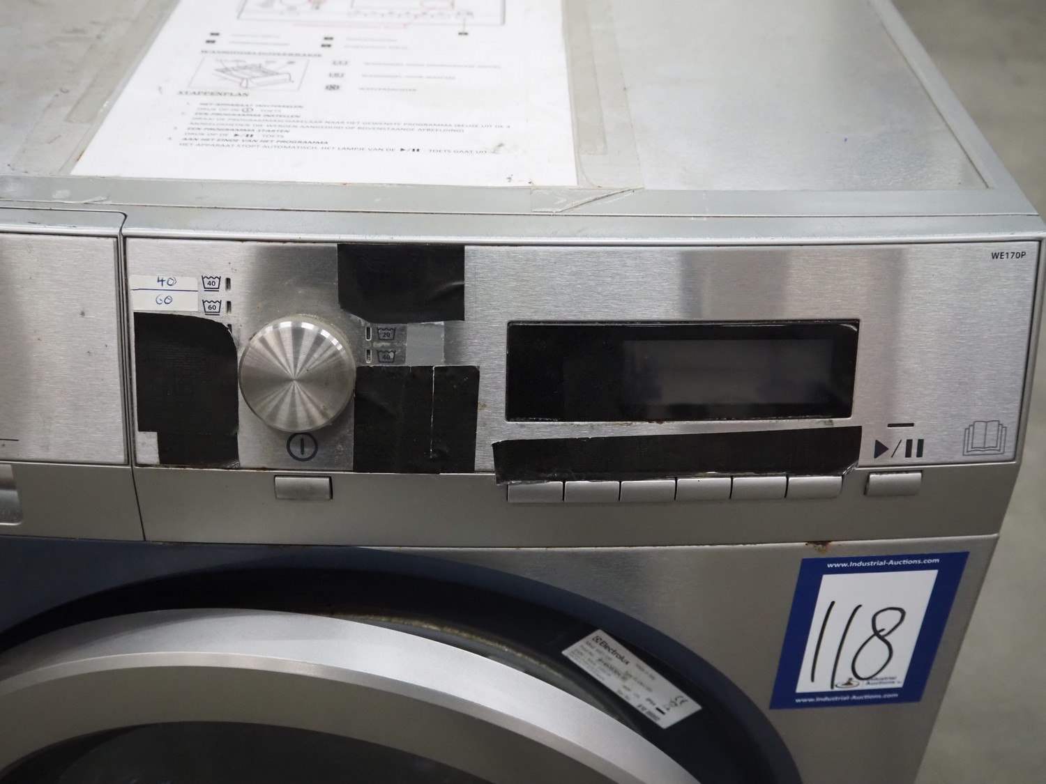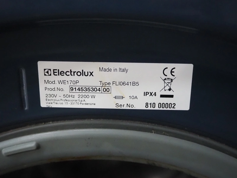 Electrolux washing machine, model: WE170P, type: FLI0641B5, serial number: 810 00002, 230 V, 50 Hz, 10 A, 2200 Watt, dimensions: 600 mm x 625 mm x 850 mm