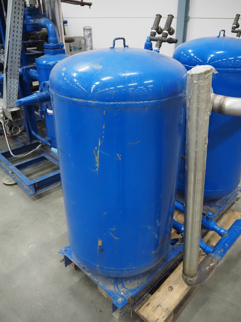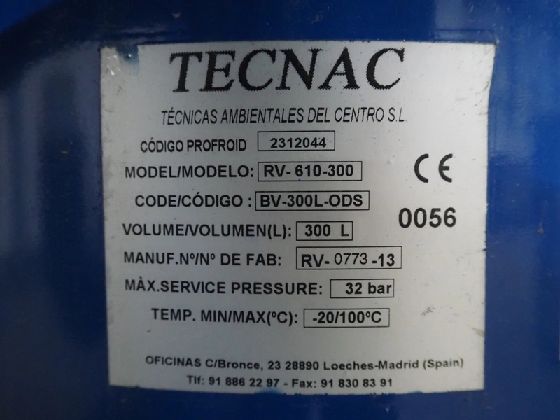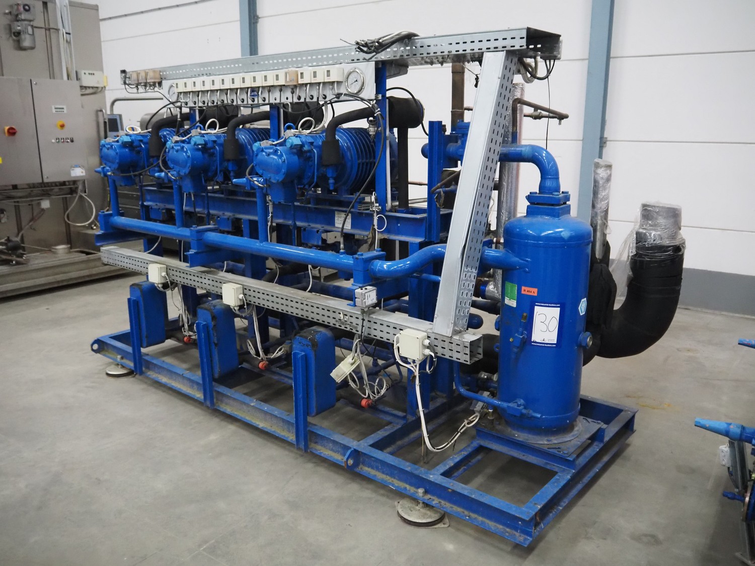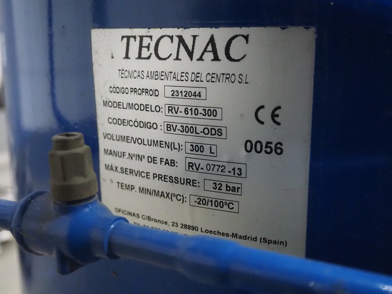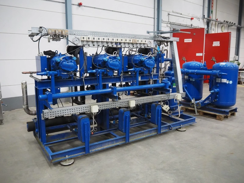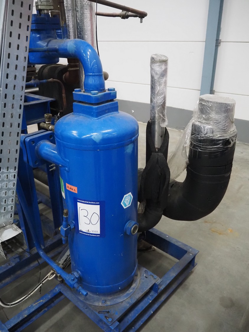Carrier compressor rack with 3 Bitzer Kühlmaschinenbau GmbH cooling compressors, type: (3x) HSK6461-60-40P, serial number: 1079100320, 1079100321, 1079100318, capacity: 165/198 m³ per hour, year of construction: 2013, refrigerant: R404A, dimensions: 3600 mm x 1350 mm x 1970 mm. Including 2 Tecnac liquid receiver, model: (2x) RV-610-300, number: RV-0772-13, RV-0773-13, volume: 300 liter, maximum temperature: -20/100 ⁰C, maximum pressure: 32 bar, dimensions: 1780 mm x 1180 mm x 1580 mm.