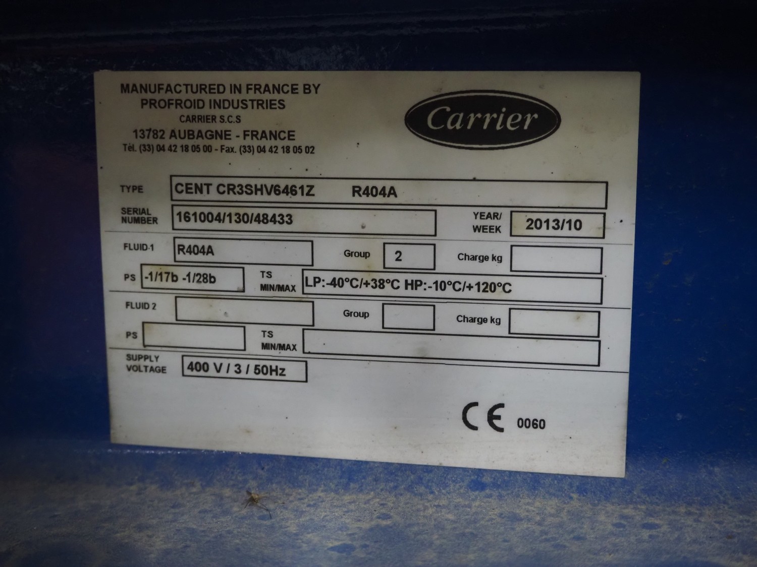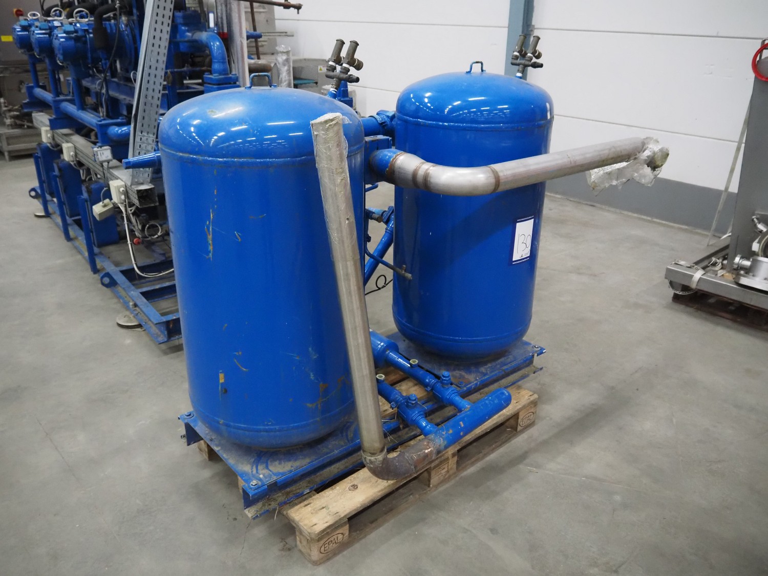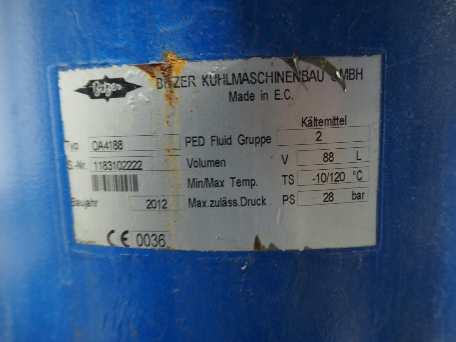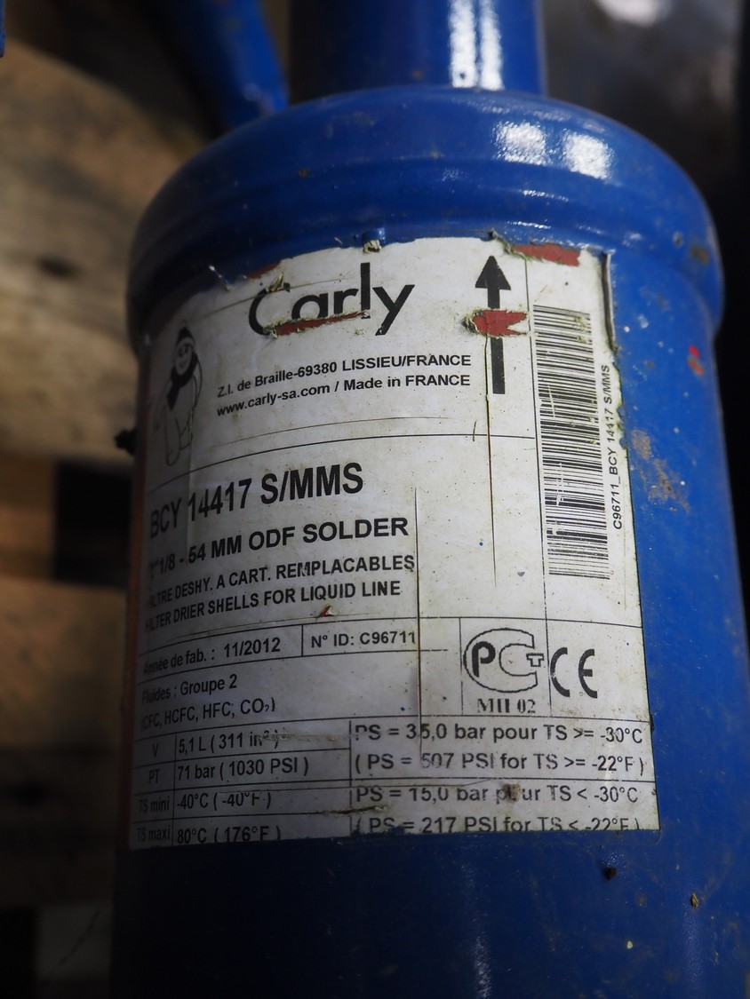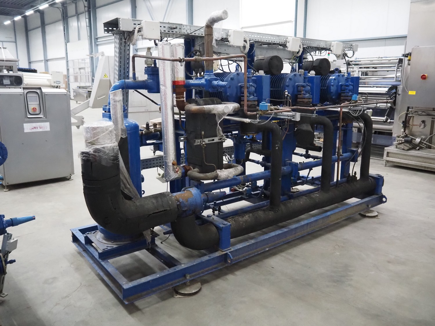 Carrier compressor rack with 3 Bitzer Kühlmaschinenbau GmbH cooling compressors, type: (3x) HSK6461-60-40P, serial number: 1079100320, 1079100321, 1079100318, capacity: 165/198 m³ per hour, year of construction: 2013, refrigerant: R404A, dimensions: 3600 mm x 1350 mm x 1970 mm. Including 2 Tecnac liquid receiver, model: (2x) RV-610-300, number: RV-0772-13, RV-0773-13, volume: 300 liter, maximum temperature: -20/100 ⁰C, maximum pressure: 32 bar, dimensions: 1780 mm x 1180 mm x 1580 mm.