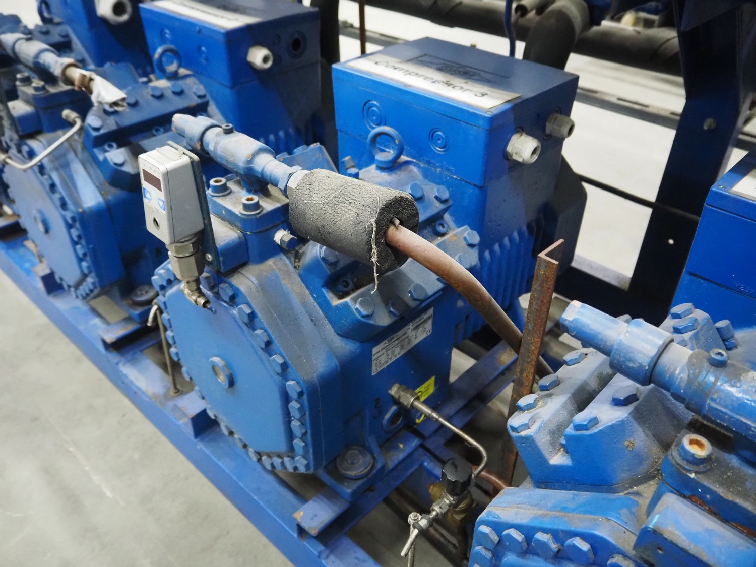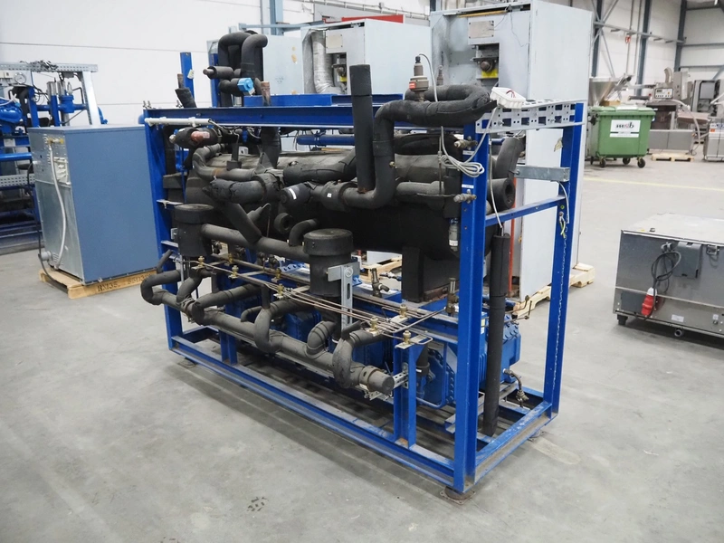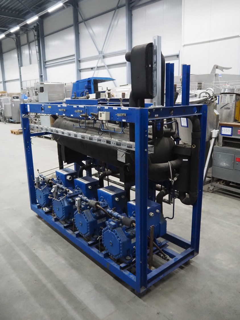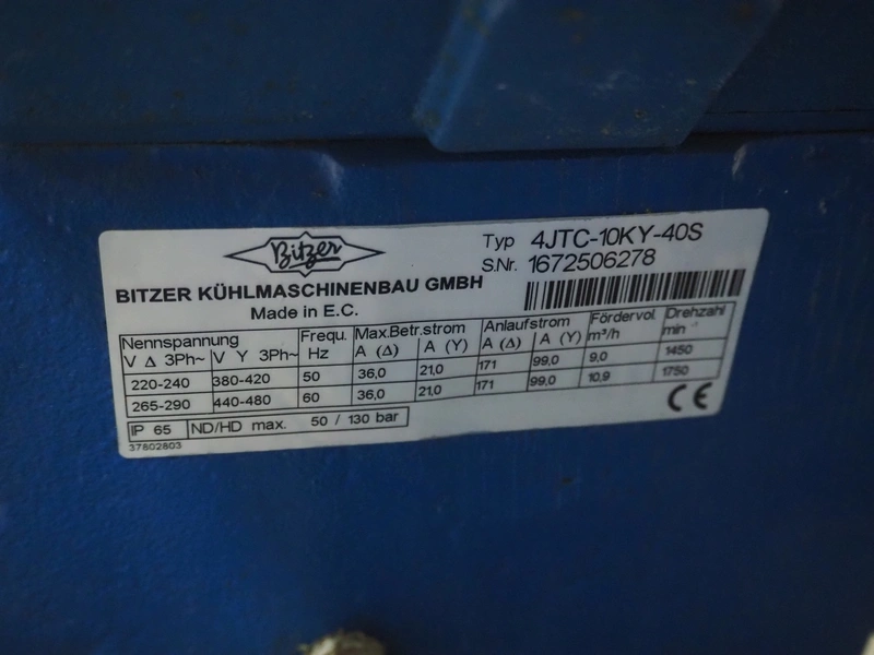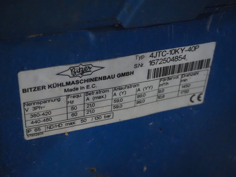 Bitzer Kühlmaschinenbau GmbH compressor rack with 4 Bitzer Kühlmaschinenbau GmbH cooling compressors, type: (3x) 4JTC-10KY-40P, 4JTC-10KY-40S, serial number: 1672506278, 1672504853, 1672504854, 1672504851, capacity: (4x) 9/10.9 m³ per hour, dimensions: 2200 mm x 1150 mm x 1950 mm.