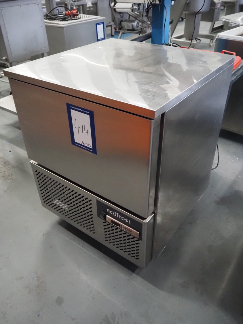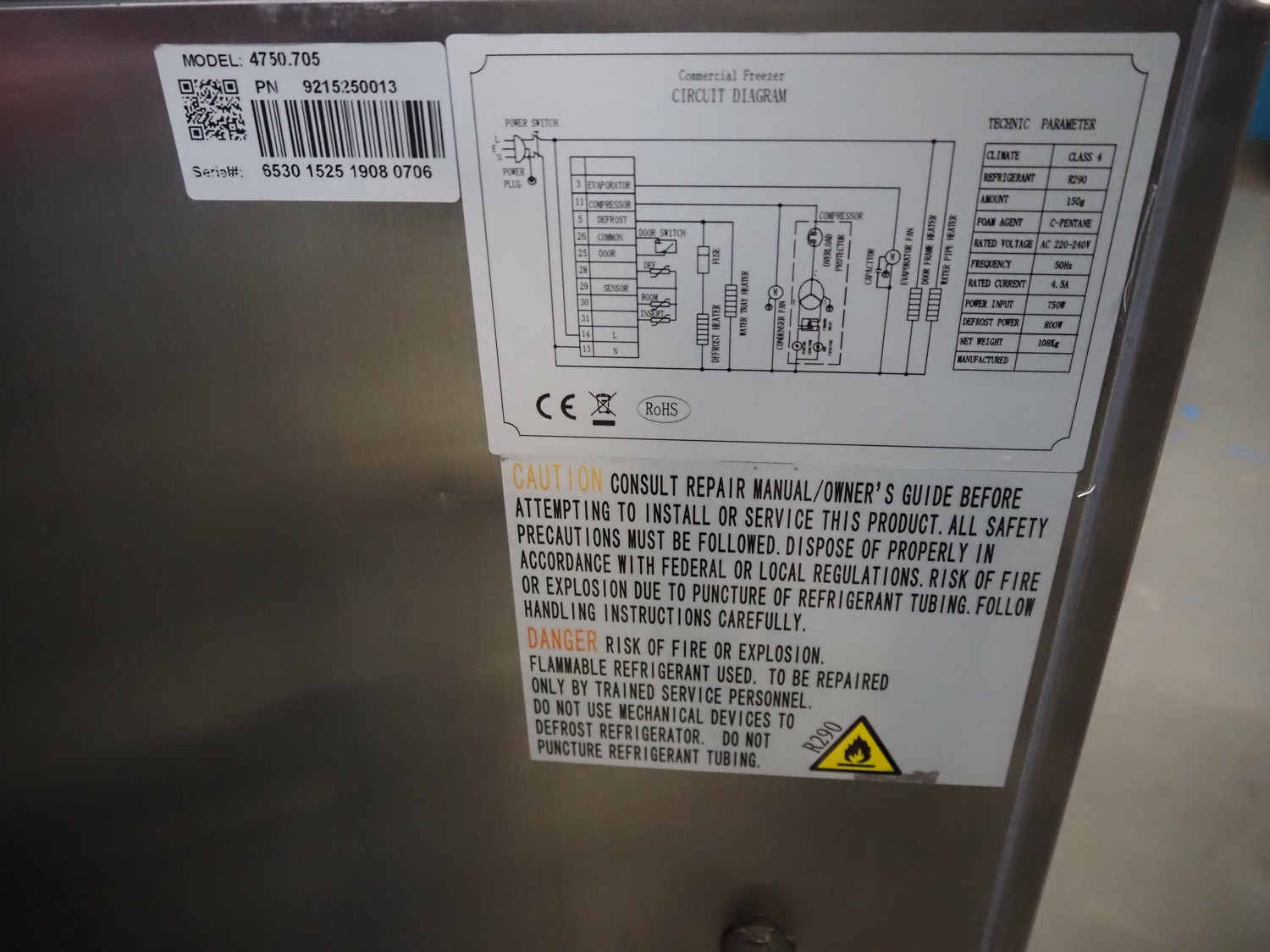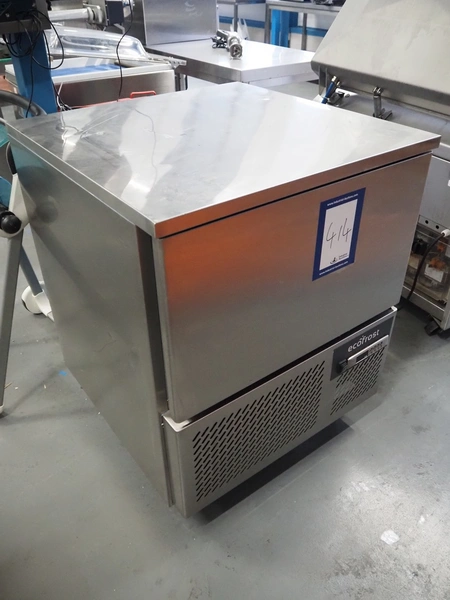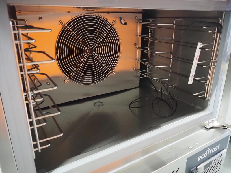 Ecofrost blast chiller, model: 4750.705, serial number: 6530 1525 1908 0706, 220/240 V, 50 Hz, 4.5 A, 750 W, weight: 108 kg, refrigerant: R290/250g, 5 floors, dimensions each floor: 600 mm x 370 mm, total dimensions: 800 mm x 800 mm x 1000 mm.