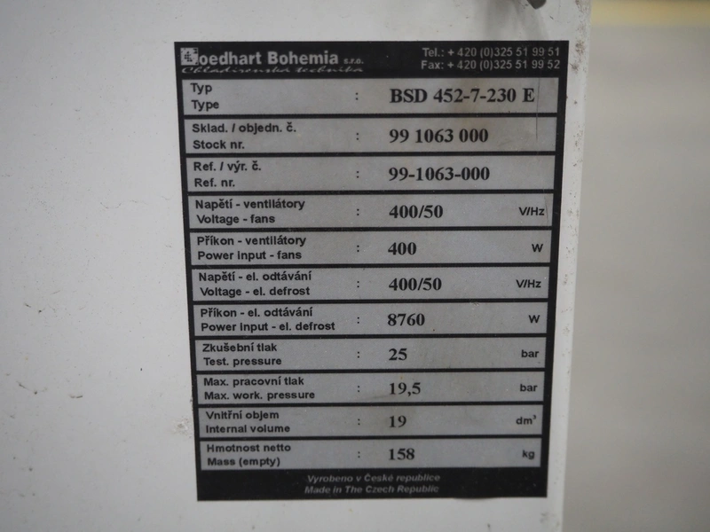 Goedhart Bohemia evaporator, 2 fans, type: BSD 452-7-230 E, number: 99 1063 000, 400 V, 50 Hz, 8760 W, maximum work pressure: 19.5 bar, weight: 158 kg, dimensions: 2200 mm x 1050 mm x 550 mm.