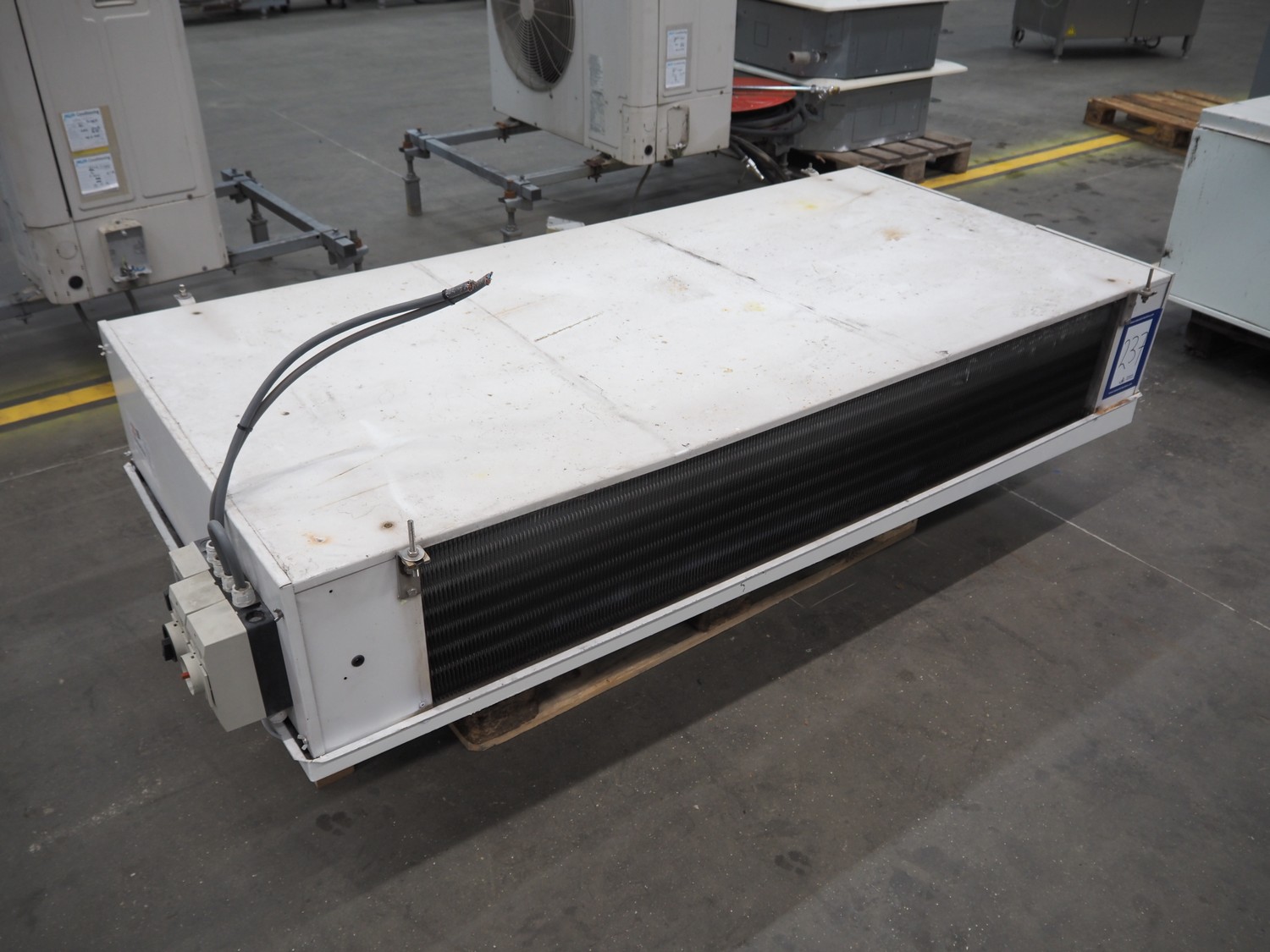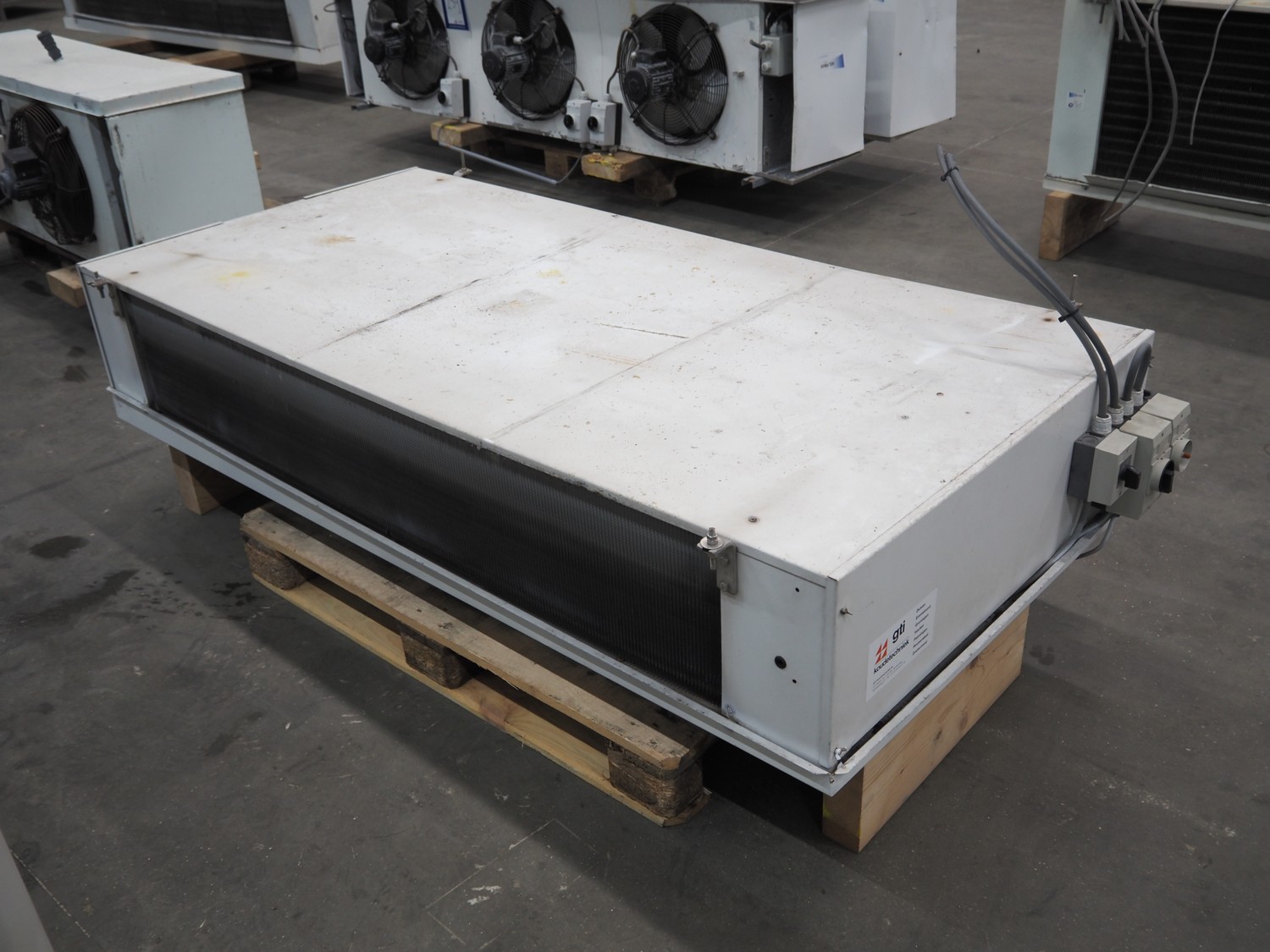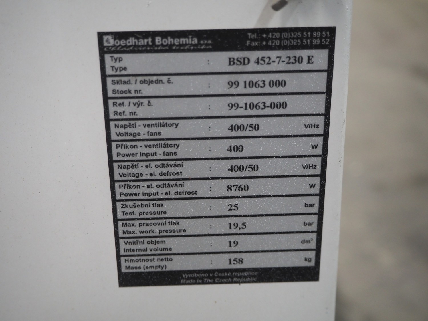 Goedhart Bohemia evaporator, 2 fans, type: BSD 452-7-230 E, number: 99 1063 000, 400 V, 50 Hz, 8760 W, maximum work pressure: 19.5 bar, weight: 158 kg, dimensions: 2200 mm x 1050 mm x 550 mm.